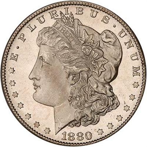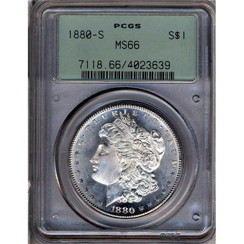 1880-S Morgan Dollar. The silvery White hue reciprocates between levels of frost and satin-texture on your typical 1880-S, one of the best struck dates in the entire series. Lustrous and well struck with rocking-fresh surfaces, the color is iridescent and a nice blend that should attract bids from near and far. (#7118)