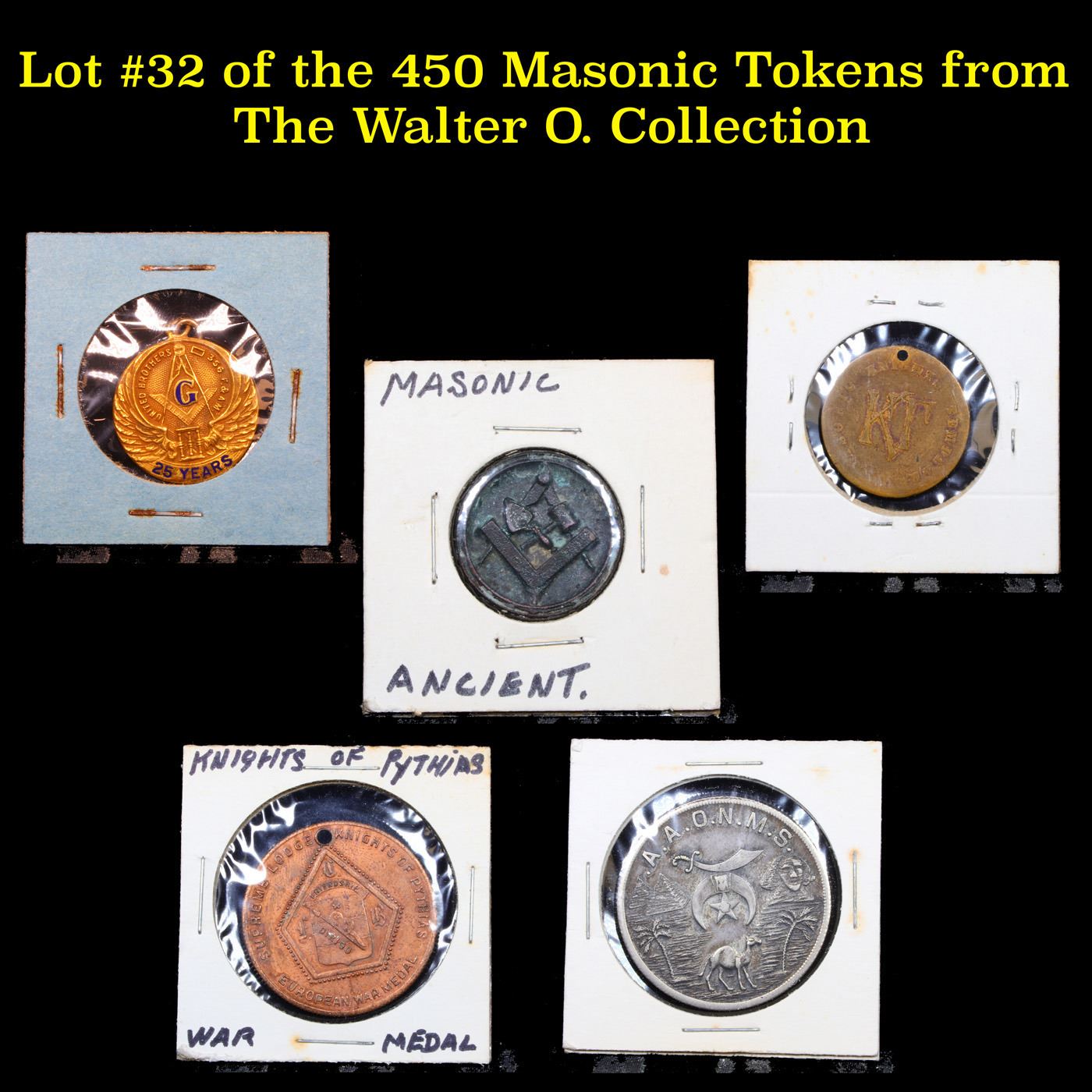 Lot #32 of the 450 Masonic Tokens from The Walter O. Collection. We Recently received a very Large Collection of 450 Masonic Tokens and coins. This collection was one man’s hobby for over 40 years. He collected each and every one with care and attention to detail and variety. Some of them are amazing and incredibly rare and highly sought by collectors and Masons. Here is a Brief Overview : Masonic coins often raise many questions for those looking to better understand the significance of the coins themselves as well as the symbolism represented in their imagery. In fraternal culture as a whole, symbolism has always been a significant part of these organizations’ identity, especially in Freemasonry, as Masonic coins are rich with symbolism, reflecting different events and characteristics of Freemasonry that give them the priceless value they hold. There are several varieties of masonic coins and tokens, and all tokens will fall into one of the following categories: a token celebrating a particular mason, lodge or event; an initiation token showing when a Brother was initiated, passed and raised; and finally the mark mason token (or penny) which signifies a pivotal part of a Mason’s initiation. Because symbolism was so important to fraternal culture, these small coins are rife with meaning. The most ubiquitous representation of the Masons was the letter "G" surrounded by a compass and square, representing the holy geometry of God. Some tokens feature the letters "H.T.W.S.S.T.K.S.," which means "Hiram the Widow's Son Sent to King Solomon," the biblical story that must be acted out to reach the third, or Master's Degree, in Freemasonry. Additionally, many contain either Apron and gloves: These symbols stand for living with a pure heart and to keep one’s hands clean. All-seeing eye: This symbol is designed to remind Masons that God and others always see their thoughts and actions. Ashlars: You may see rough and smooth ashlars on Masonic coins. They are to remind Masons of the contrast between man’s natural state and perfection and the Level: This symbol found on some Masonic coins reminds Masons that everyone is equal before God. We have broken the set up into groups of 5 Tokens in each lot. We have put 5 Lots per night over the 18 Nights of the Spring Auctions.