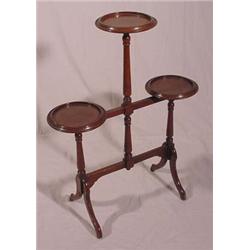 ca. 1890. This plant stand does have some repaired damage on one side of the base. Finely turned and constructed with original finish. In good condition. A fine decorator accessory. Probably American. It stands 32.5"h x 25.5"l and the base is 11"w. Est. $100 - $200.