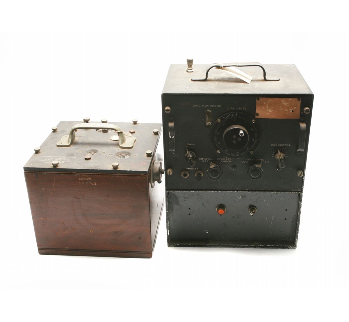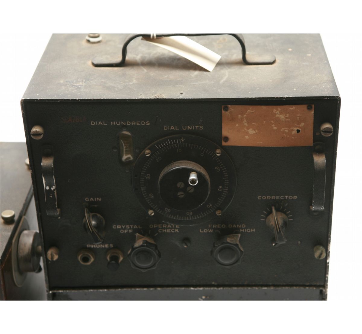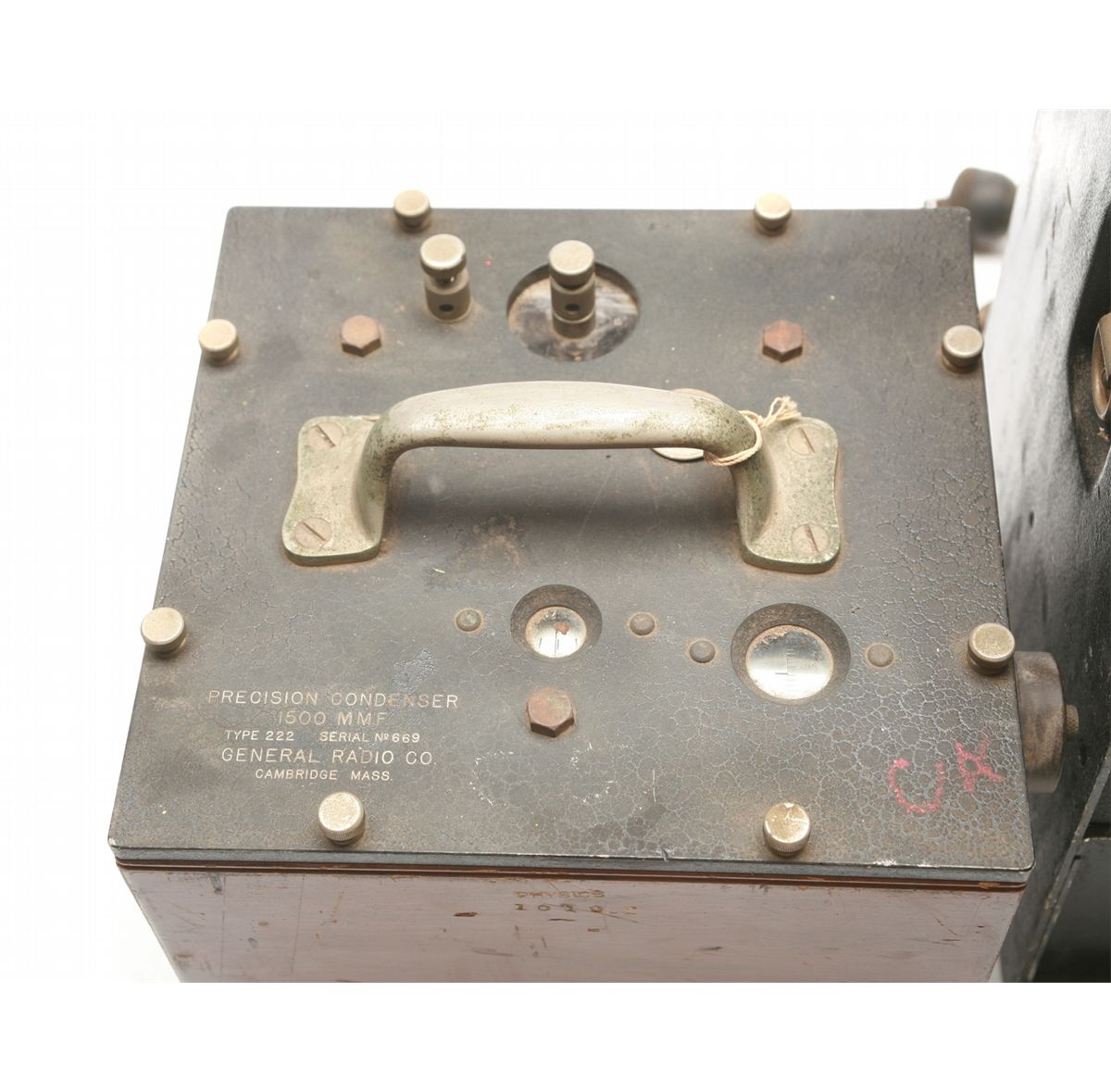 Vintage unmarked radio Model SG4781A & General Radio Company Precision Condenser marked 1500 MMF Type 222 serial # 669 - with heavy wear to body on radio - face marked Dial Hundreds, Dial Units, Gain, Crystal off, Operate Check, Freq. Band Low/High & Corrector - phone jack - top mounted antenna post - non-ffl - 25JJJCEKS003