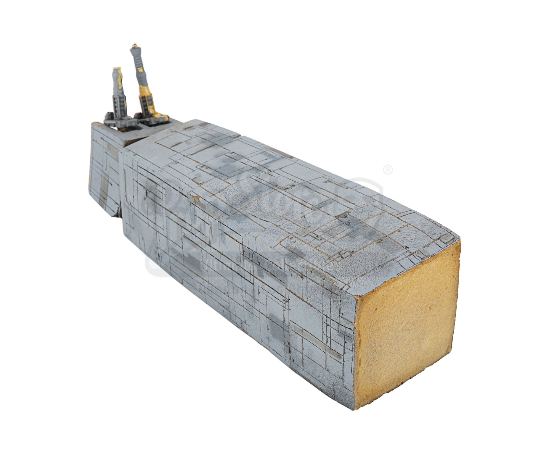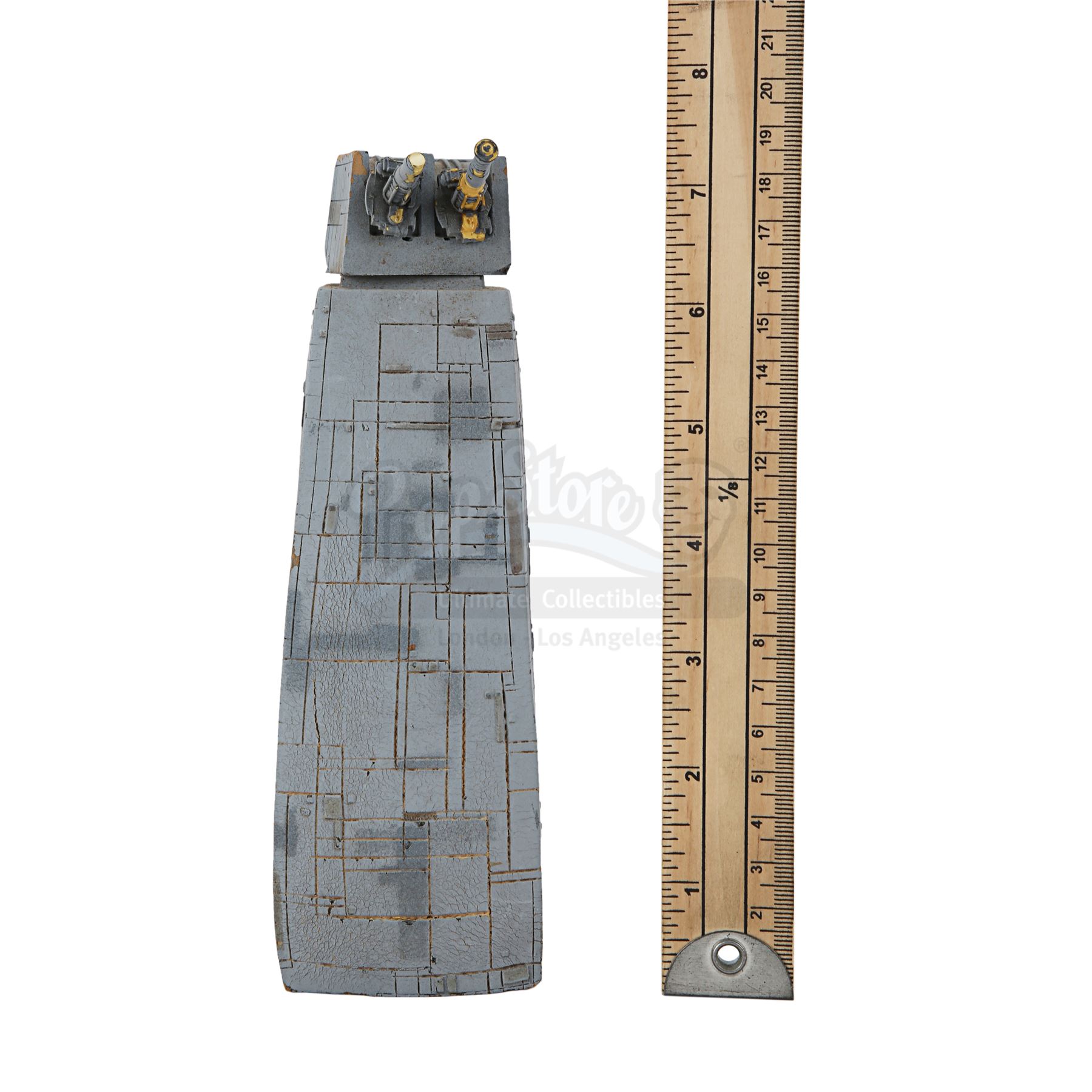 This lot will be auctioned on Tuesday, June 29th. The auction will begin at 9:00am PDT and lots are sold sequentially via live auctioneer; tune in to the live streaming broadcast on auction day to follow the pace. Note other lots in the auction may close on June 30th or July 1st. A Death Star Gun Tower Model Miniature from Richard Marquand's Star Wars: Return of the Jedi. Gun towers covered the Death Star's surface and constantly fired at the attacking Rebel pilots during the film's climax. Constructed by Industrial Light and Magic from biscuit foam and resin, the gray painted gun tower features a futuristic industrial design with grid lines carved into the sides to simulate a paneled construction. While static, the top portion of the gun tower is shaped to resemble a rotating gun turret and has two laser cannons mounted at the top. Below the turret, the body of the gun tower stretches to a wider base for stability. The model remains in overall good overall condition, with wear and chips to the paintwork and damage to the gun tips. Dimensions: 2.75" x 2.25" x 7.5" (7 cm x 6 cm x 19 cm) Estimate: $12,000 - 16,000