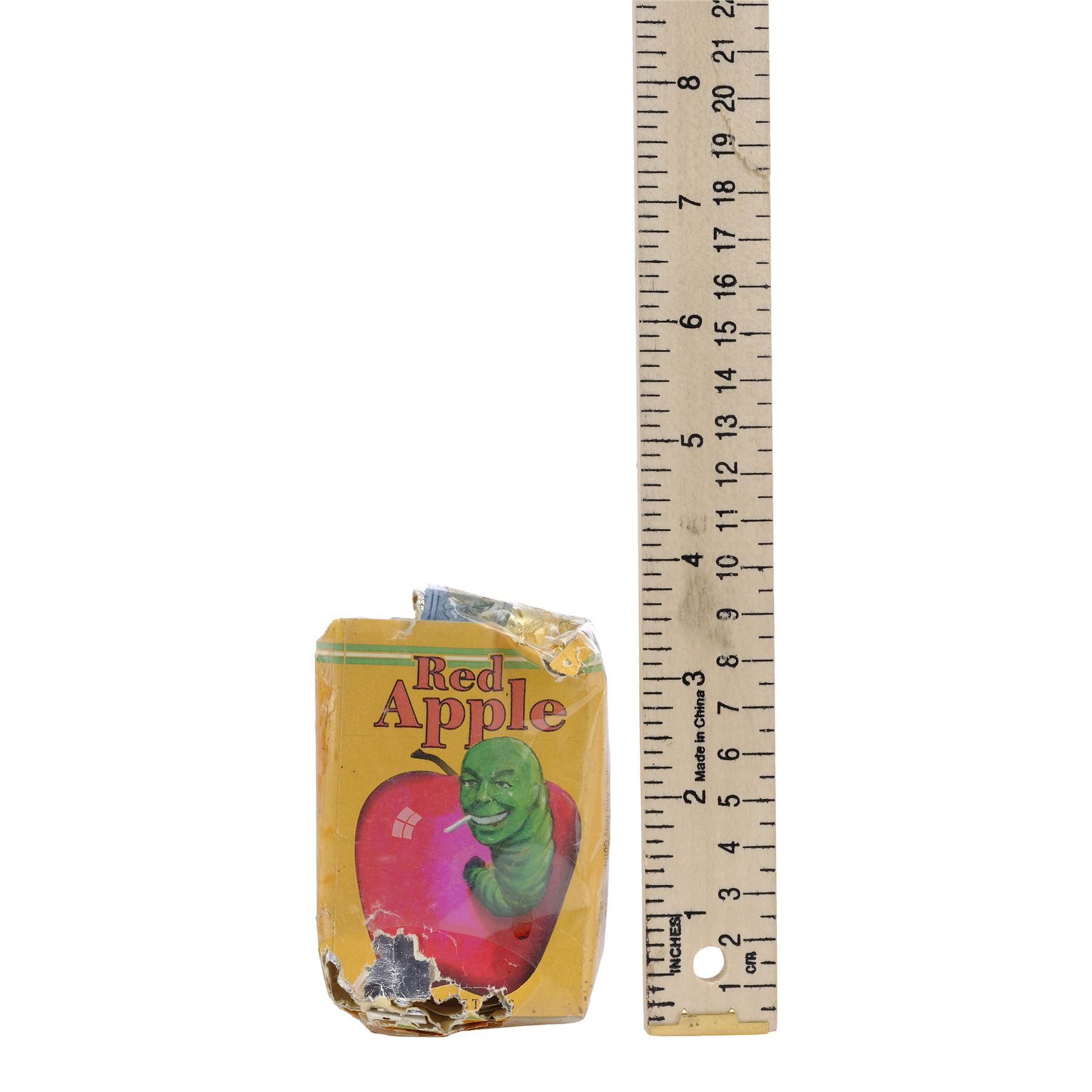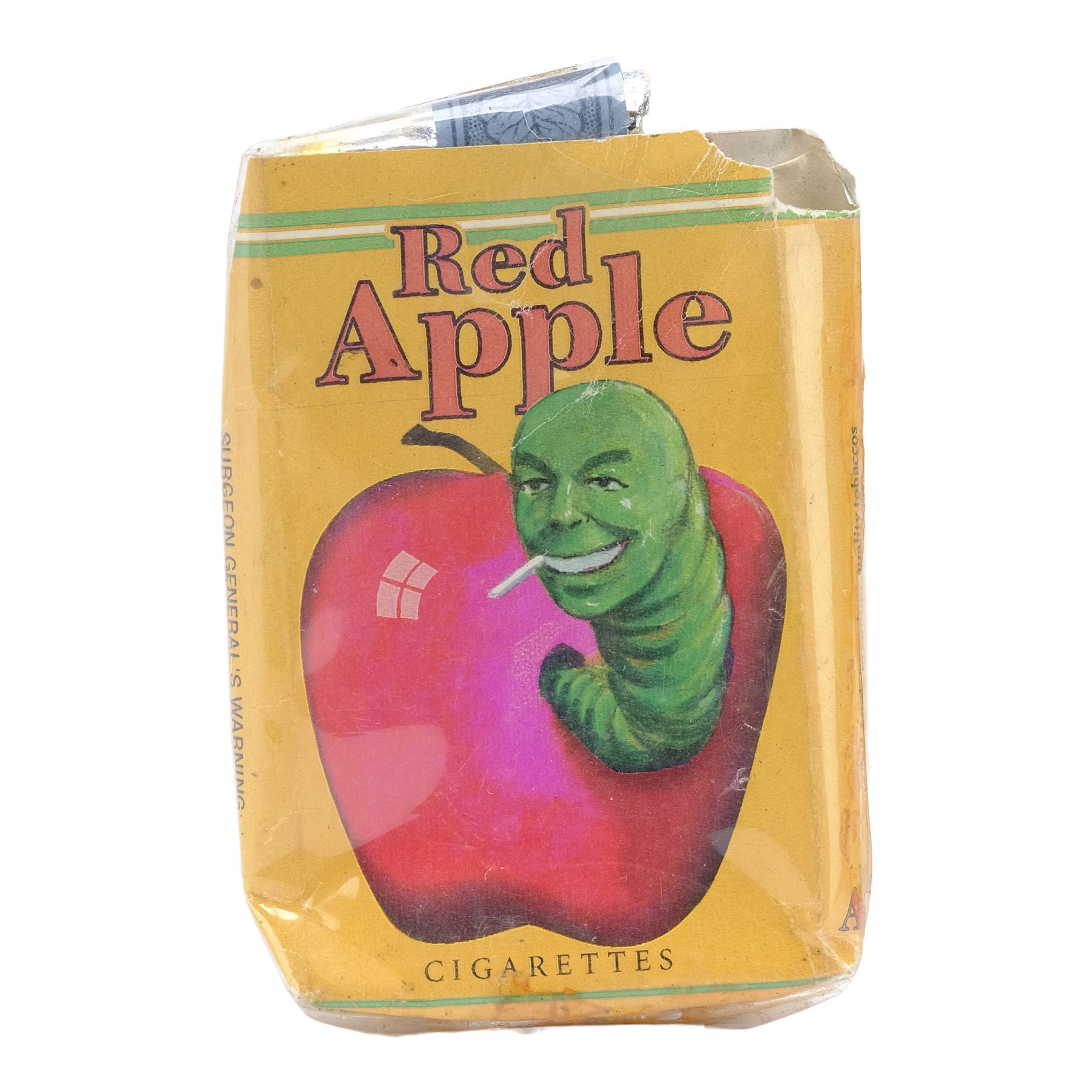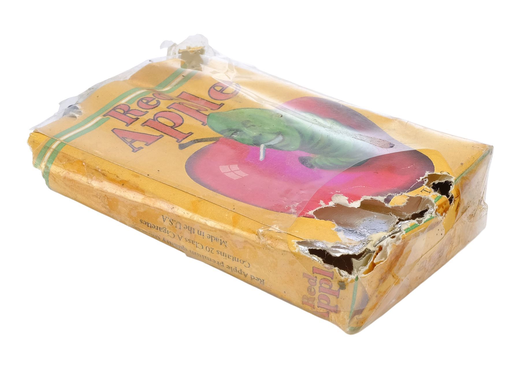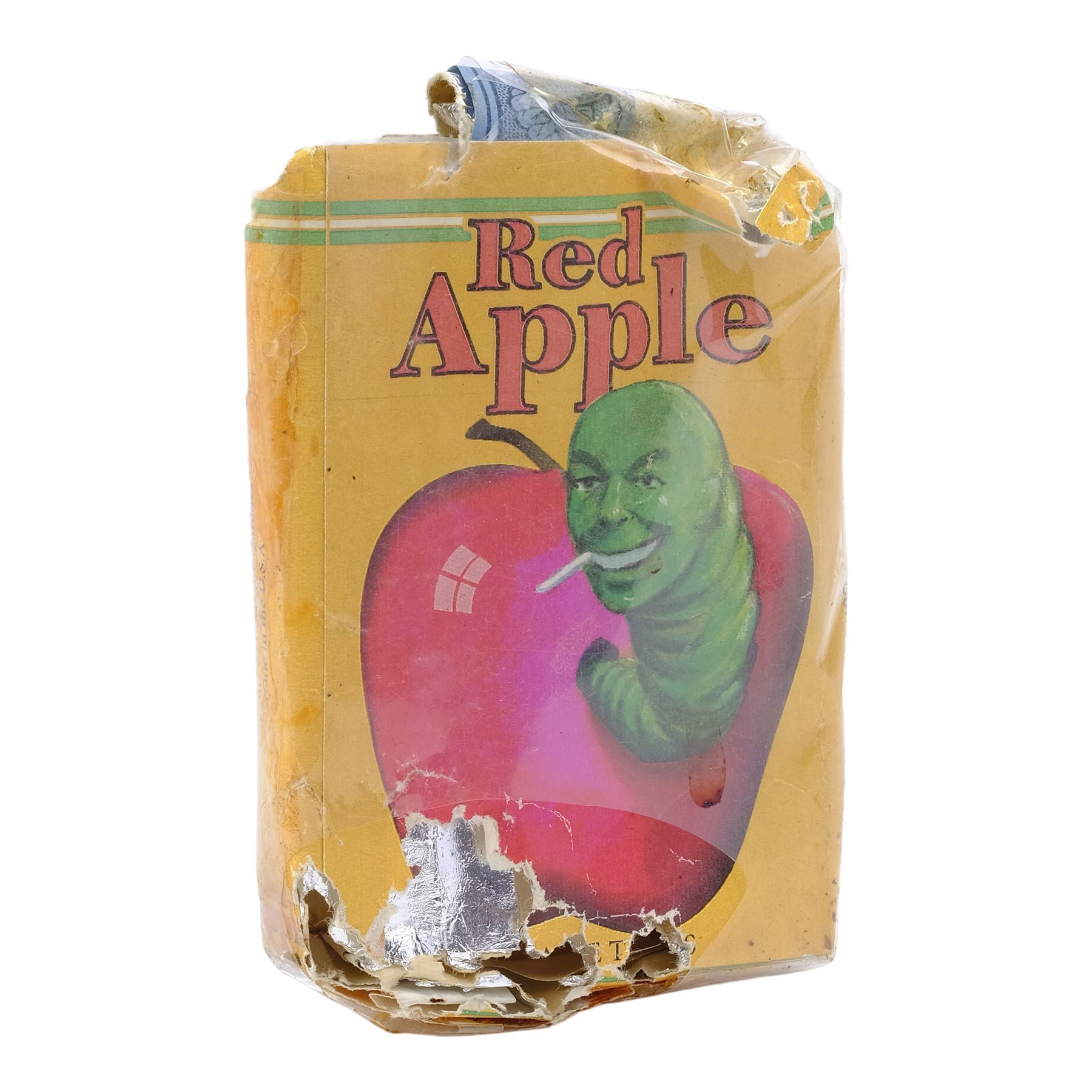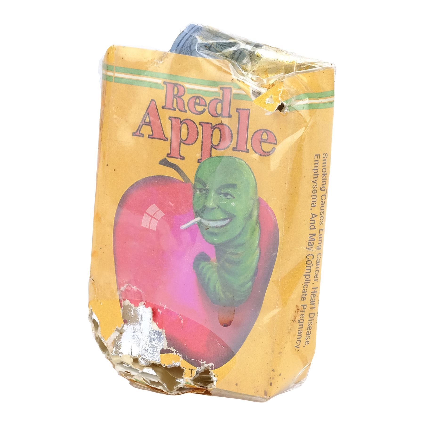 This plastic-wrapped paper and foil carton featuring a label depicting a cigarette-smoking green worm protruding from a red apple comes from the collection of the film's on-set dresser McPherson O. Downs. It is intentionally distressed by production with tears and holes throughout. Dimensions: 3.25" x 2.25" x 0.75" (8.5 cm x 5.5 cm x 2 cm)