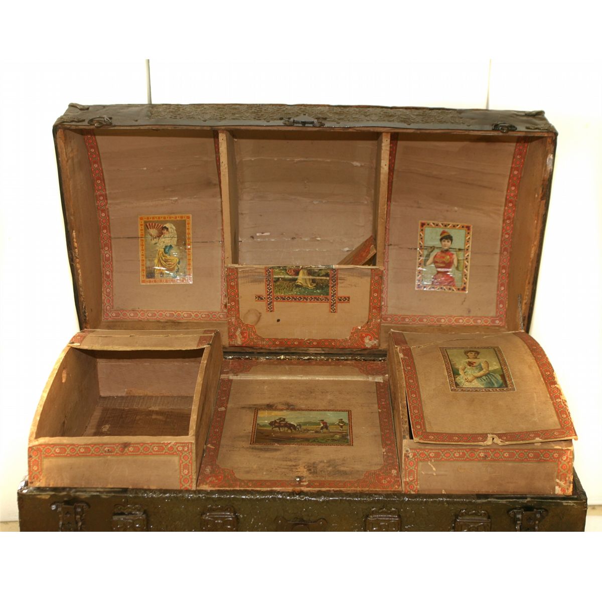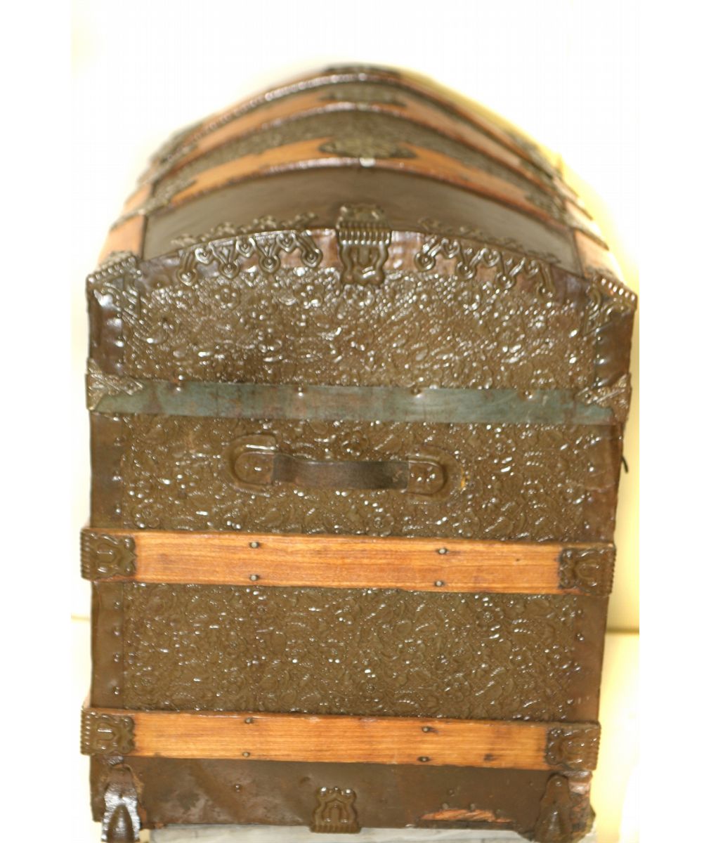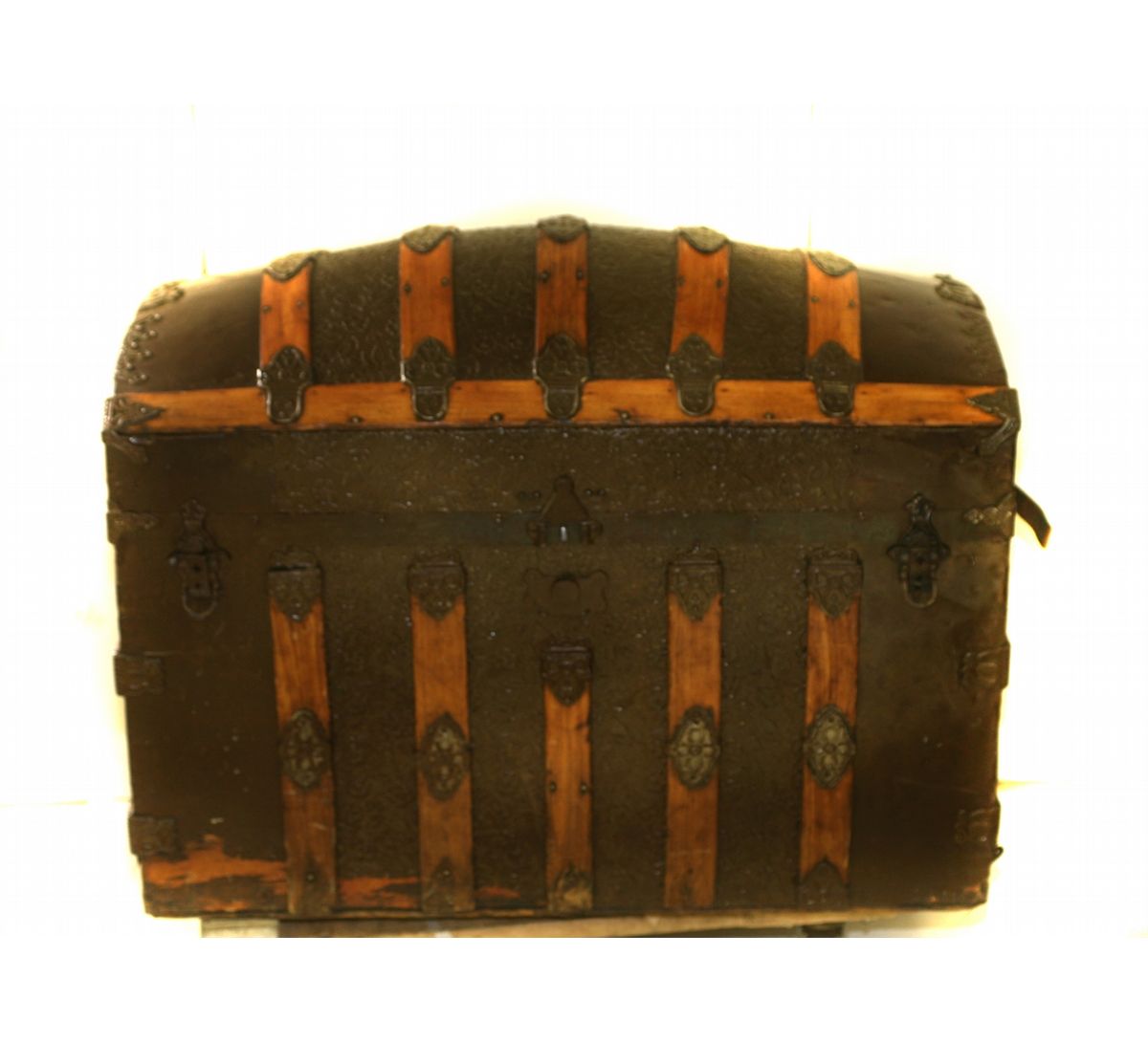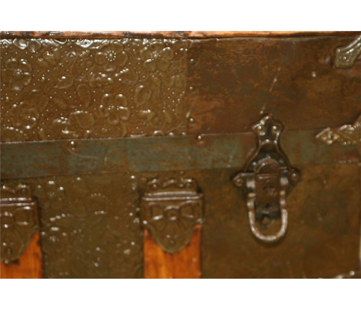 Vintage mid 1800's period barrel round top steamer trunk with lid compartments - handcrafted floral design relief panels with smooth metal panels on lid & sides - five vertical wood slats on front & back & lid - two wood slats on sides - steel corner & side brackets - steel latches with center lock missing - missing metal covering at bottom right front corner - all metal has nice brown patina - damaged to rear right corner bracket - lid has center storage compartment with damaged cover - wood top tray has two inside tray compartments with one complete with some warping & other missing 3/4 of cover - center flat compartment in good condition with lid - vintage color prints with red scrolled trim - large main wood interior compartment - brown color steel with oak finish wood - 36"x24"21.5" - Local Pickup Preferred - Freight - non-ffl - 25GGGMAKS001