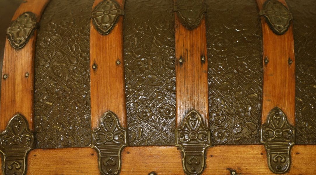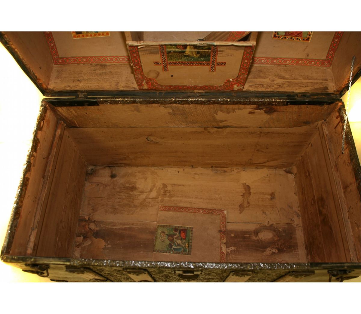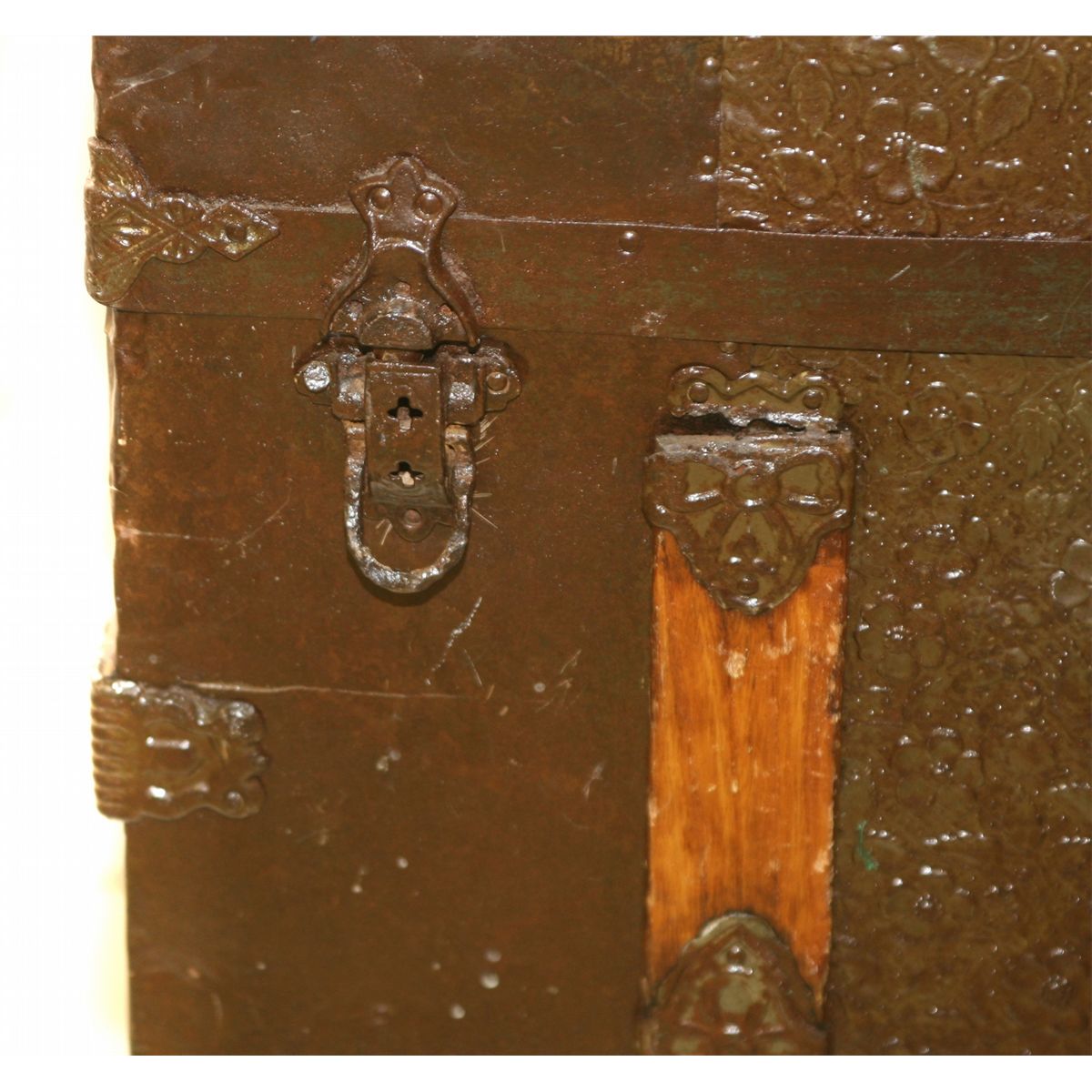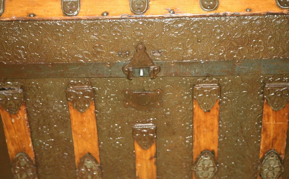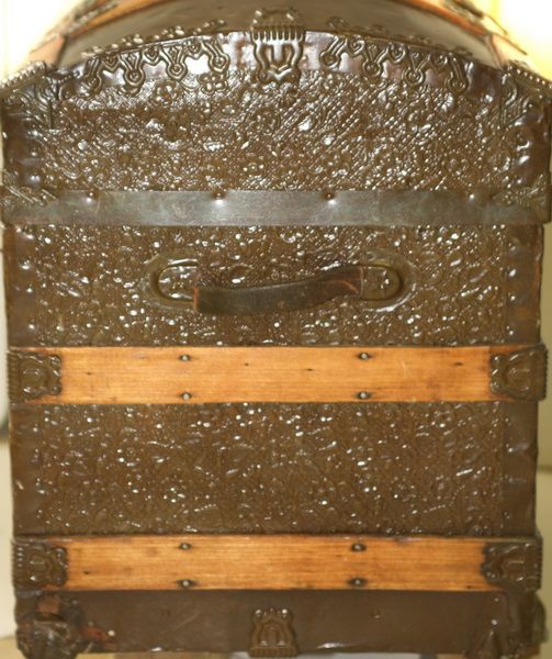 Vintage mid 1800's period barrel round top steamer trunk with lid compartments - handcrafted floral design relief panels with smooth metal panels on lid & sides - five vertical wood slats on front & back & lid - two wood slats on sides - steel corner & side brackets - steel latches with center lock missing - missing metal covering at bottom right front corner - all metal has nice brown patina - damaged to rear right corner bracket - lid has center storage compartment with damaged cover - wood top tray has two inside tray compartments with one complete with some warping & other missing 3/4 of cover - center flat compartment in good condition with lid - vintage color prints with red scrolled trim - large main wood interior compartment - brown color steel with oak finish wood - 36"x24"21.5" - Local Pickup Preferred - Freight - non-ffl - 25GGGMAKS001