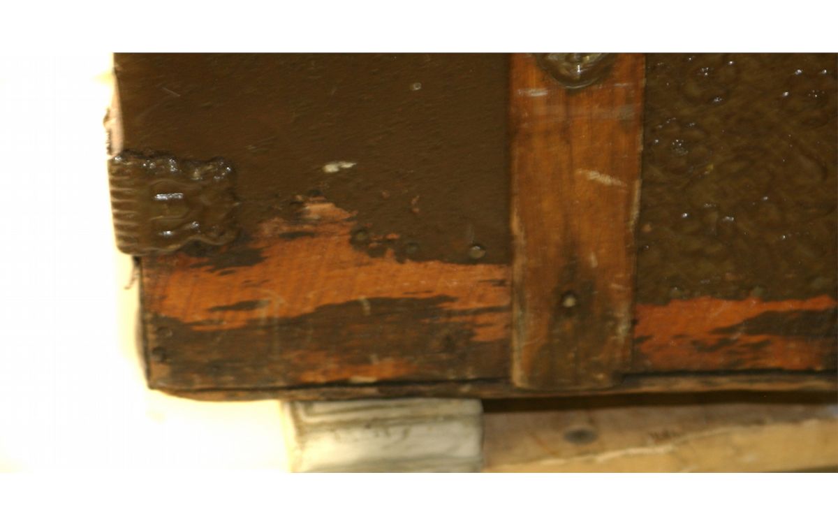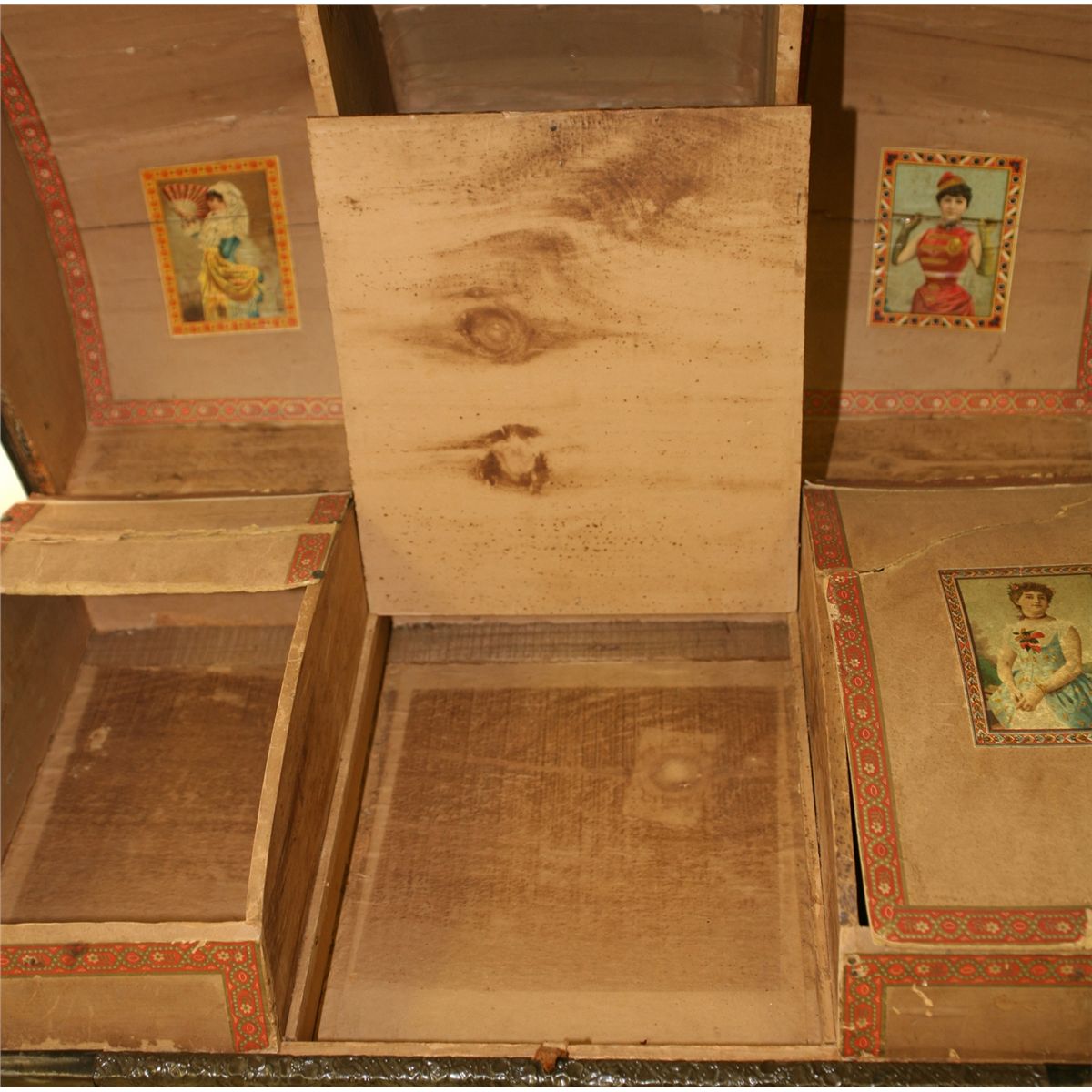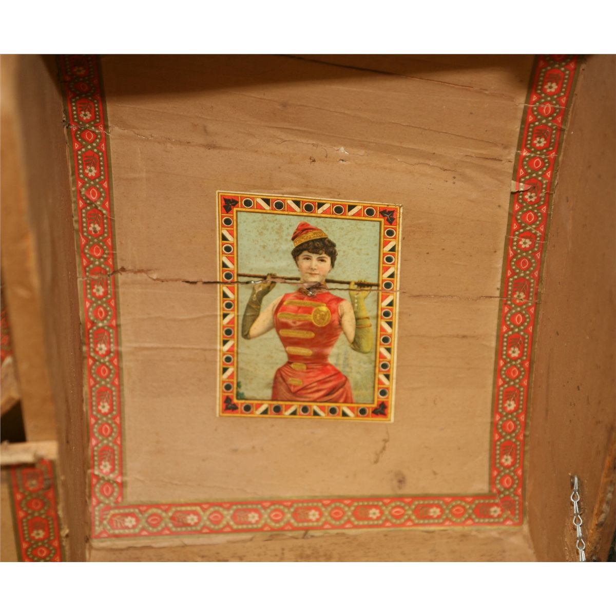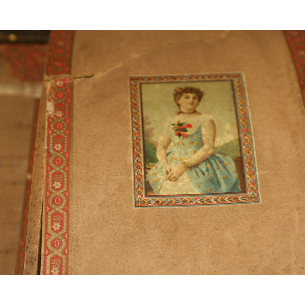 Vintage mid 1800's period barrel round top steamer trunk with lid compartments - handcrafted floral design relief panels with smooth metal panels on lid & sides - five vertical wood slats on front & back & lid - two wood slats on sides - steel corner & side brackets - steel latches with center lock missing - missing metal covering at bottom right front corner - all metal has nice brown patina - damaged to rear right corner bracket - lid has center storage compartment with damaged cover - wood top tray has two inside tray compartments with one complete with some warping & other missing 3/4 of cover - center flat compartment in good condition with lid - vintage color prints with red scrolled trim - large main wood interior compartment - brown color steel with oak finish wood - 36"x24"21.5" - Local Pickup Preferred - Freight - non-ffl - 25GGGMAKS001