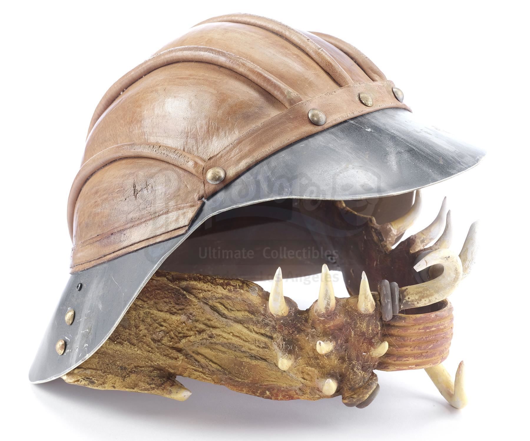 This lot will be auctioned on Tuesday, June 29th. The auction will begin at 9:00am PDT and lots are sold sequentially via live auctioneer; tune in to the live streaming broadcast on auction day to follow the pace. Note other lots in the auction may close on June 30th or July 1st. A prototype Lando Calrissian (Billy Dee Williams) skiff guard helmet from Richard Marquand's Star Wars: Return of the Jedi. Calrissian disguised himself as one of Jabba the Hutt's guards to help rescue Han Solo (Harrison Ford). Lando's disguise helmet was designed by Nilo Rodis-Jamero, who came up with the idea for a helmet with strips of leather covers when he saw a softball glove sitting on top of a co-workers head. The helmet is made of black vacuum-formed plastic with brown leather coverings, brass-color metal studs, and a brown and white resin face mask featuring pointed teeth. The inside of the mask features leather and foam padding. This version is similar to the final helmet worn on-screen, with some differences to coloring, detail, and finish. It is in good overall condition with some wear from age, including scuffing throughout and a few missing studs exposing screws underneath. Dimensions: 14" x 14" x 13" (35.56 cm x 35.56 cm x 33.02 cm) Estimate: $15,000 - 20,000