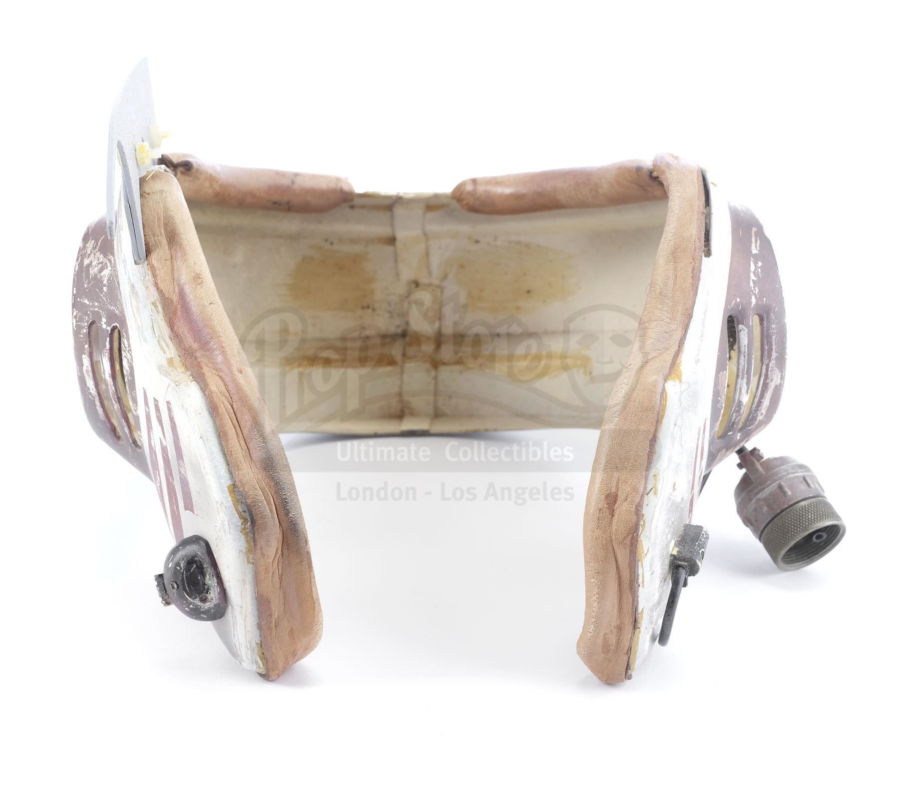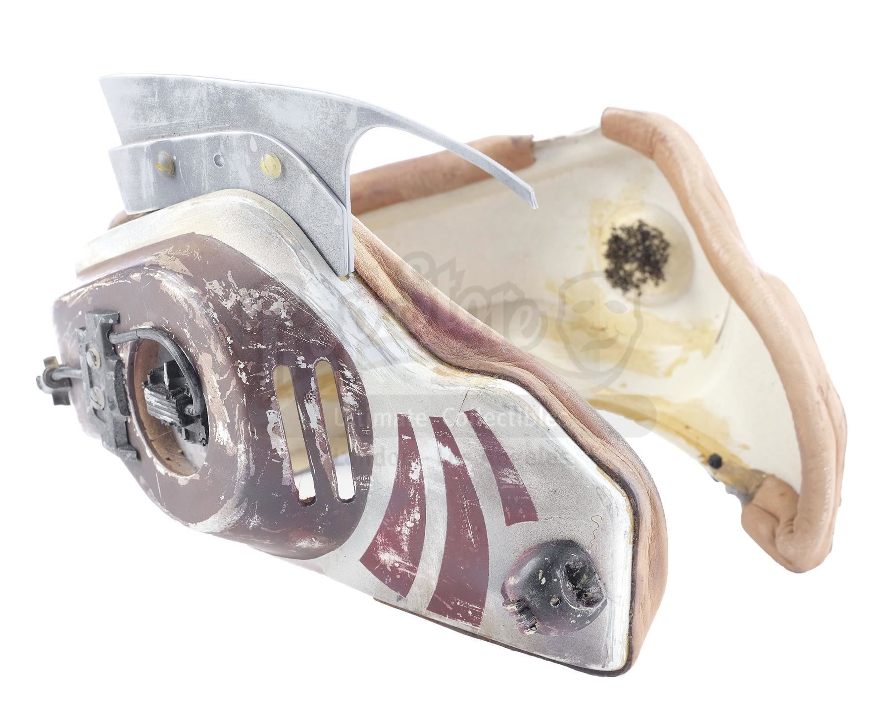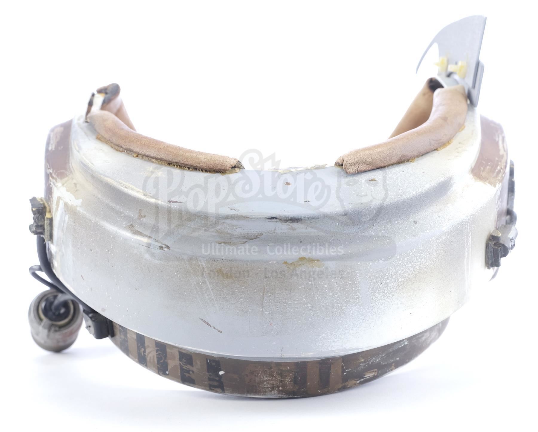 This lot will be auctioned on Tuesday, June 29th. The auction will begin at 9:00am PDT and lots are sold sequentially via live auctioneer; tune in to the live streaming broadcast on auction day to follow the pace. Note other lots in the auction may close on June 30th or July 1st. A production-made A-wing pilot helmet from Richard Marquand's Star Wars: Return of the Jedi. The Rebel Alliance's A-wing fighter pilots wore their helmets, newly designed for this film, when they attempted to destroy the second Death Star during the Battle of Endor. This production-made helmet is constructed of vacuformed plastic painted brown and white with a light brown leatherette trim, metal embellishments including electronic "greeblie" components, and wiring intended to connect to a microphone. One side of the helmet has a visor mount installed, though the visor is not present. It is in fair overall condition with some wear from use and age, including paint chipping and staining. Dimensions: 13" x 10" x 8" (33.25 cm x 25.5 cm x 20.5 cm) Estimate: $12,000 - 16,000