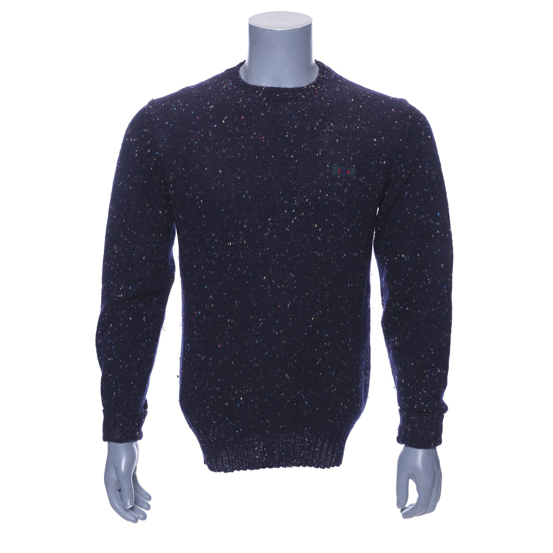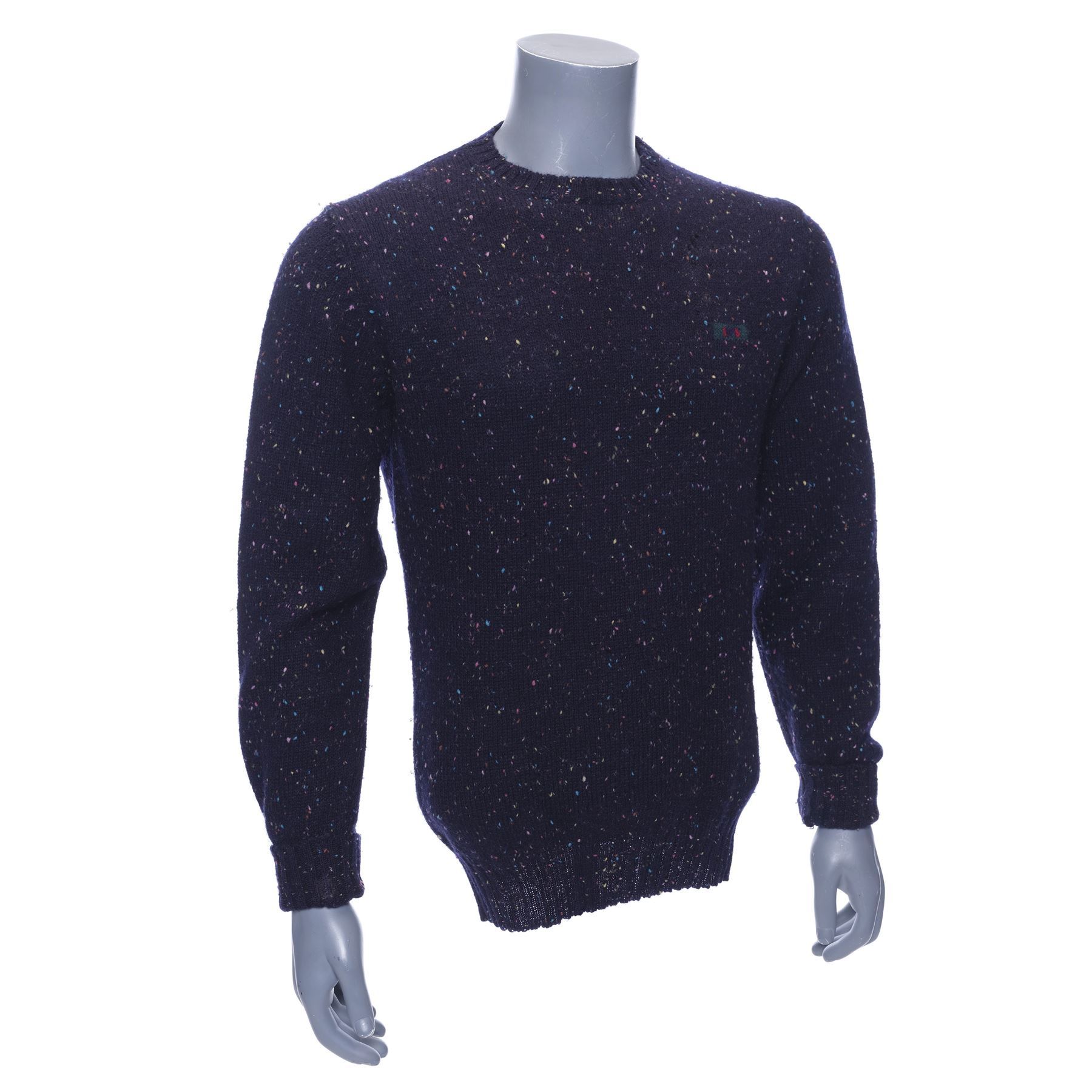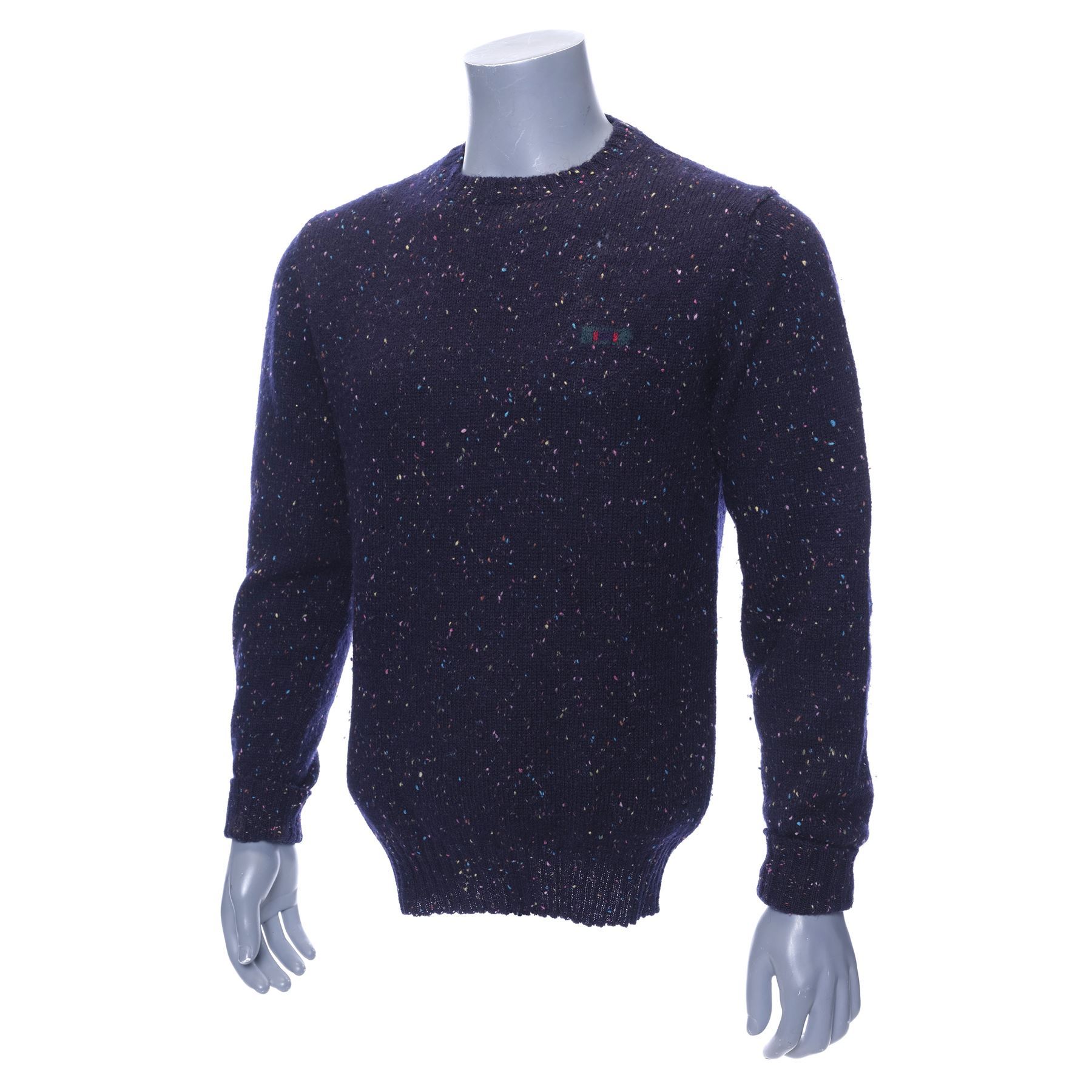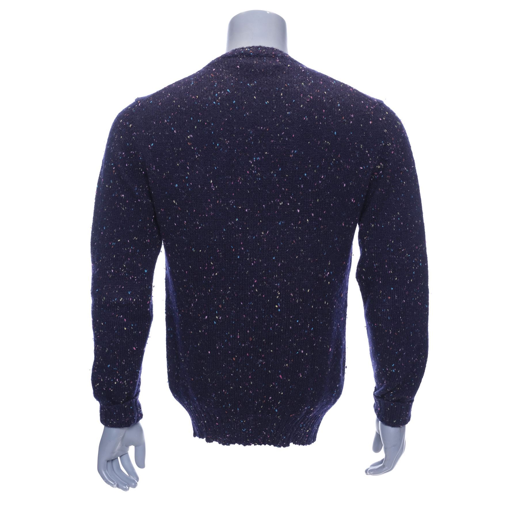This navy wool sweater (size L) features various speckles throughout in yellow, pink, light blue, green, and orange. The sweater exhibits holes on the front from production use.