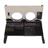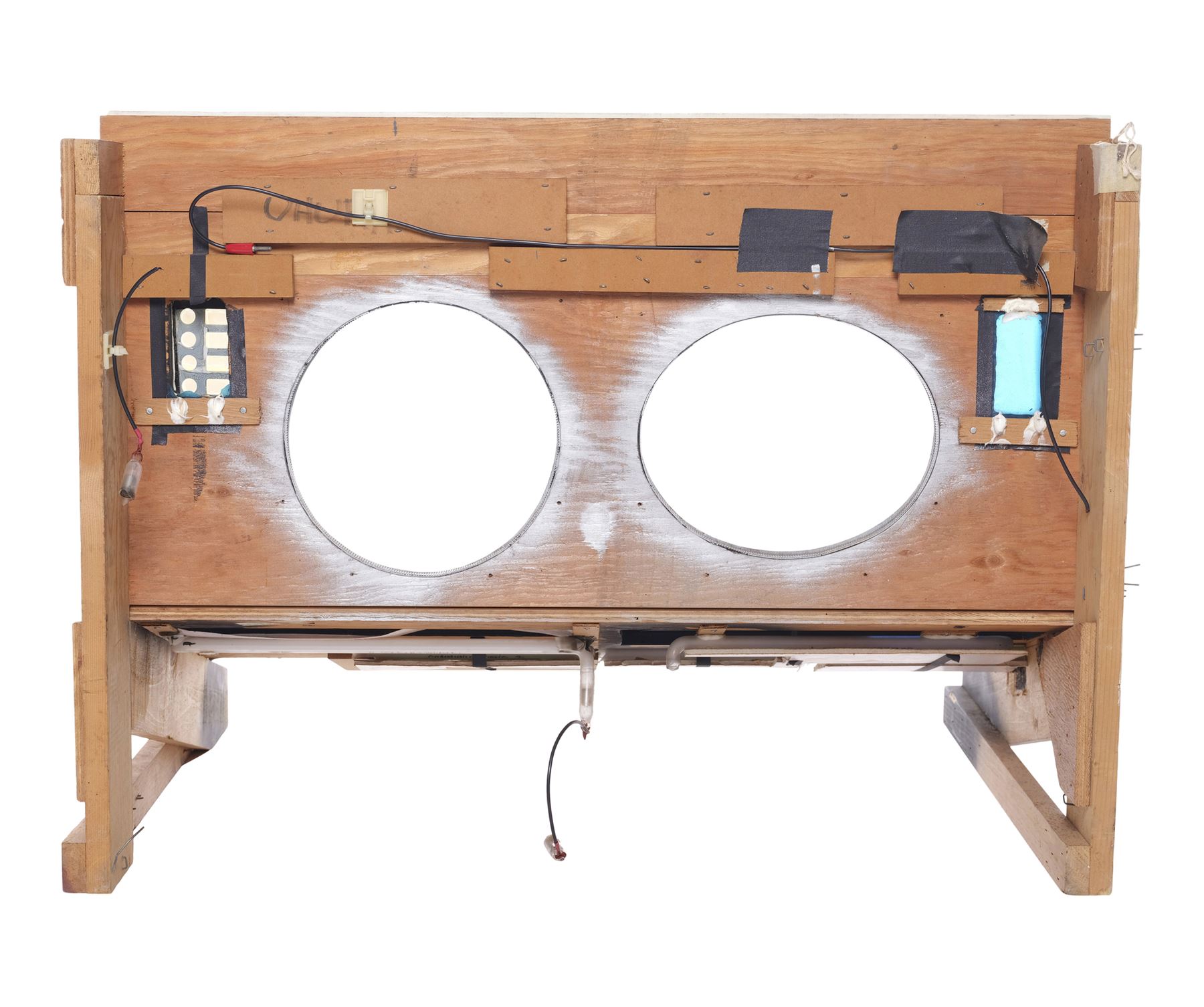 This lot consists of one model miniature 1/2 scale console composed of wood, acrylic, metal, and tubing. Utilised in closeups of Bridge readout screens, this console features a torn label on the side hand-marked with "NYC," "UHURA" at the back, blocked off by a plastic tab, and another label hand-marked "RB098-23," and "Communications 4" hand-written on tubing beneath the console. This lot exhibits a build up of grime, adhesive residue, lifted tape, exposed staples, and splintered wood. Dimensions: 59 cm x 84 cm x 62.25 cm (23.25" x 33" x 24.5")