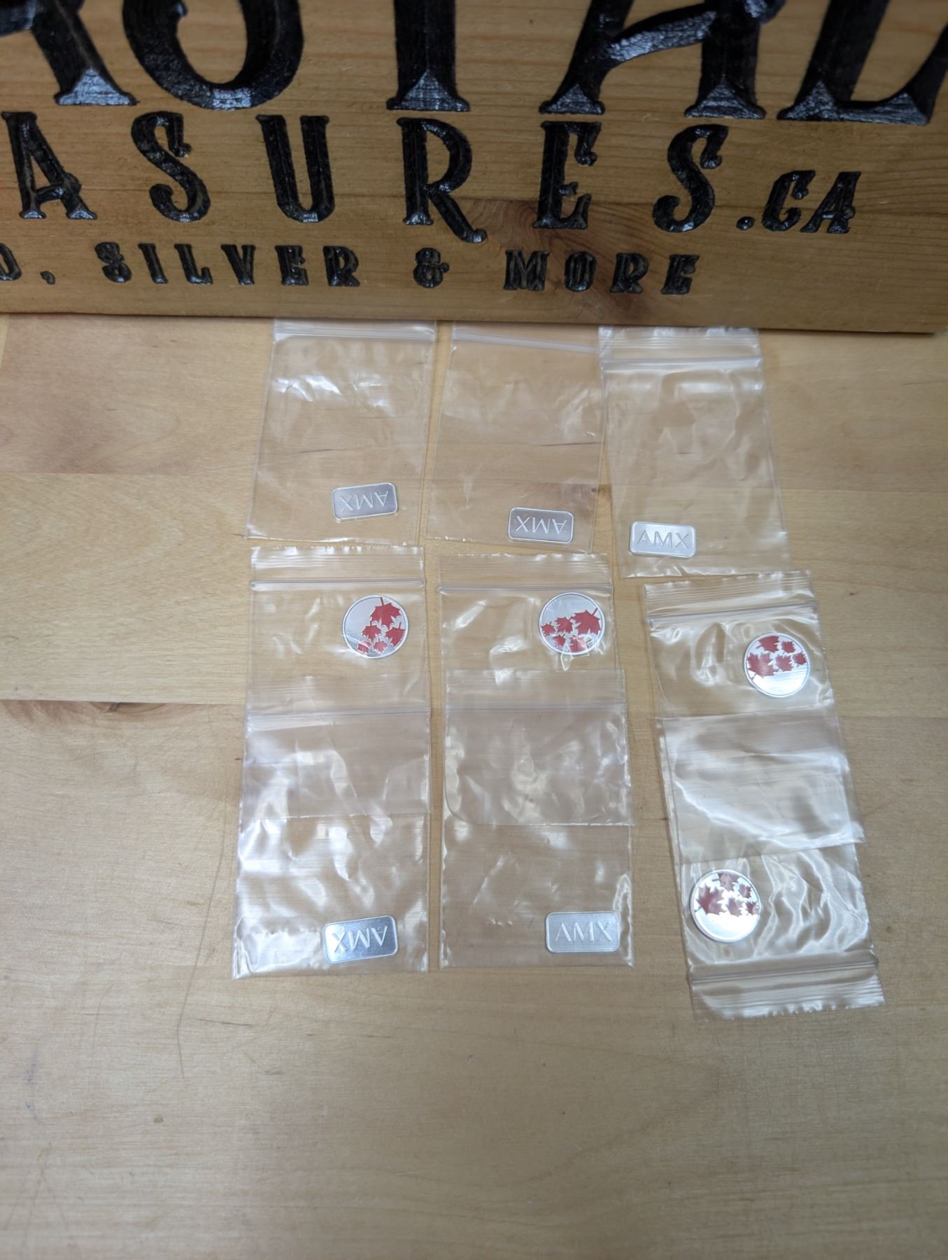 Small rounds, likely featuring iconic Canadian designs such as the maple leaf, made from 99.9% pure silver.