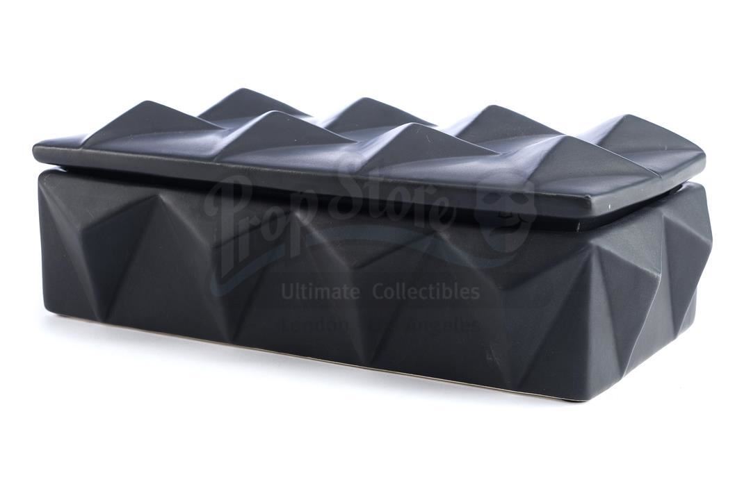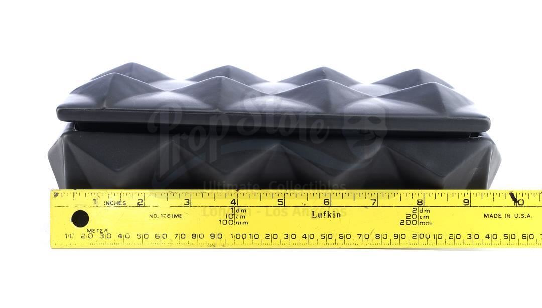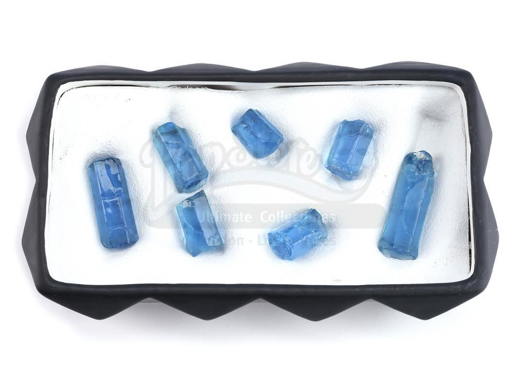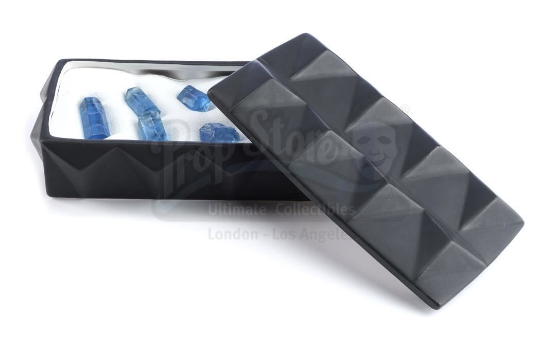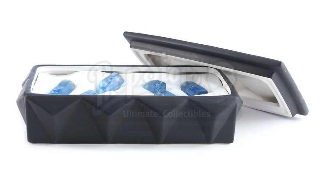 The Vicar's box with terrigen crystals from the episode 'Fun & Games' (506) of Marvel's Agents of S.H.I.E.L.D. In the episode, a Kree known as The Vicar uses a box containing terrigen crystals to expose young humans to the terrigen mist in the hope that doing so will give them Inhuman powers. This lot consists of a black ceramic box with a white urethane textured interior affixed with seven translucent blue urethane crystals of various shapes. It is in excellent overall condition with minor wear from production on all items.