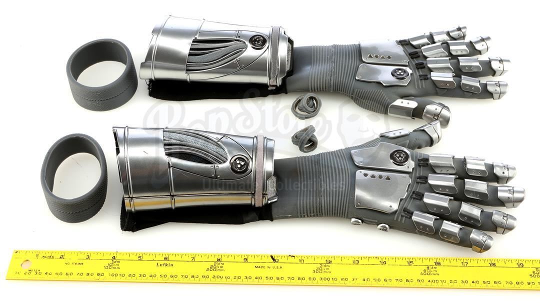 Elena 'Yo-Yo' Rodriguez's robotic arms from Seasons 5 through 7 of Marvel's Agents of S.H.I.E.L.D. Inhuman S.H.I.E.L.D. Agent Rodriguez, known in the pages of Marvel Comics as Slingshot, wears her specially-made robotic arms throughout the seasons after Ruby Hale behands her. This lot consists of a pair of gray rubber gloves with metallized resin details and black nylon sleeves, a pair of matching resin and cloth gauntlets, gray rubber bands, and a dense black polymer case with custom-fitted foam inlays for storing the arms. The lot is in excellent overall condition with minor signs of wear from production throughout all items, including scuffing to the case.