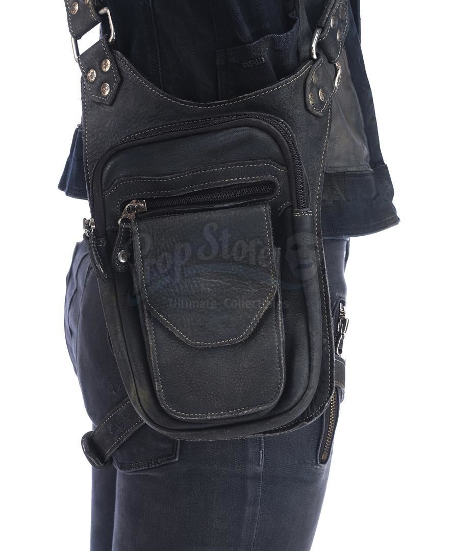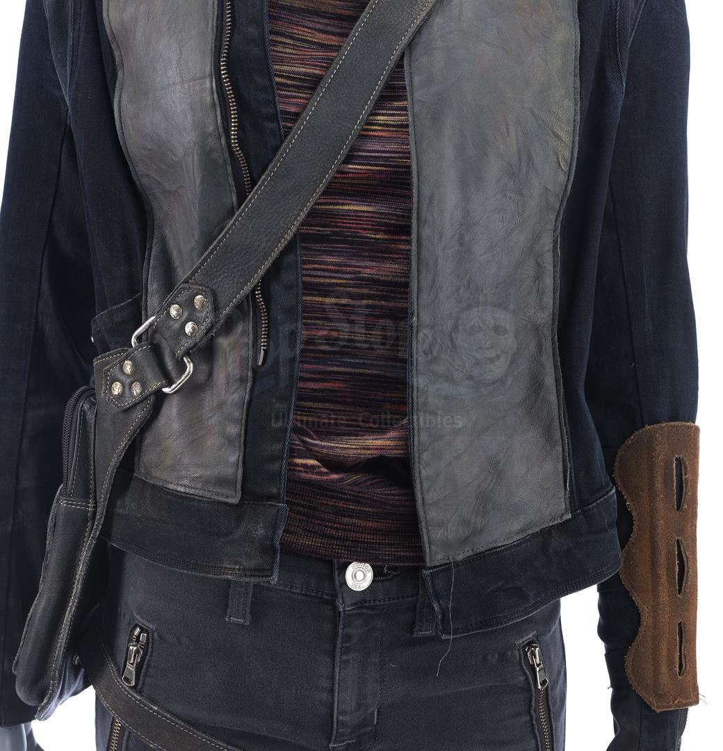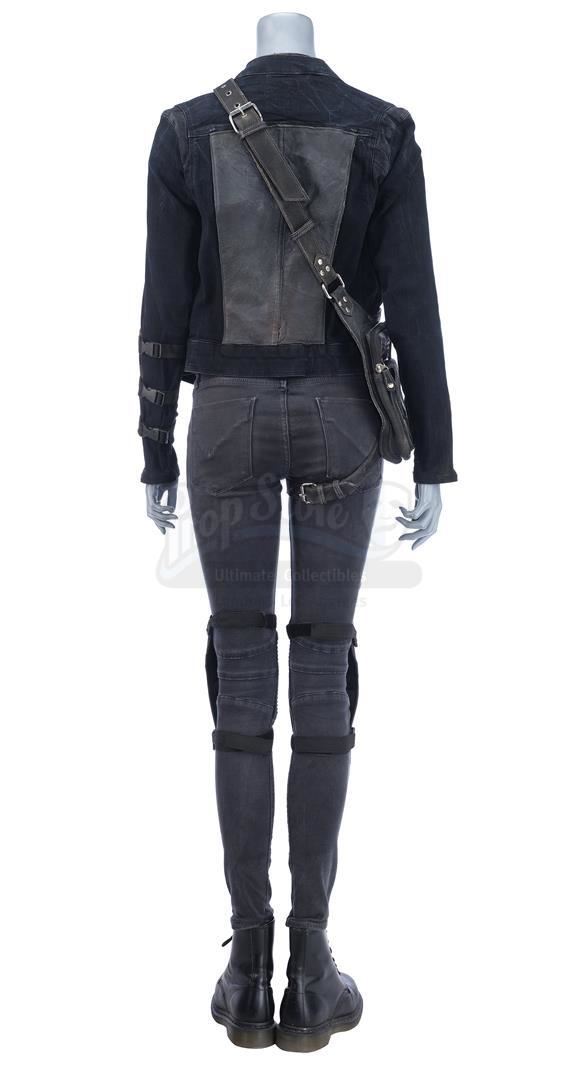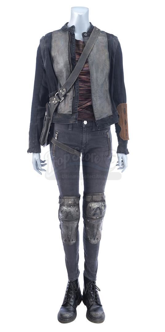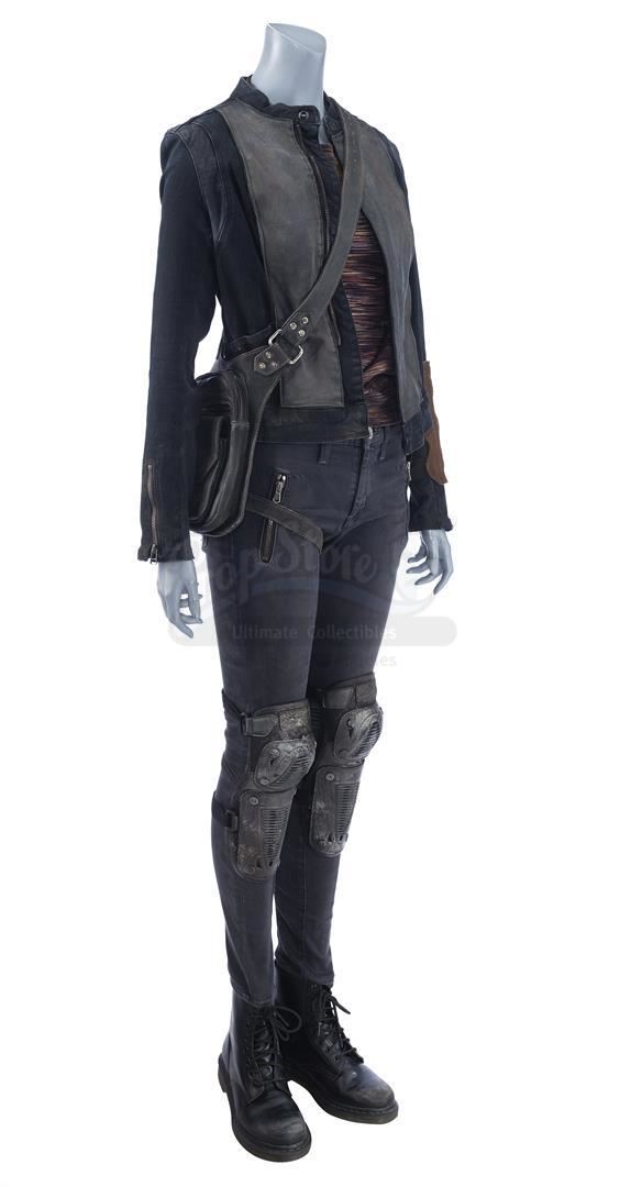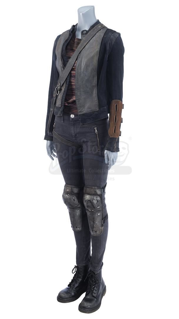 Elena 'Yo-Yo' Rodriguez's Lighthouse and return to earth costume from Season 5 of Marvel's Agents of S.H.I.E.L.D. Inhuman S.H.I.E.L.D. agent Rodriguez, known in the pages of Marvel Comics as Slingshot, wears her costume throughout the season as she and her teammates fight to survive after being transported to 'The Lighthouse', a space station orbiting a destroyed Earth in the future. This lot consists of a black and gray denim jacket with leather details, a purple, black and brown cotton blend shirt with black leatherette details on the shoulders, a brown and black leather and nylon forearm strap, a pair of black cotton jeans, a pair of black urethane and nylon knee guards, a black leather satchel with metal zippers and a pair of black leather and rubber boots. It is in excellent overall condition with some deliberate production-made wear on all items including scuffing on the leather of the jacket and discoloration on the knee guards.