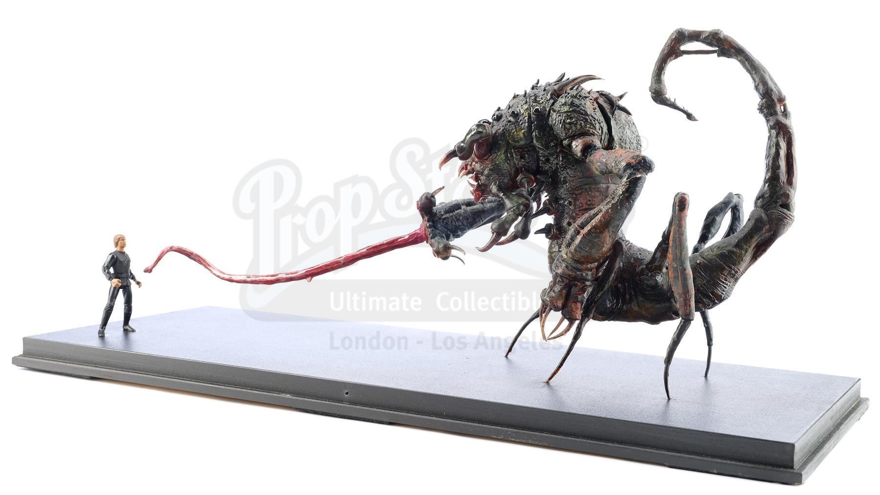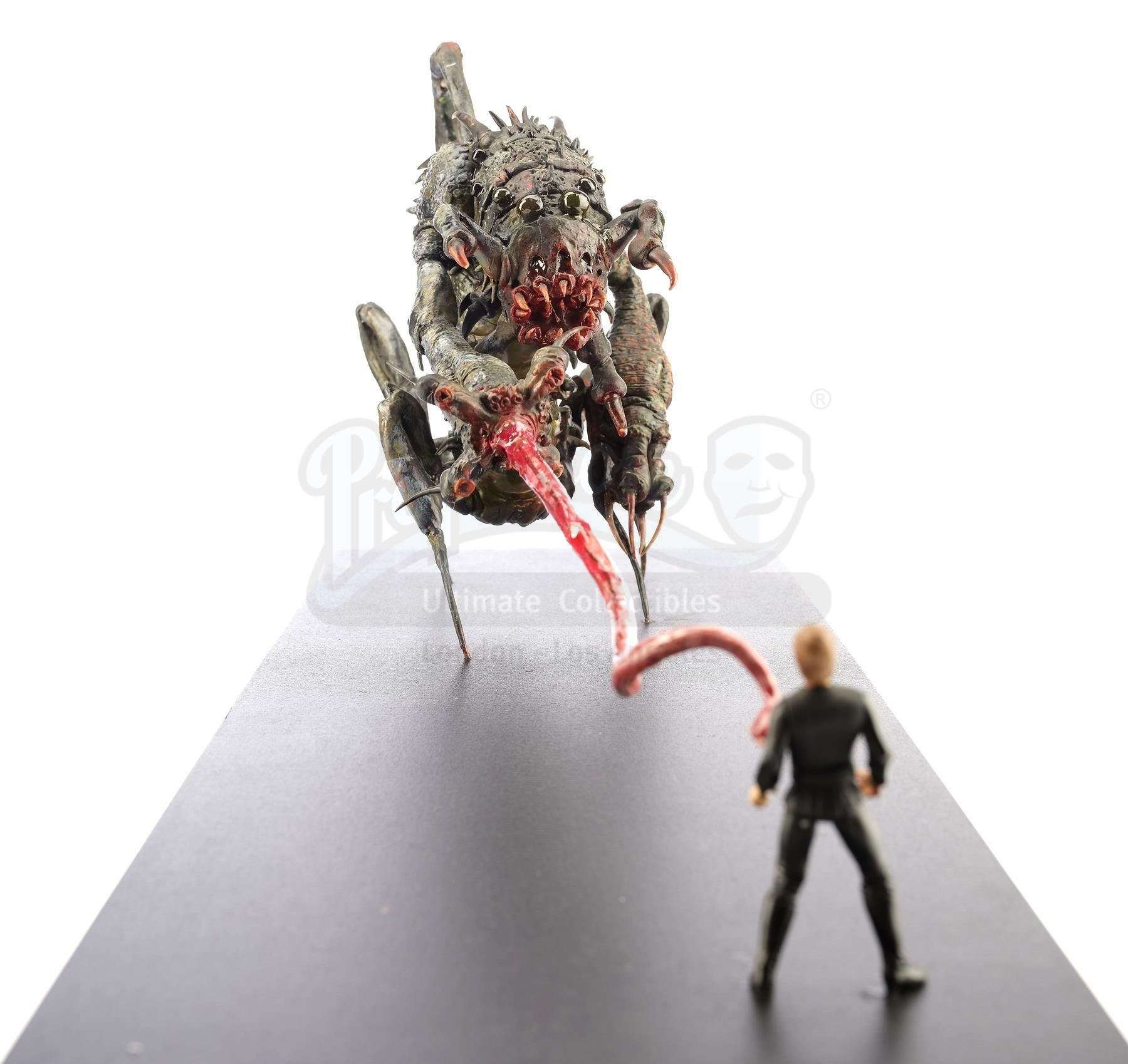 The maquette is made of sculpting compound over a wire frame and is painted in various shades of green, brown, and black. As an early concept for the creature, the maquette features a much more animalistic interpretation than the version seen in this finished film, with many dark spider-like eyes and a round mouth with a ring of fangs surrounded by four sharp, finger-like claws. A long pink tentacle-like appendage protrudes from the creature's right arm, reaching towards the human figure placed across from it. The maquette is attached to a black, painted wooden base with a clear acrylic cover over it. Also included as a sight gag is a plastic Luke Skywalker figure. The lot is in excellent overall condition with minimal wear from handling and age. Includes a letter of authenticity from Phil Tippett. Dimensions: 28" x 11" x 16" (71.5 cm x 28 cm x 41 cm)