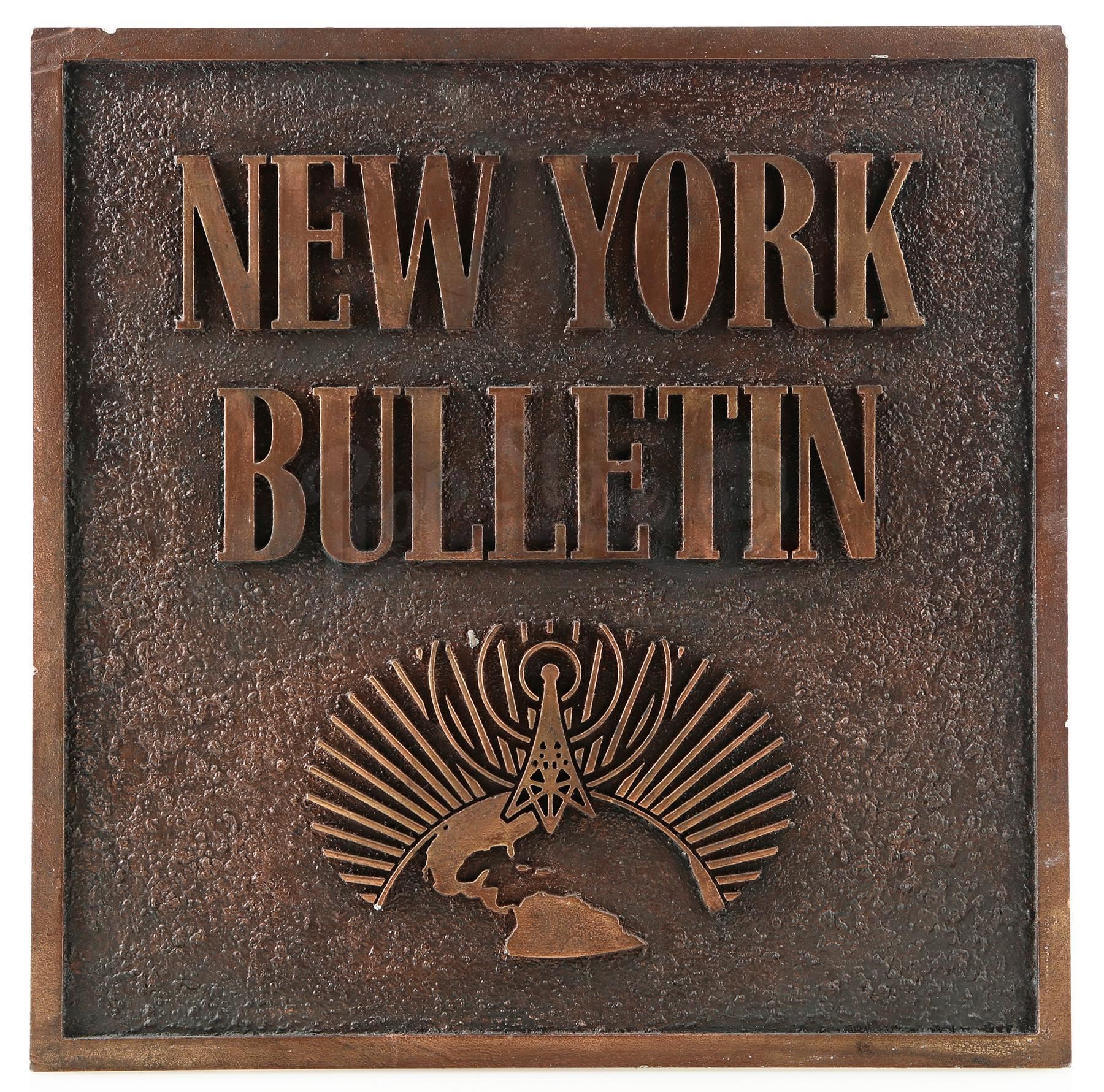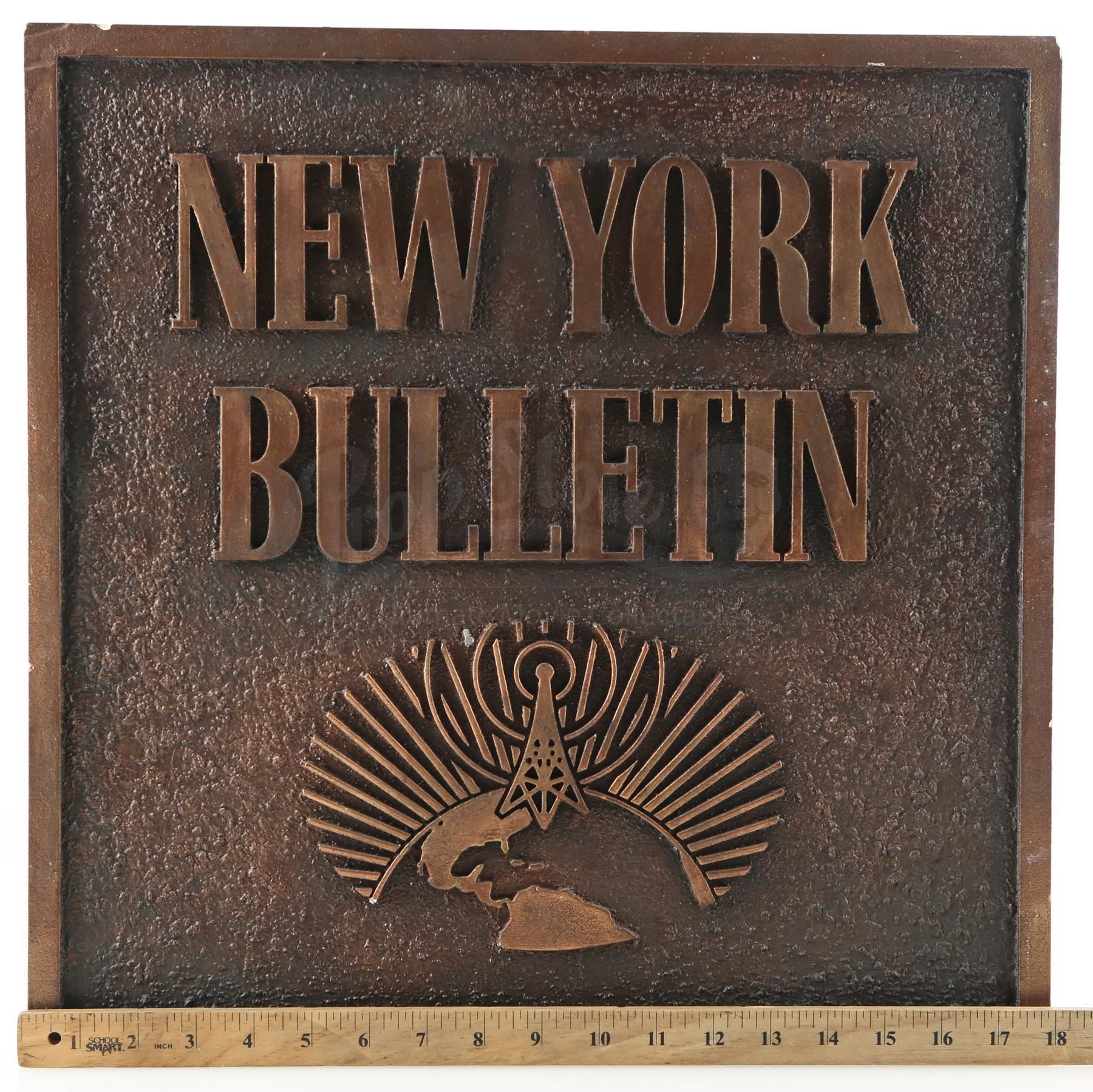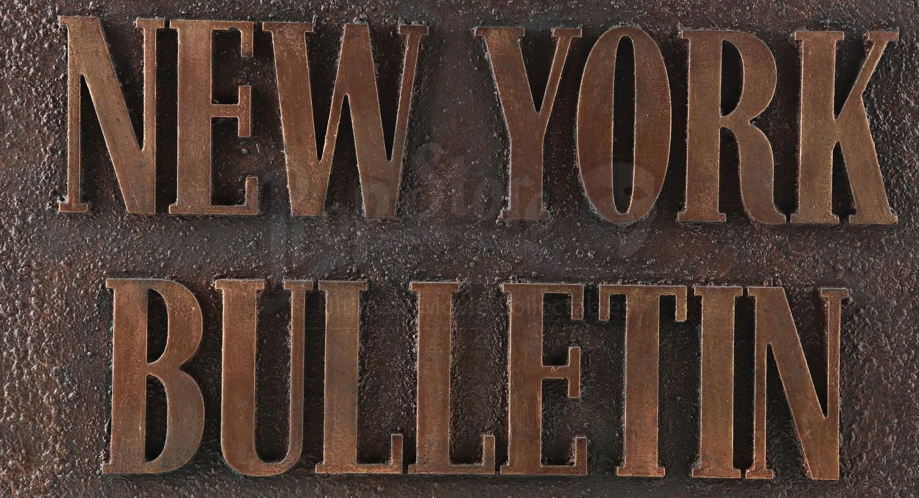 A New York Bulletin building sign from Seasons 1 through 3 of Marvel's Daredevil. Karen Page, Ben Urich, and Mitchell Ellison work at this newspaper, which displays this sign on its building’s facade at various times throughout the series. This spray-painted bronze-color resin sign is in fair overall condition with cracking along the edges and some paint staining on back from production.