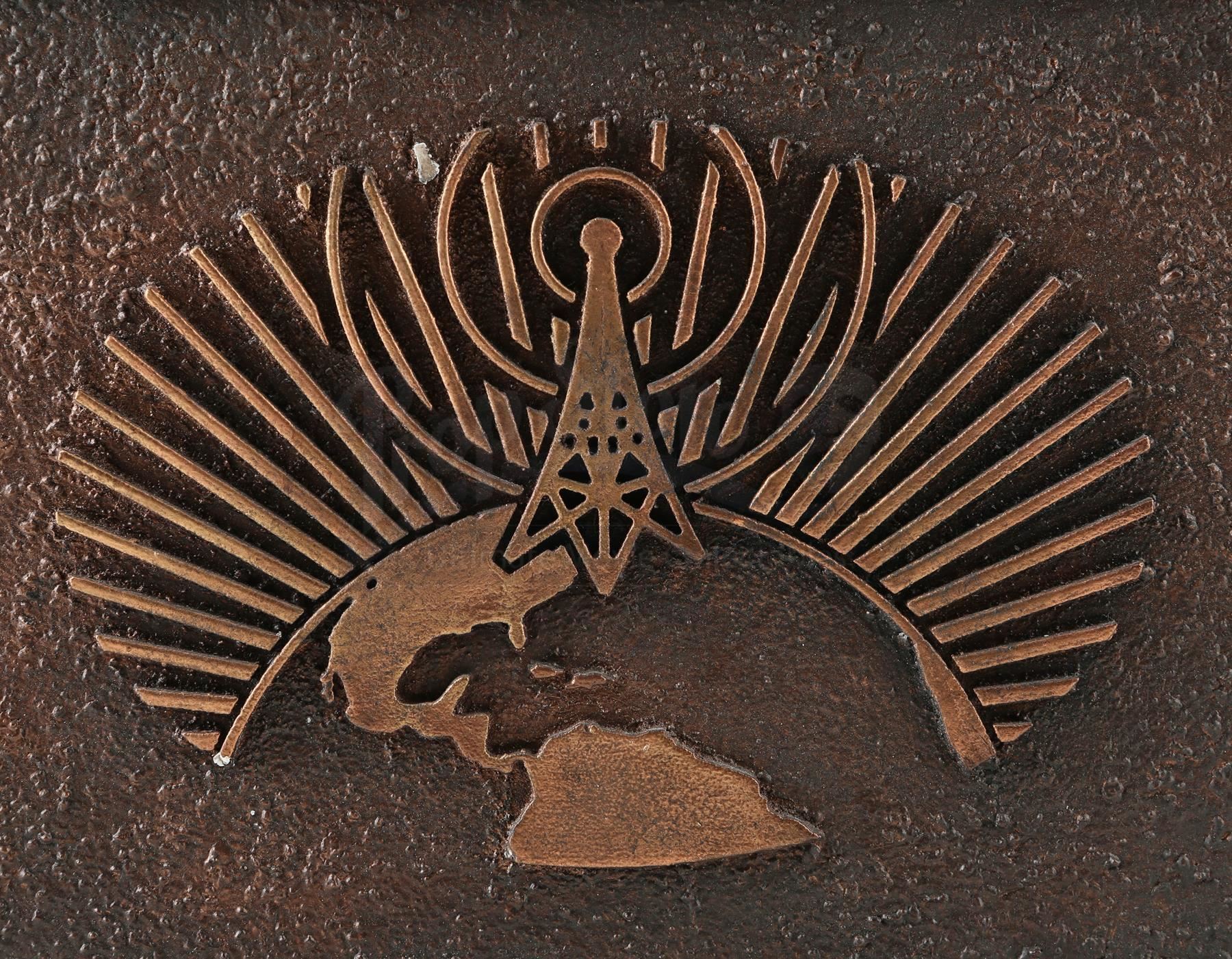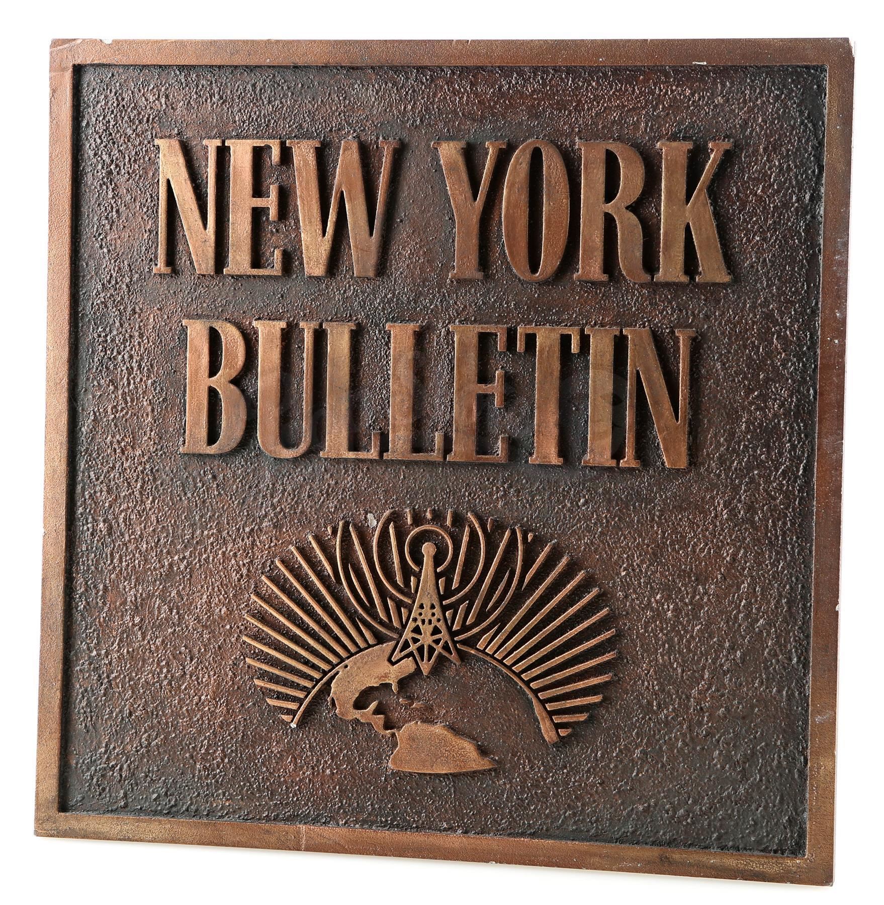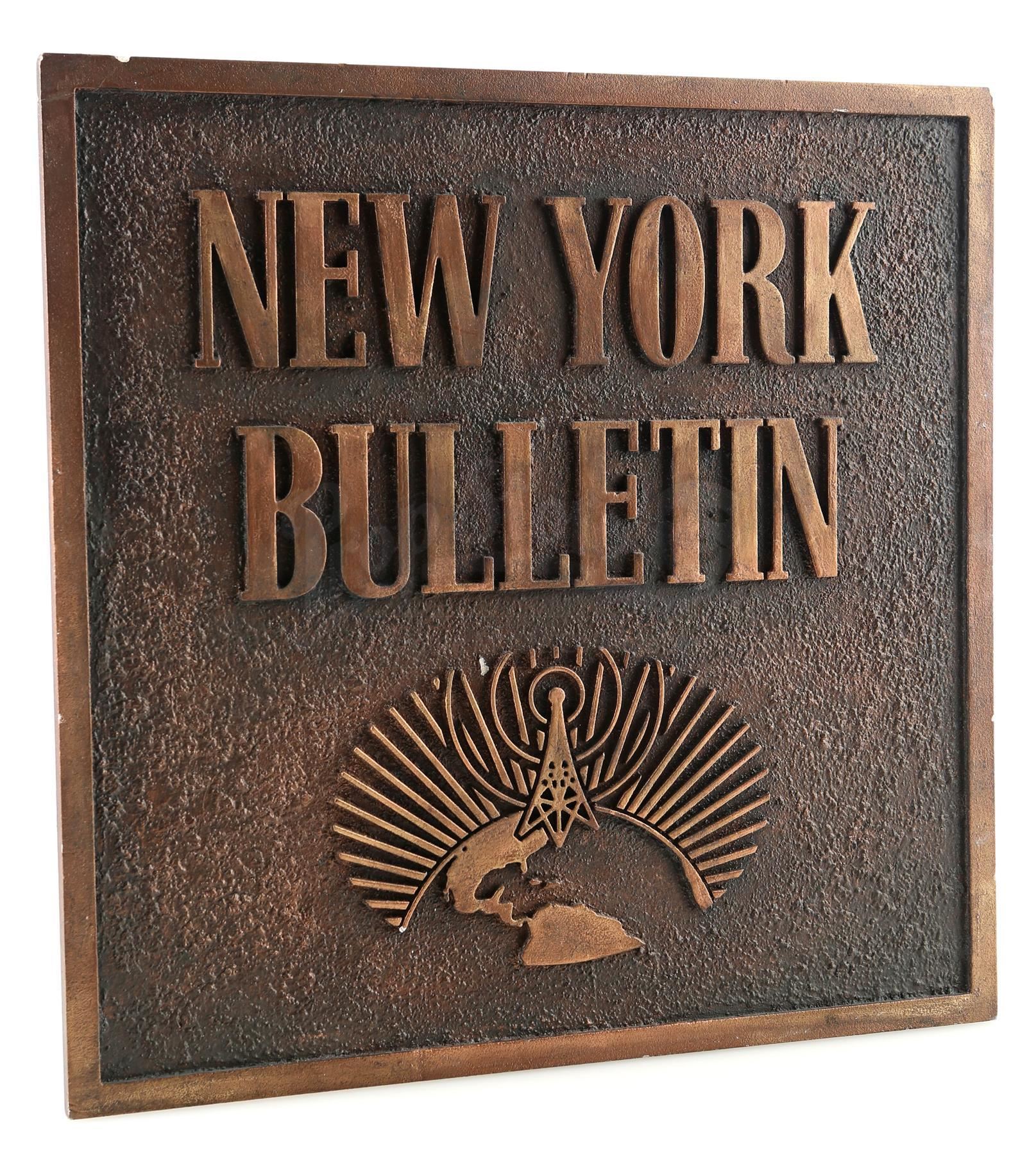A New York Bulletin building sign from Seasons 1 through 3 of Marvel's Daredevil. Karen Page, Ben Urich, and Mitchell Ellison work at this newspaper, which displays this sign on its building’s facade at various times throughout the series. This spray-painted bronze-color resin sign is in fair overall condition with cracking along the edges and some paint staining on back from production.