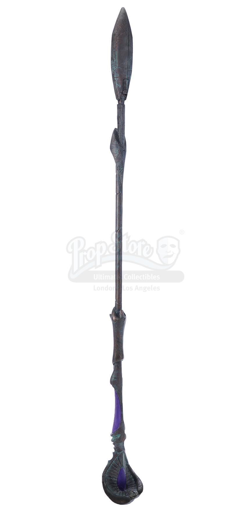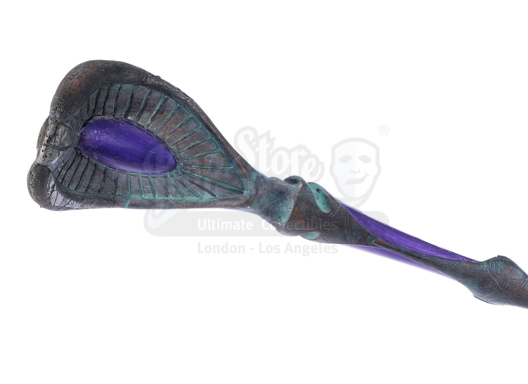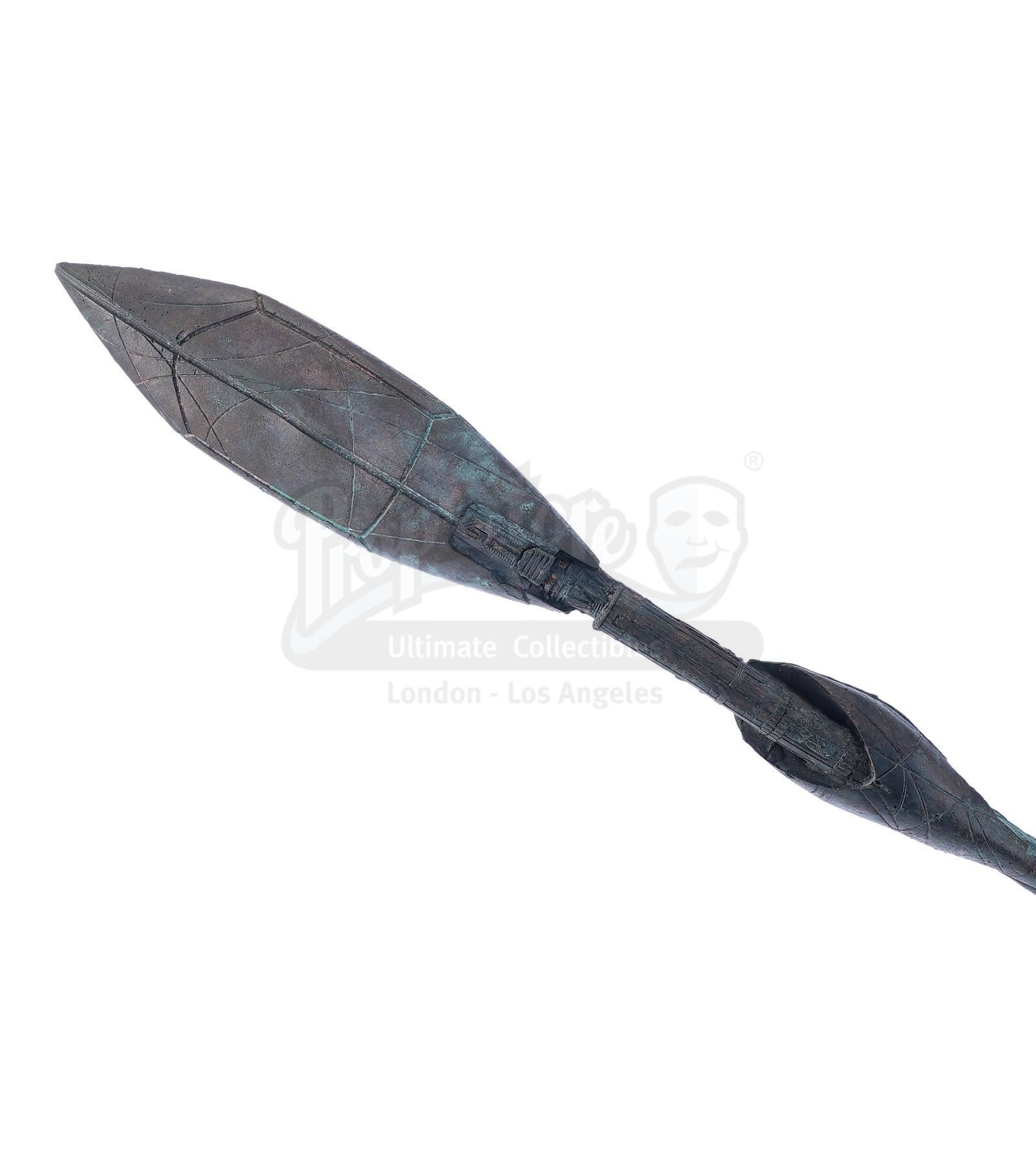 This lot will be auctioned on Tuesday, June 29th. The auction will begin at 9:00am PDT and lots are sold sequentially via live auctioneer; tune in to the live streaming broadcast on auction day to follow the pace. Note other lots in the auction may close on June 30th or July 1st. A Jaffa Warrior Ma'Tok staff from Brad Wright and Jonathan Glassner's sci-fi adventure series Stargate SG-1. The primary weapon used by the Goa'uld army and their Jaffa supporters, these staffs were used both as plasma projectile cannons and for melee fighting. This copper-color resin and urethane staff was made with an oval shaped head for the barrel and a large paddle that can be used for melee attacks. It features detailed decorative etchings and purple accents as well as small blotches of green tarnish that have been added to the finish. It shows wear due to production and age including minor paint chipping, but remains in excellent overall condition. Dimensions: 81.5" x 9.5" x 6.5" (207 cm x 24.25 cm x 16.5 cm) Estimate: $2,500 - 3,500