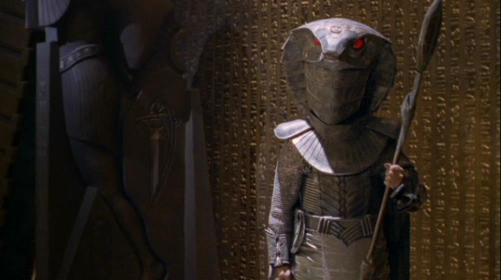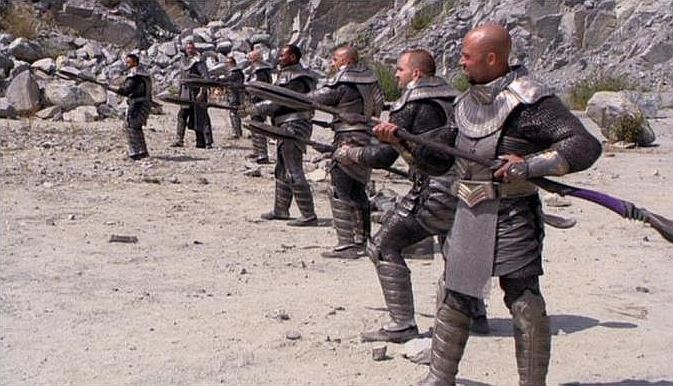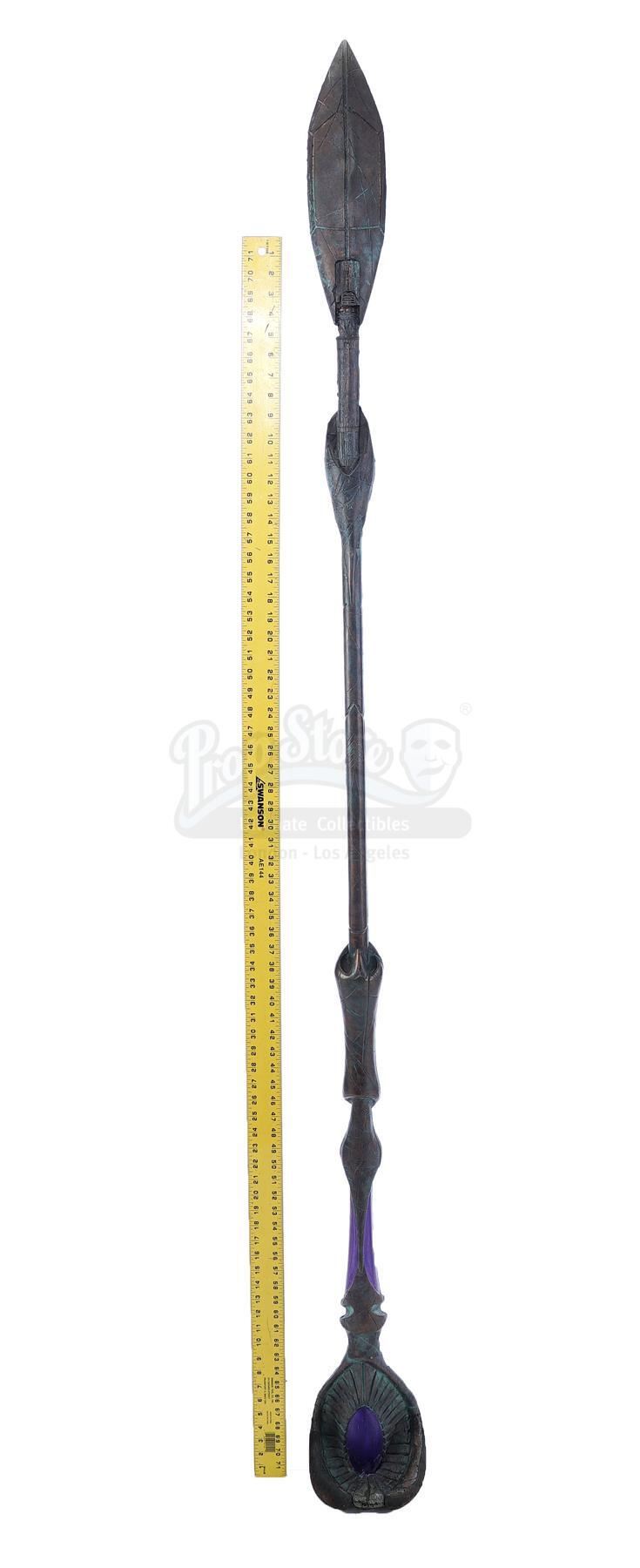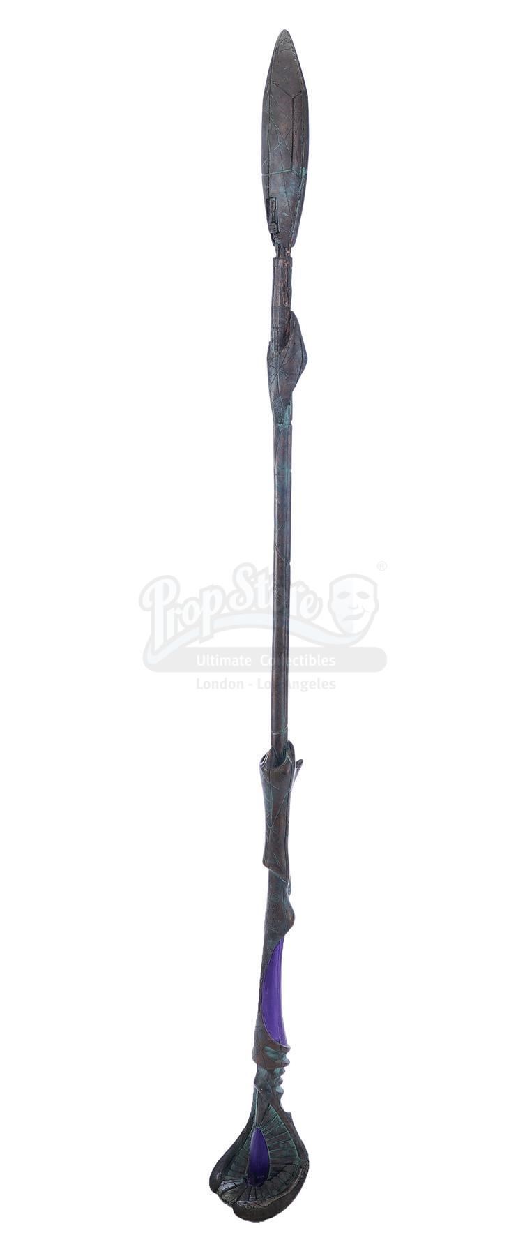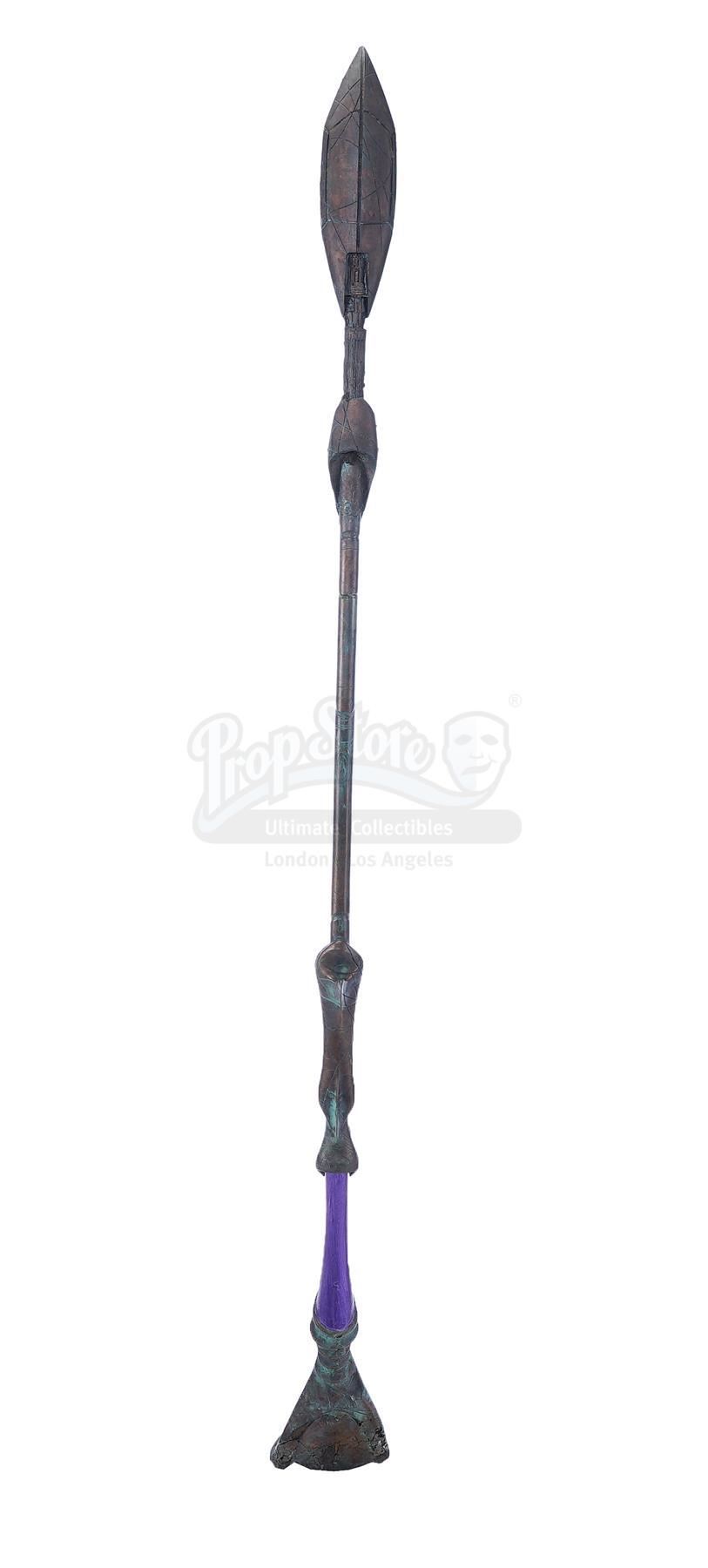 This lot will be auctioned on Tuesday, June 29th. The auction will begin at 9:00am PDT and lots are sold sequentially via live auctioneer; tune in to the live streaming broadcast on auction day to follow the pace. Note other lots in the auction may close on June 30th or July 1st. A Jaffa Warrior Ma'Tok staff from Brad Wright and Jonathan Glassner's sci-fi adventure series Stargate SG-1. The primary weapon used by the Goa'uld army and their Jaffa supporters, these staffs were used both as plasma projectile cannons and for melee fighting. This copper-color resin and urethane staff was made with an oval shaped head for the barrel and a large paddle that can be used for melee attacks. It features detailed decorative etchings and purple accents as well as small blotches of green tarnish that have been added to the finish. It shows wear due to production and age including minor paint chipping, but remains in excellent overall condition. Dimensions: 81.5" x 9.5" x 6.5" (207 cm x 24.25 cm x 16.5 cm) Estimate: $2,500 - 3,500