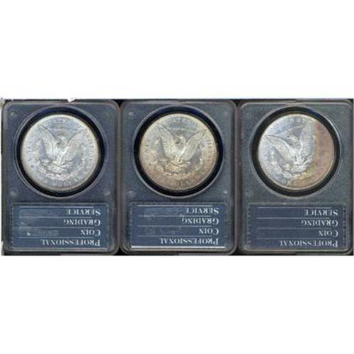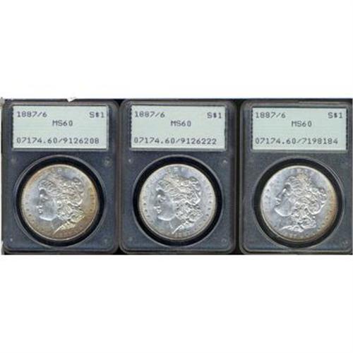Lot 349 - Lot of Three 1887 Morgan Dollars. 7 over 6 PCGS MS60