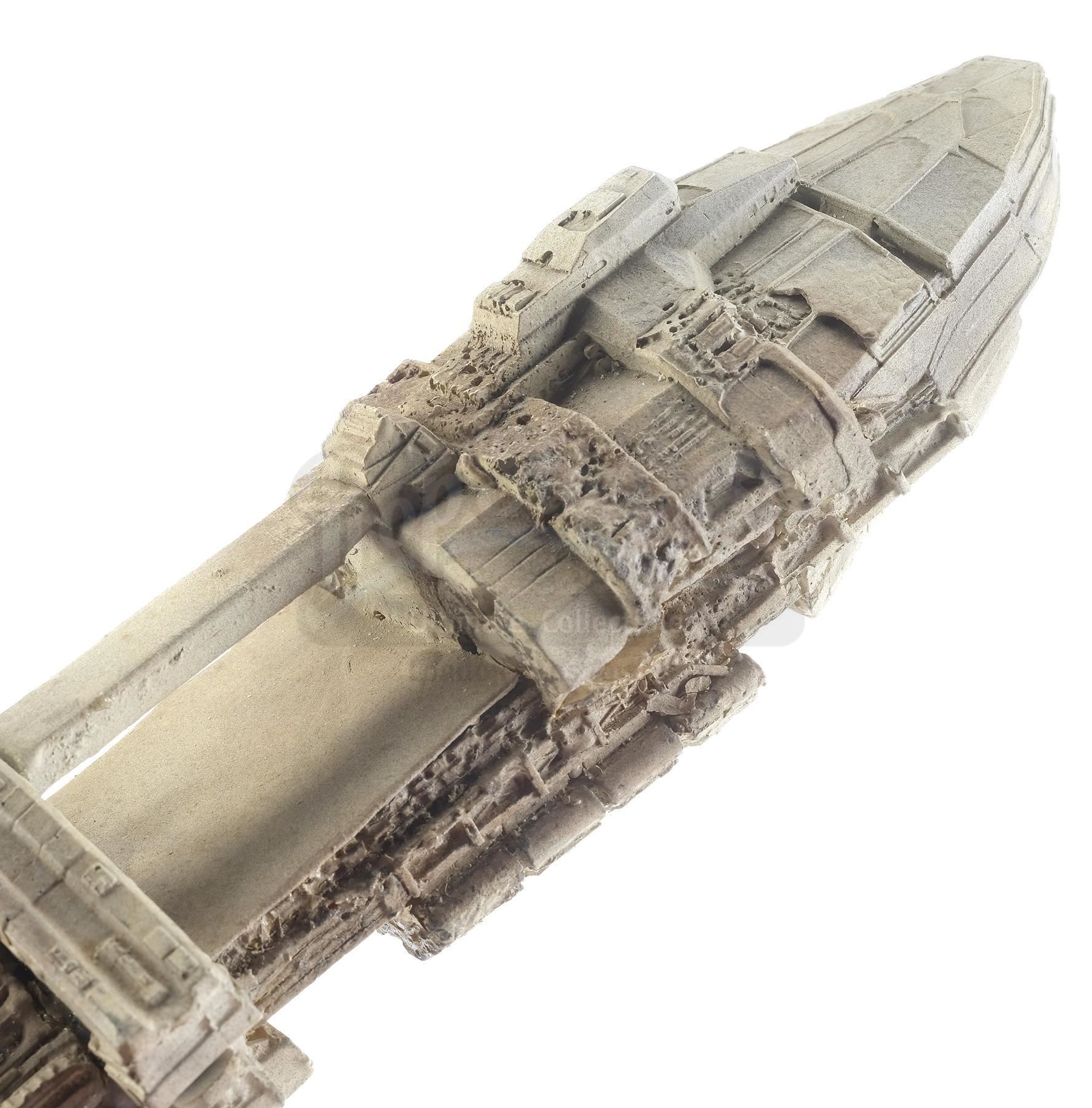 This lot will be auctioned on Tuesday, June 29th. The auction will begin at 9:00am PDT and lots are sold sequentially via live auctioneer; tune in to the live streaming broadcast on auction day to follow the pace. Note other lots in the auction may close on June 30th or July 1st. A UCF Corvette Transport model miniature from Paul Verhoeven's sci-fi satire Starship Troopers. Corvette Transports, the most common ship in the United Citizen Federation fleet, carried dropships, fighters, and cargo during the war against the Arachnids. This mid-size foam and metal model miniature was created as a background model for shots featuring many transport ships as part of the Federation's starfleet. It is painted gray to appear metallic and inset with a rod that allowed the model to be mounted for filming. It is in fair overall condition, with chips and wear on the body and evidence of prior restoration work, including glue residue where it previously broke into two pieces. Dimensions: 19" x 5.5" x 5" (48.5 cm x 14 cm x 12.75 cm) Estimate: $3,000 - 5,000
