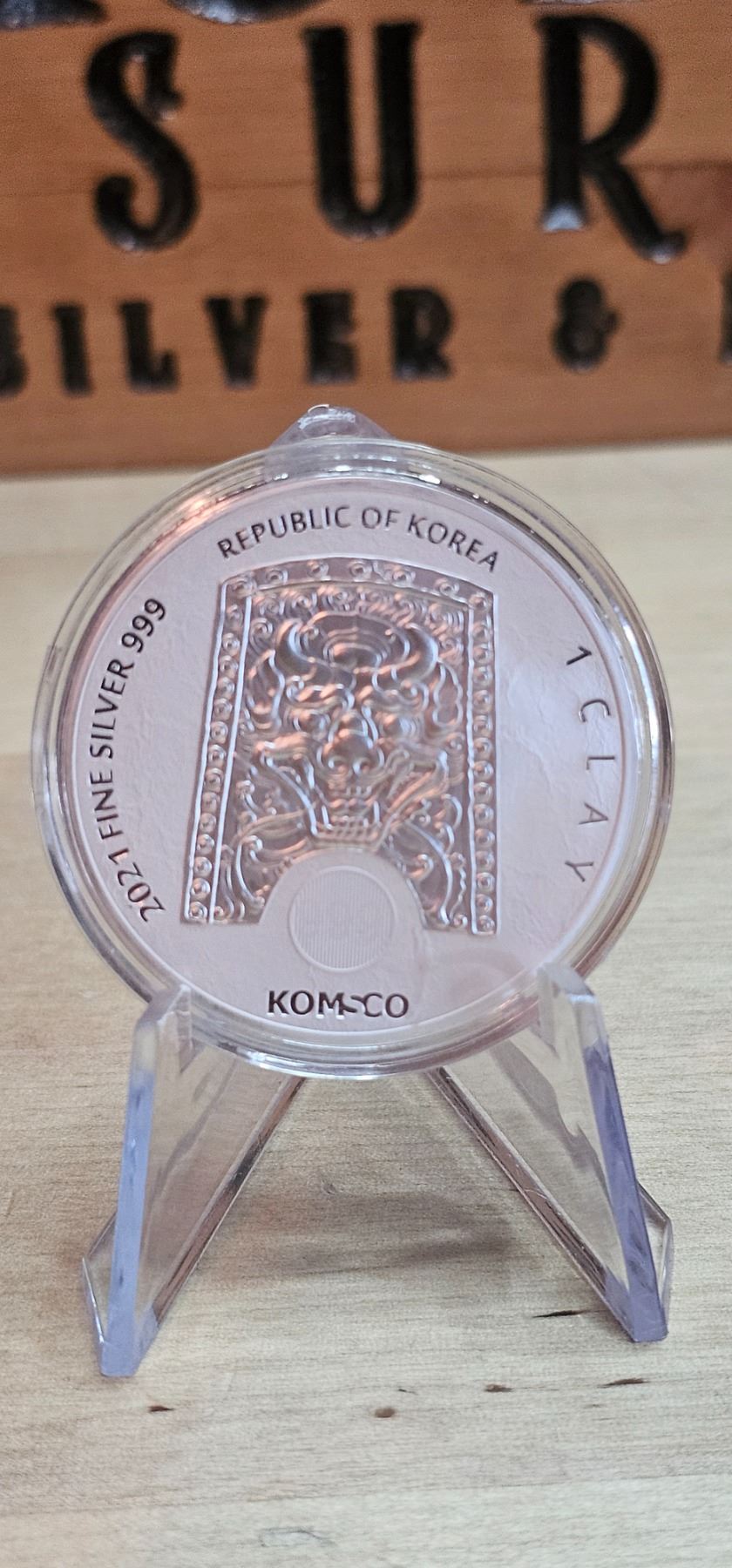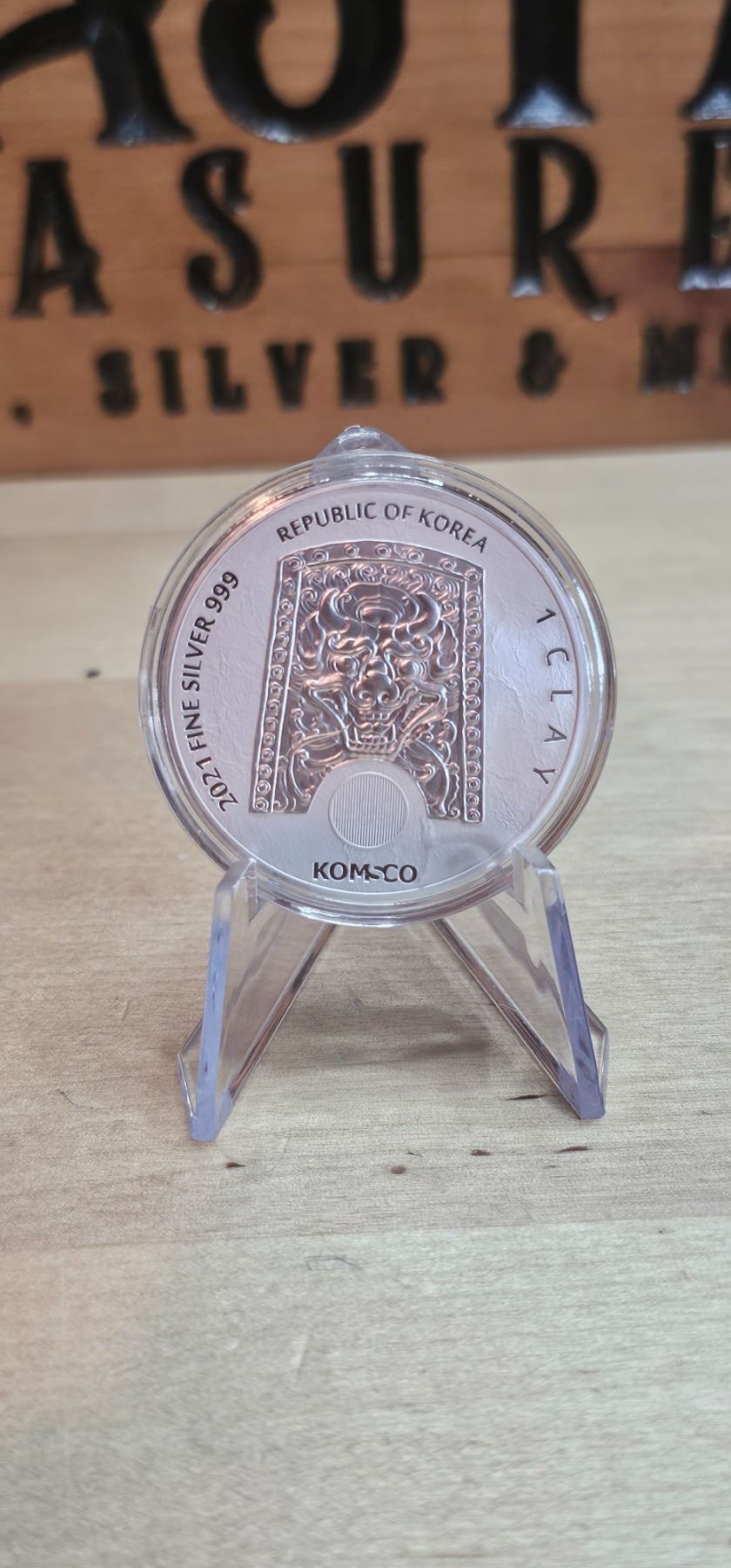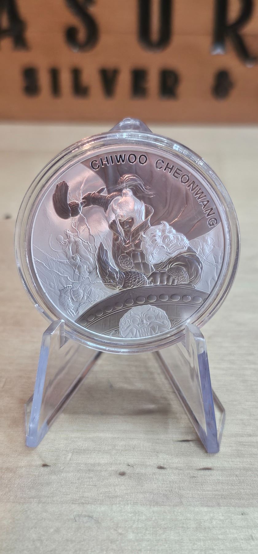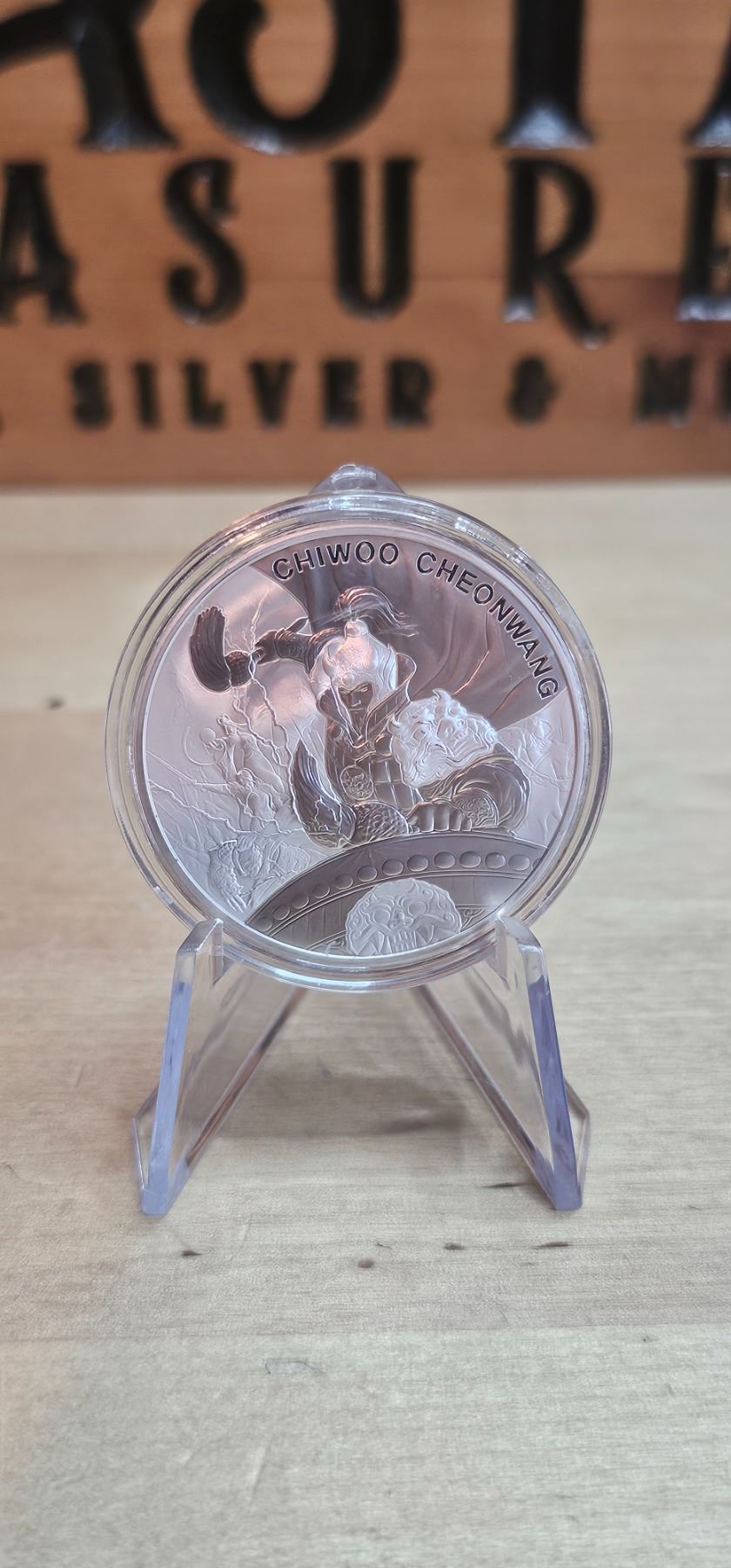 The 2021 1 Oz Silver Chiwoo Cheonwang Coin from KOMSCO is crafted from .999 fine silver and features a striking design of the legendary Korean warrior, Chiwoo Cheonwang. Known for its artistic detail and limited mintage, this coin is a sought-after collectible for both investors and history enthusiasts.