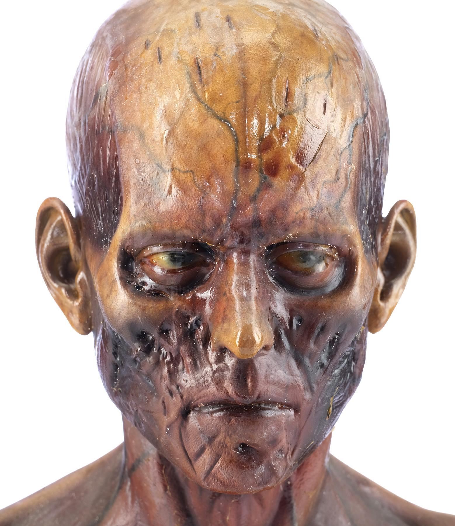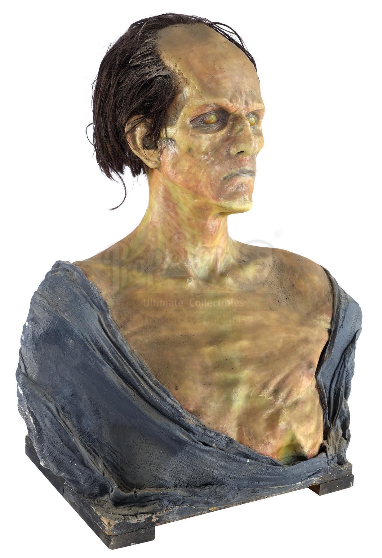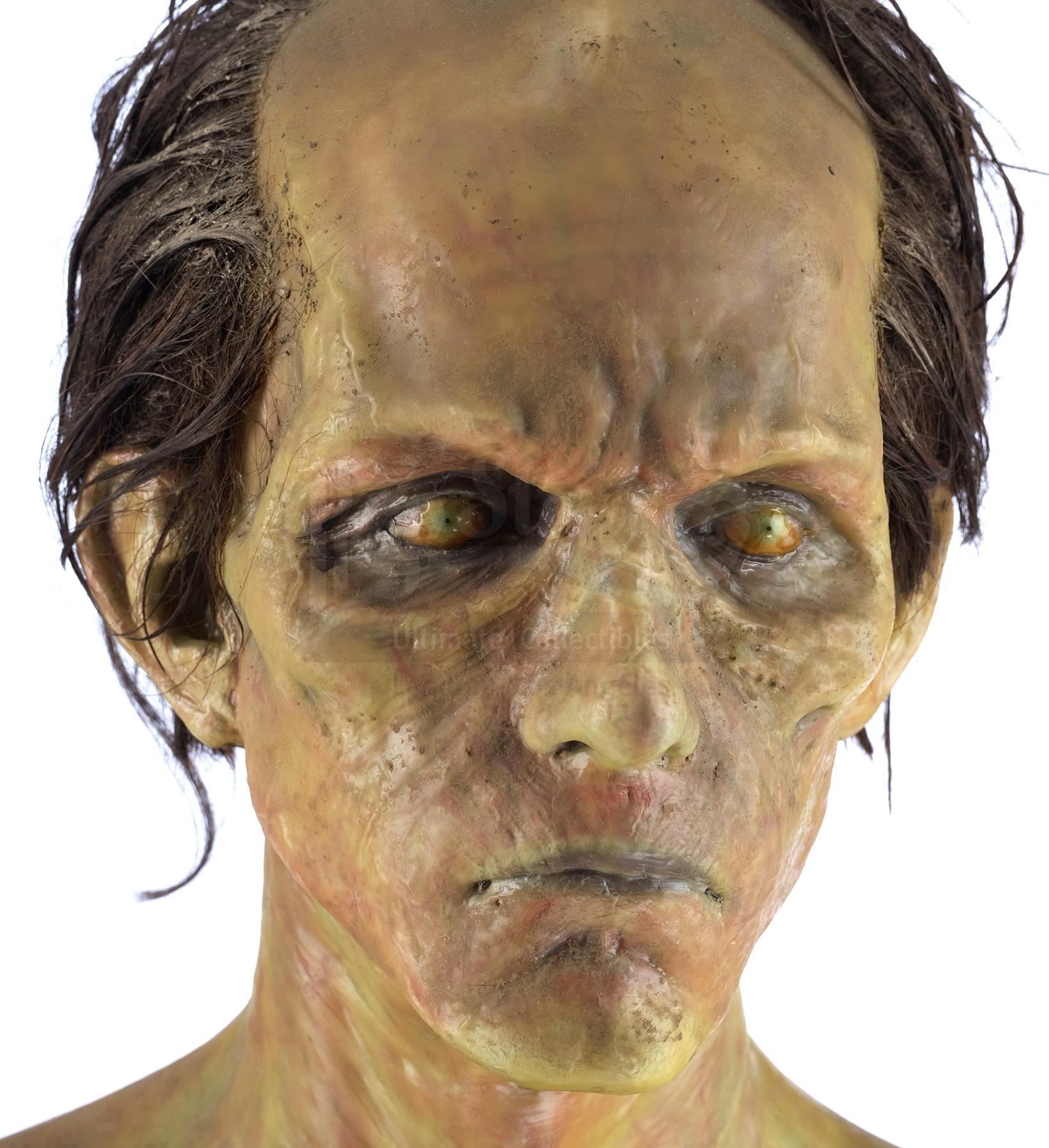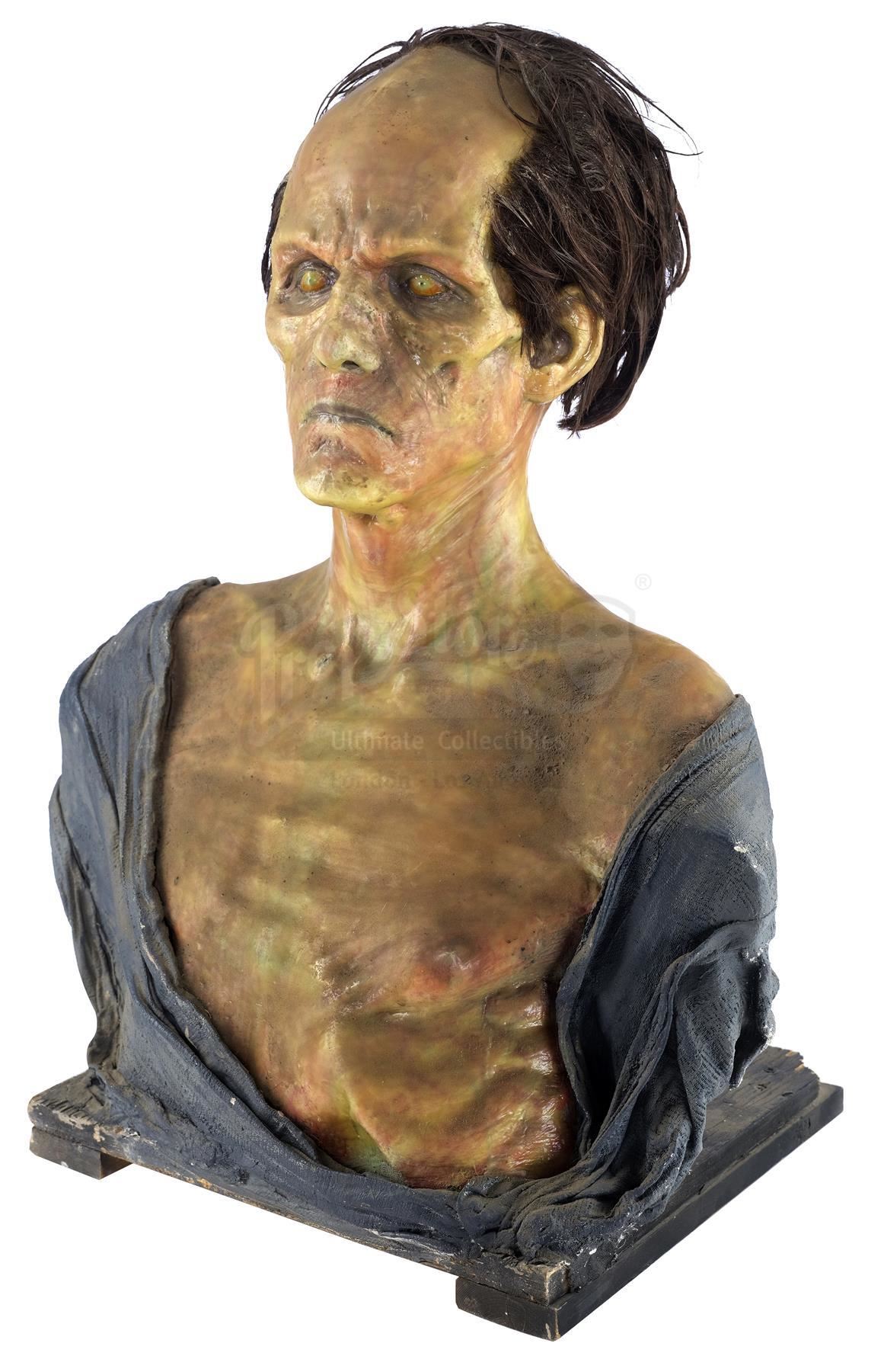 These three hand-painted clay makeup test busts made for the film's plague-infected characters were designed by Academy Award-winning special effects group Amalgamated Dynamics, Inc. (ADI). One is fitted with a wig with plaster molded on the shoulders to resemble a cloak. The set exhibits some paint chipping and cracking, but remains in good overall condition.