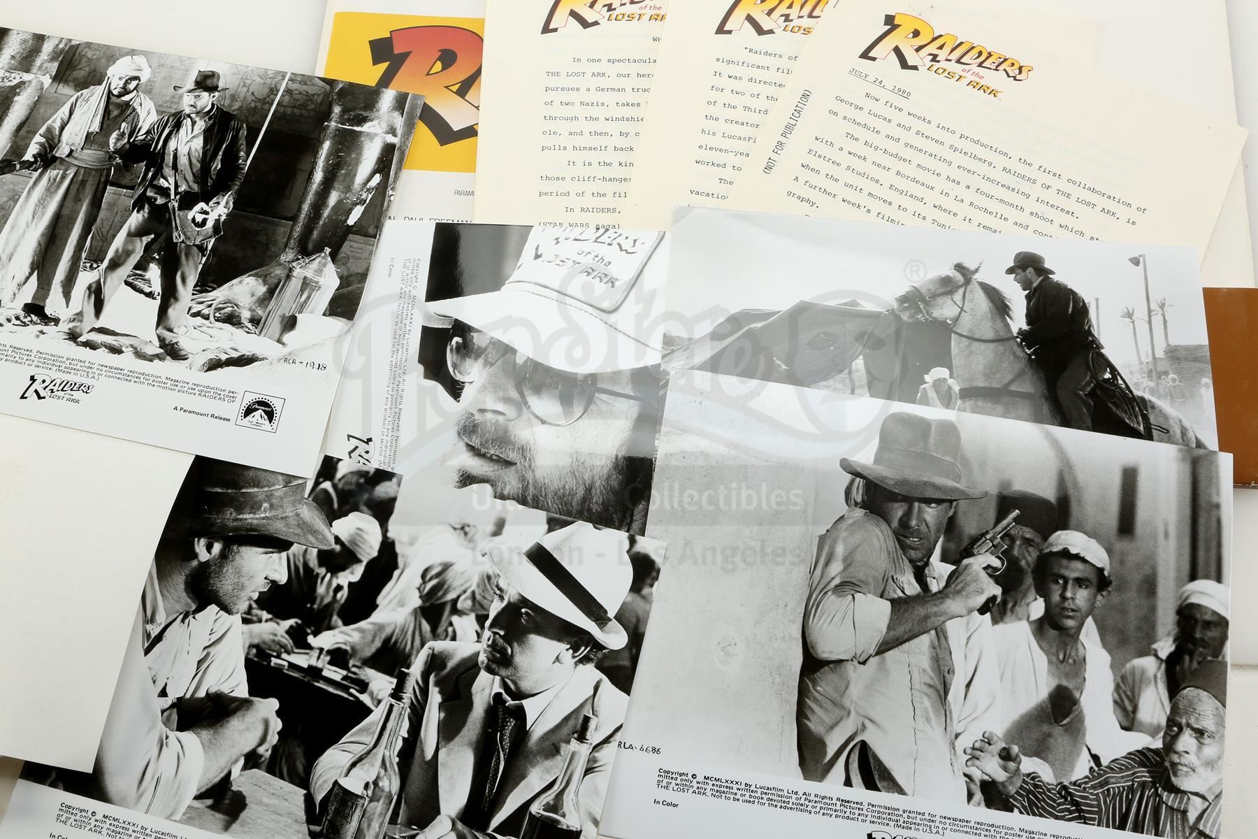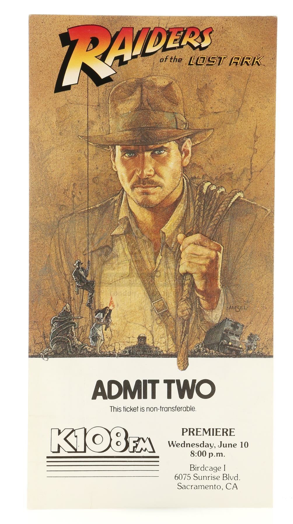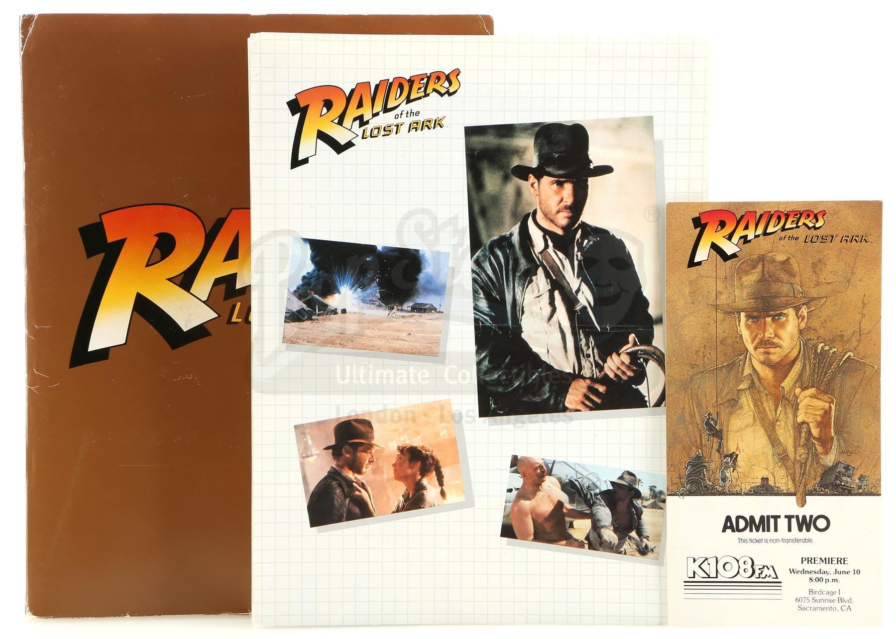 A press kit, premiere ticket, and script from Steven Spielberg's action-adventure classic Raiders of the Lost Ark. The press kit includes four press release packets, production notes, 15 black-and-white press stills, and a cast and crew booklet. The premiere ticket admitted two guests and is dated June 10th in Sacramento. The 102-page script is written by Lawrence Kasdan and is a third draft dated August 1979. The lot shows signs of wear from age, but it remains in very good overall condition.