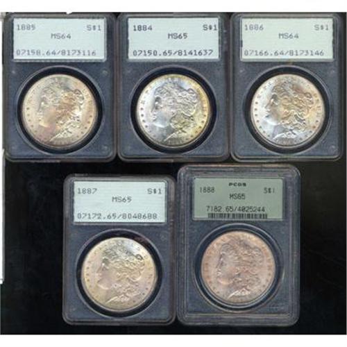 Lot of Five Mixed Dates Morgan Dollars. Includes: 1884 PCGS MS65, 1885 PCGS MS64, 1886 PCGS MS64, 1887 PCGS MS65 and 1888 PCGS MS65. (#7182)