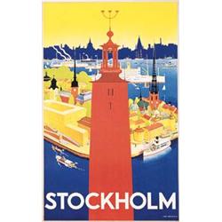 Architecturally speaking, Stockholm–built on several peninsulas and islands and often called the "Venice of the North”–is one of the finest cities in the world. Sweden’s capitol and largest city is situated where Lake M‰laren flows into the Baltic Sea. Its many famous landmarks include the new City Hall (built between 1911 and 1923), the Church of St. Nicholas or storkyrka (great church) dating from the 13th century, the Church of St. Gertrude and the Great Square, all of which are laid out by DonnÈr with silhouetted colorform tenacity for Stockhom’s Swedish Traffic Association.