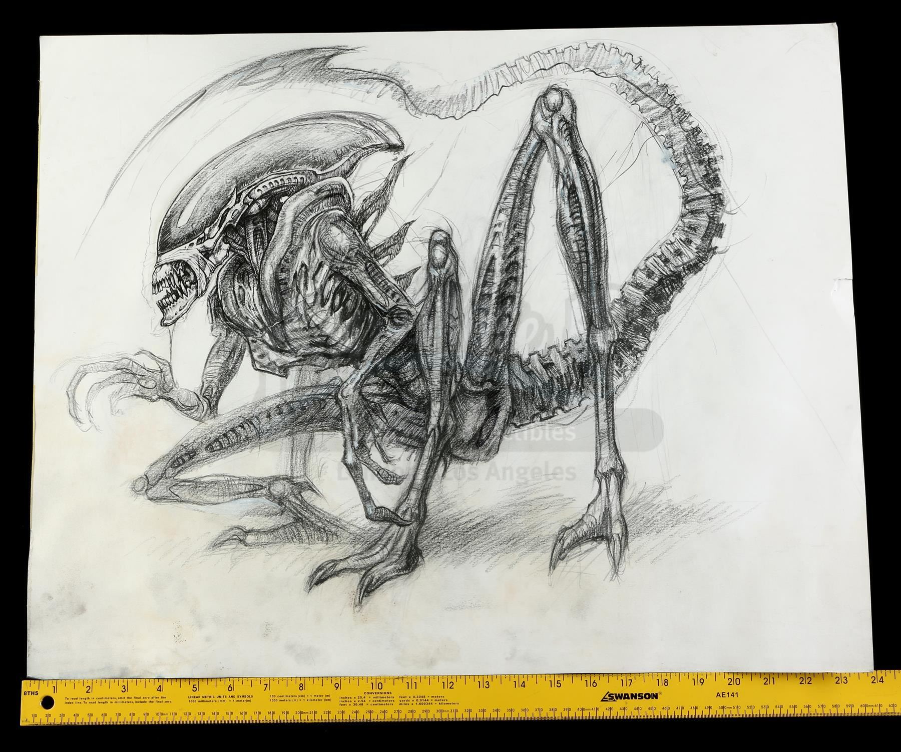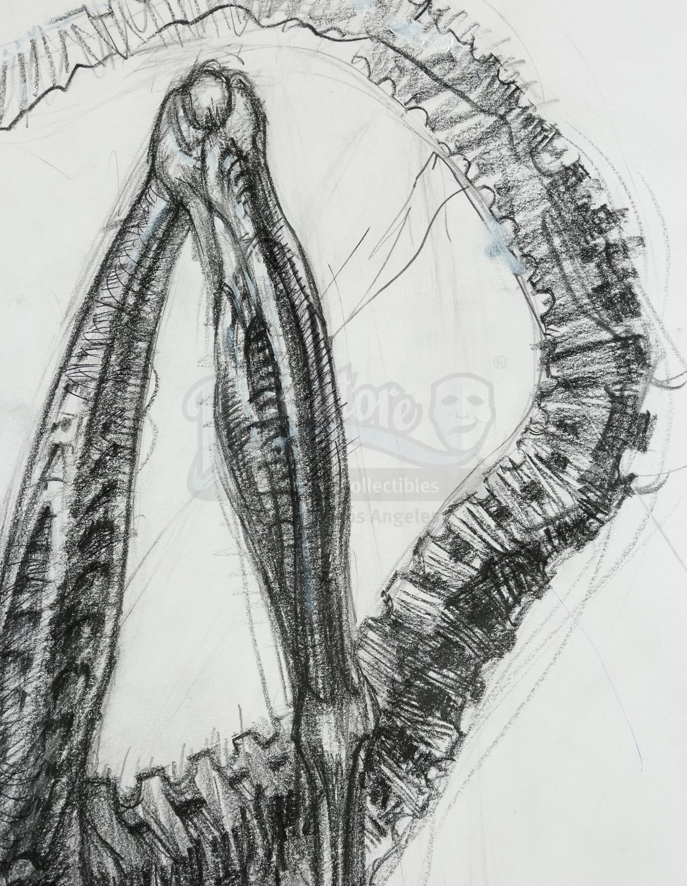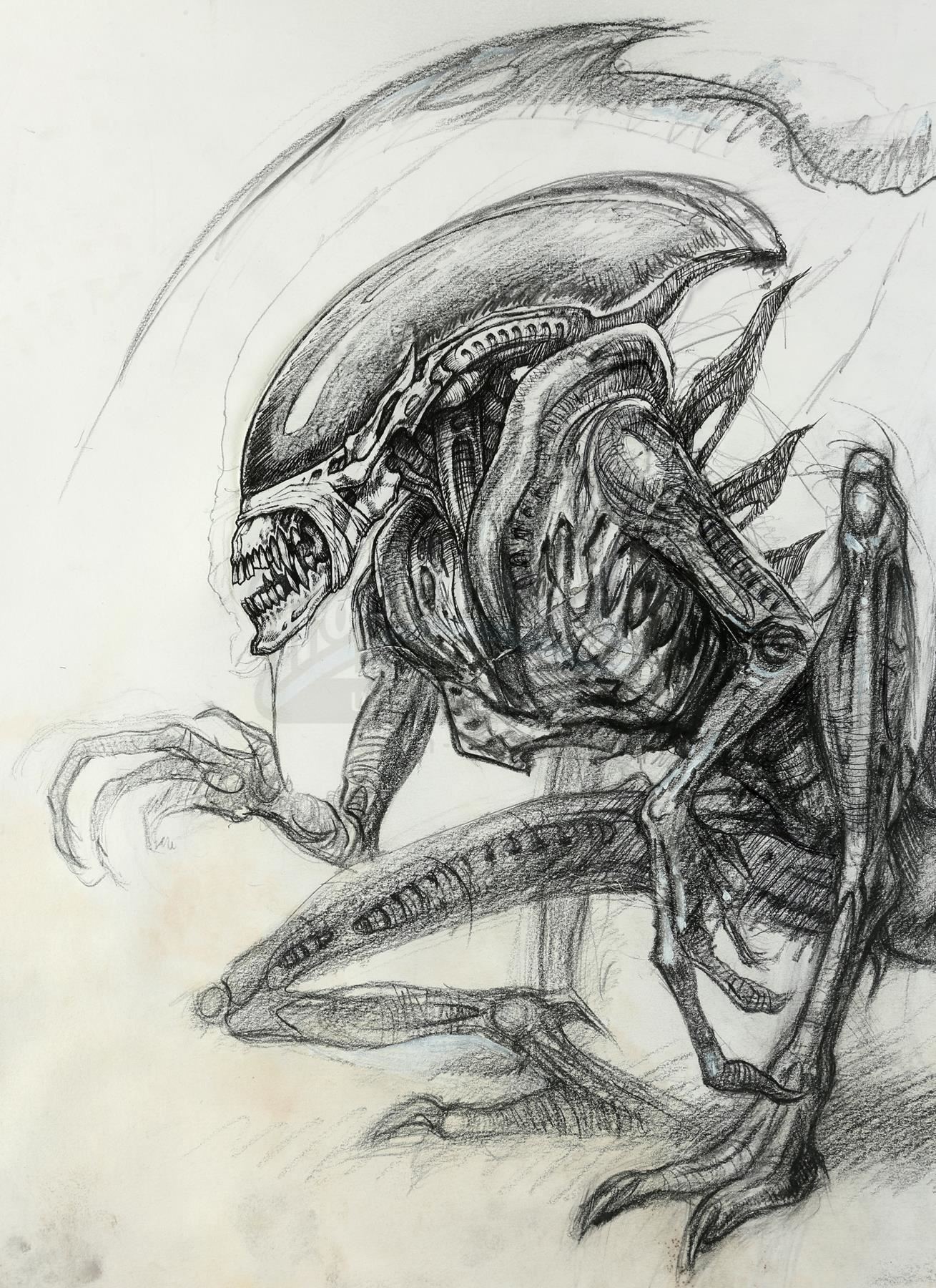 A large, hand-drawn xenomorph concept sketch from the production of JeanPierre Jeunet's sci-fi horror sequel Alien: Resurrection. Two hundred years after her death in Alien ³, Ripley (Sigourney Weaver) was cloned by the military, who all-too-successfully used her DNA to breed modified, newly deadly xenomorphs.
