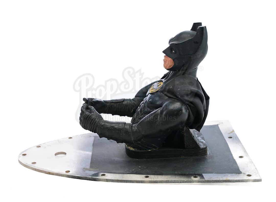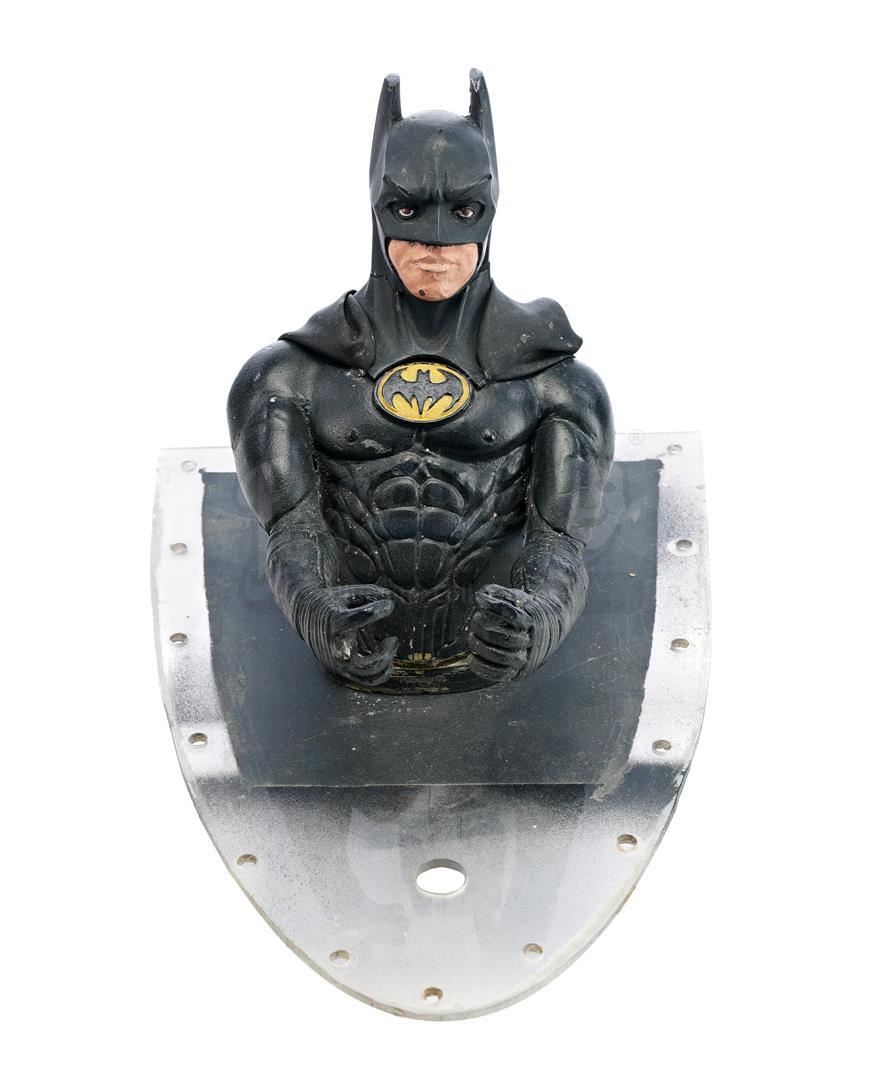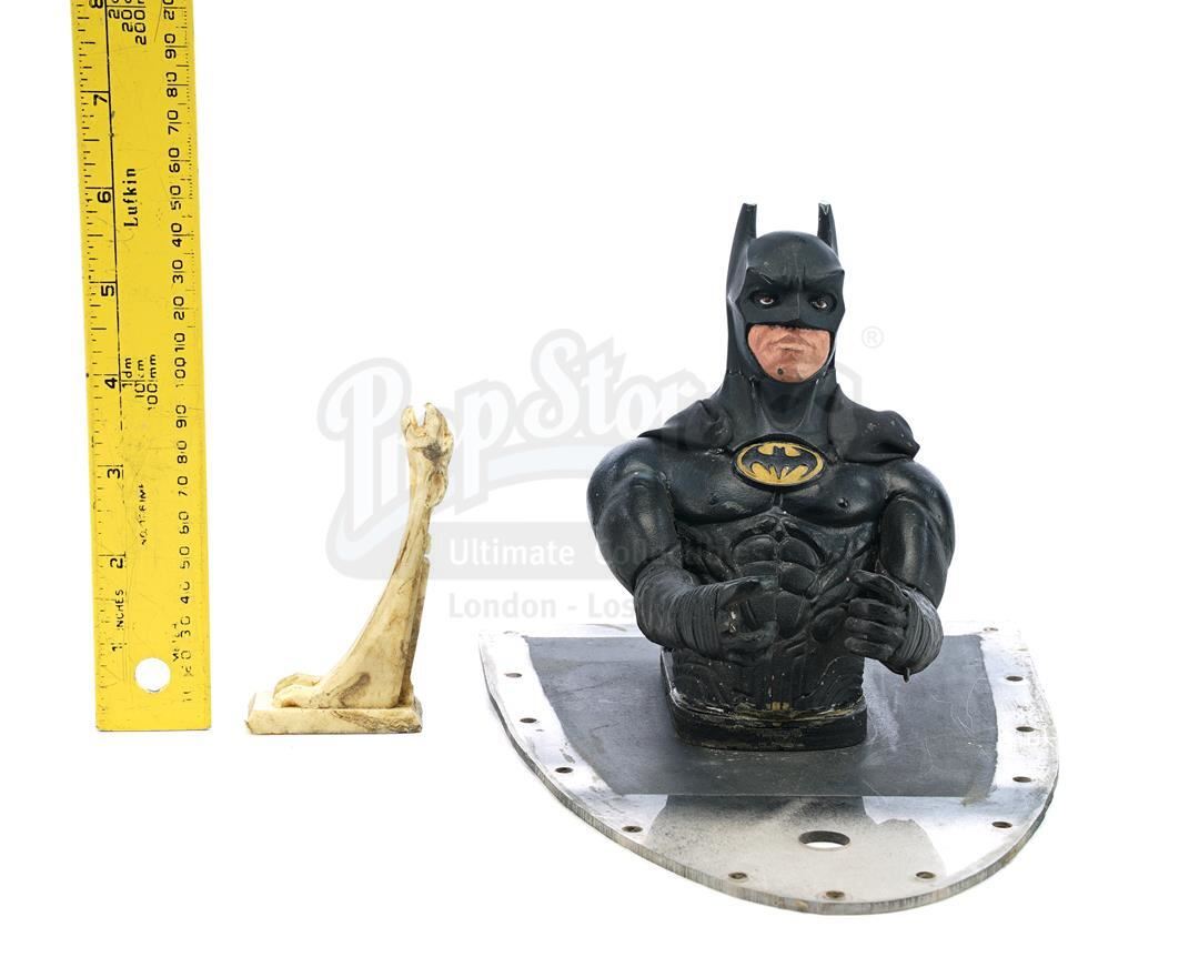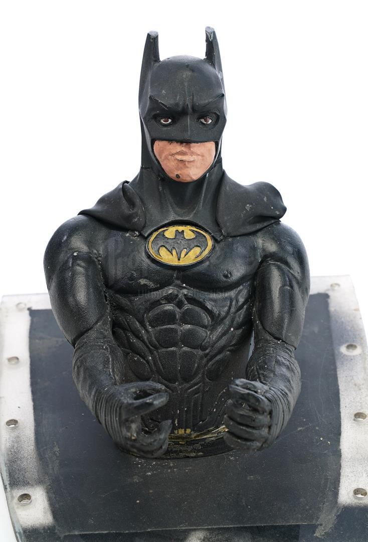 This lot will be auctioned on Tuesday, June 29th. The auction will begin at 9:00am PDT and lots are sold sequentially via live auctioneer; tune in to the live streaming broadcast on auction day to follow the pace. Note other lots in the auction may close on June 30th or July 1st. A Batman (Val Kilmer) model miniature from the Batwing cockpit with a gargoyle model miniature from Joel Schumacher's superhero sequel Batman Forever. Shots of the Batwing in flight were accomplished using highly detailed model miniatures. This lot consists of a painted resin figure of Batman's upper body with sculpted armor details, a fabric cape, and arms reaching out as if holding the Batwing's flight controls, as well as an unpainted resin gargoyle model miniature. Batman is affixed to an acrylic plate with holes for attaching it to the interior of the Batwing. The lot is in good overall condition with Batman missing a finger, scuffing, and broken tips on the cowl's ears from production. Dimensions (largest): 10" x 10" x 10" (25.5 cm x 25.5 cm x 25.5 cm); (smallest): 2" x 1" x 4" (5 cm x 2.5 cm x 10.25 cm) Estimate: $2,000 - 3,000