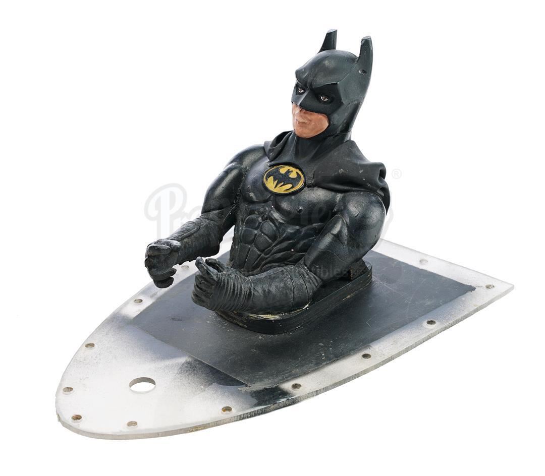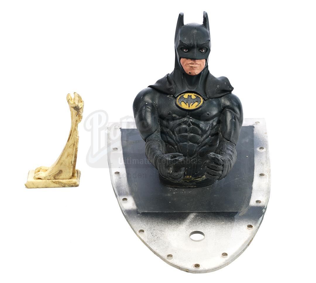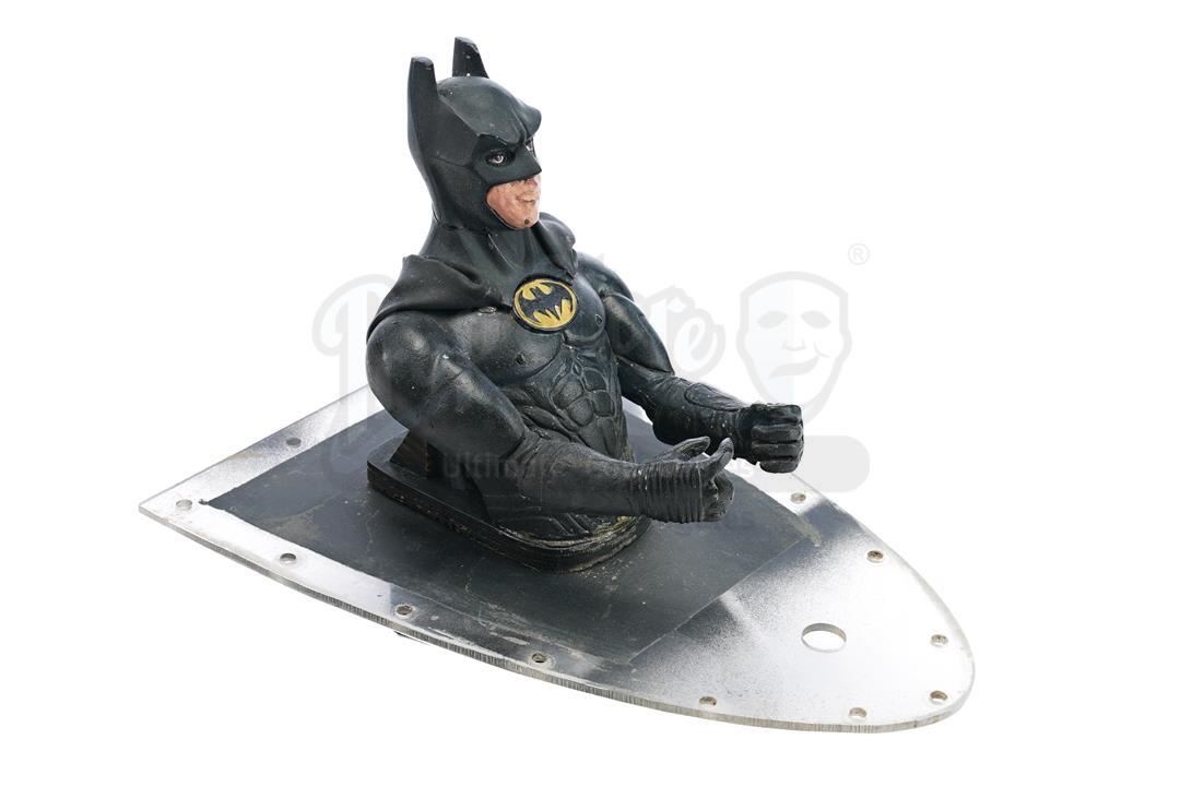This lot will be auctioned on Tuesday, June 29th. The auction will begin at 9:00am PDT and lots are sold sequentially via live auctioneer; tune in to the live streaming broadcast on auction day to follow the pace. Note other lots in the auction may close on June 30th or July 1st. A Batman (Val Kilmer) model miniature from the Batwing cockpit with a gargoyle model miniature from Joel Schumacher's superhero sequel Batman Forever. Shots of the Batwing in flight were accomplished using highly detailed model miniatures. This lot consists of a painted resin figure of Batman's upper body with sculpted armor details, a fabric cape, and arms reaching out as if holding the Batwing's flight controls, as well as an unpainted resin gargoyle model miniature. Batman is affixed to an acrylic plate with holes for attaching it to the interior of the Batwing. The lot is in good overall condition with Batman missing a finger, scuffing, and broken tips on the cowl's ears from production. Dimensions (largest): 10" x 10" x 10" (25.5 cm x 25.5 cm x 25.5 cm); (smallest): 2" x 1" x 4" (5 cm x 2.5 cm x 10.25 cm) Estimate: $2,000 - 3,000