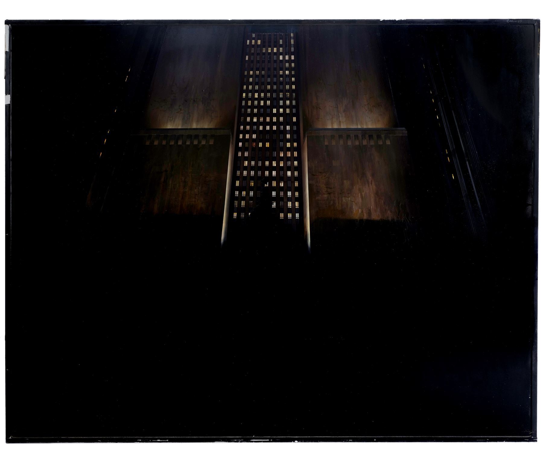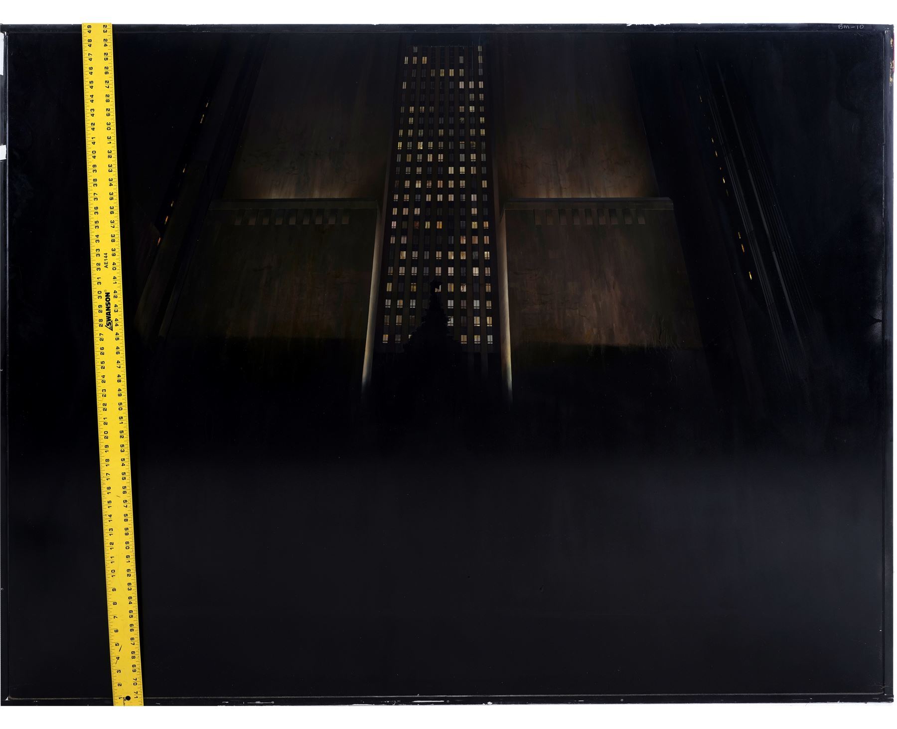 This lot consists of one oversize matte painting on a framed glass panel. It features a hand-painted image of a skyscraper front with a wall of windows and art deco-inspired buttresses, with a darkened Christmas tree-shaped space in front. It also features a hand-marked "BM-10" in the corner. This lot exhibits chipped paint, smudges, and lifted tape. Dimensions: 49.5" x 61" x 1" (125.75 cm x 155 cm x 2.5 cm)