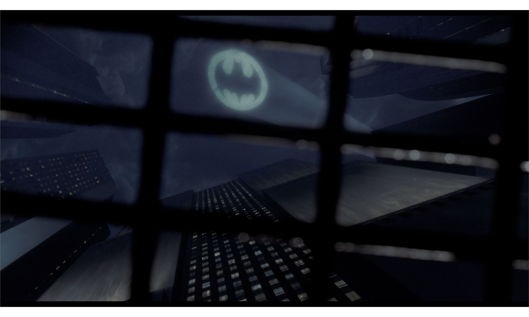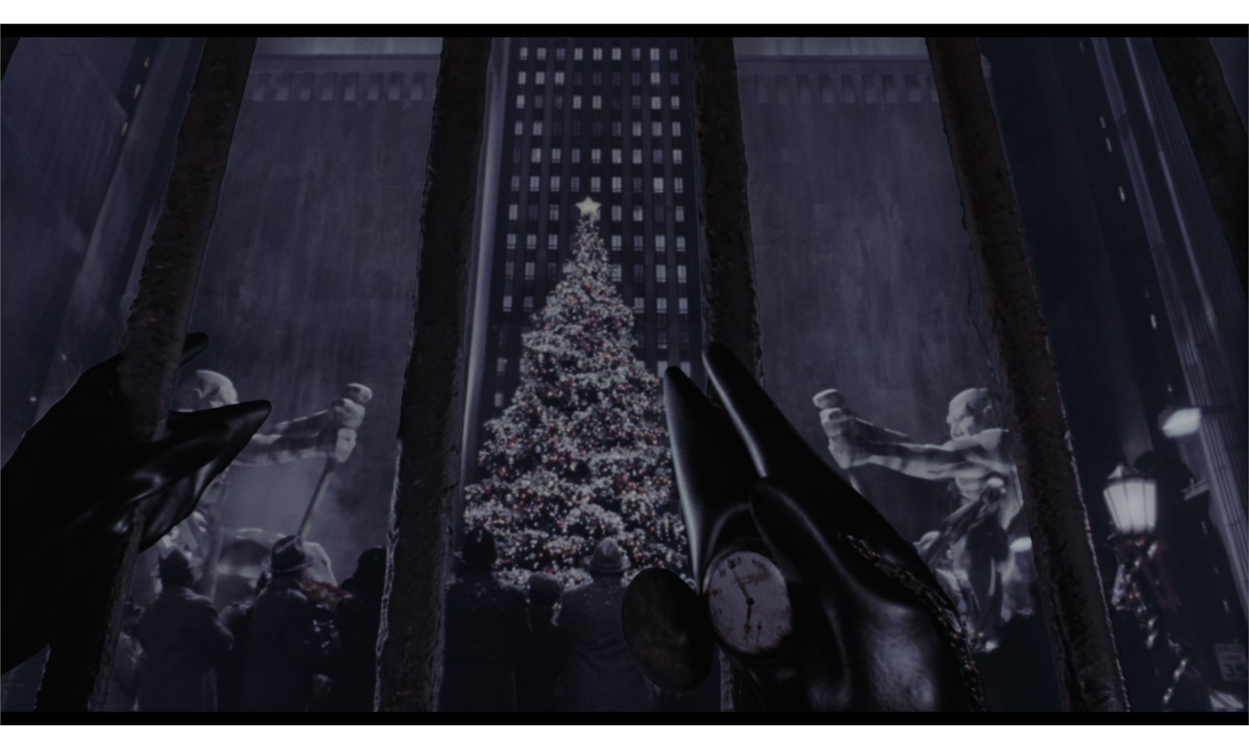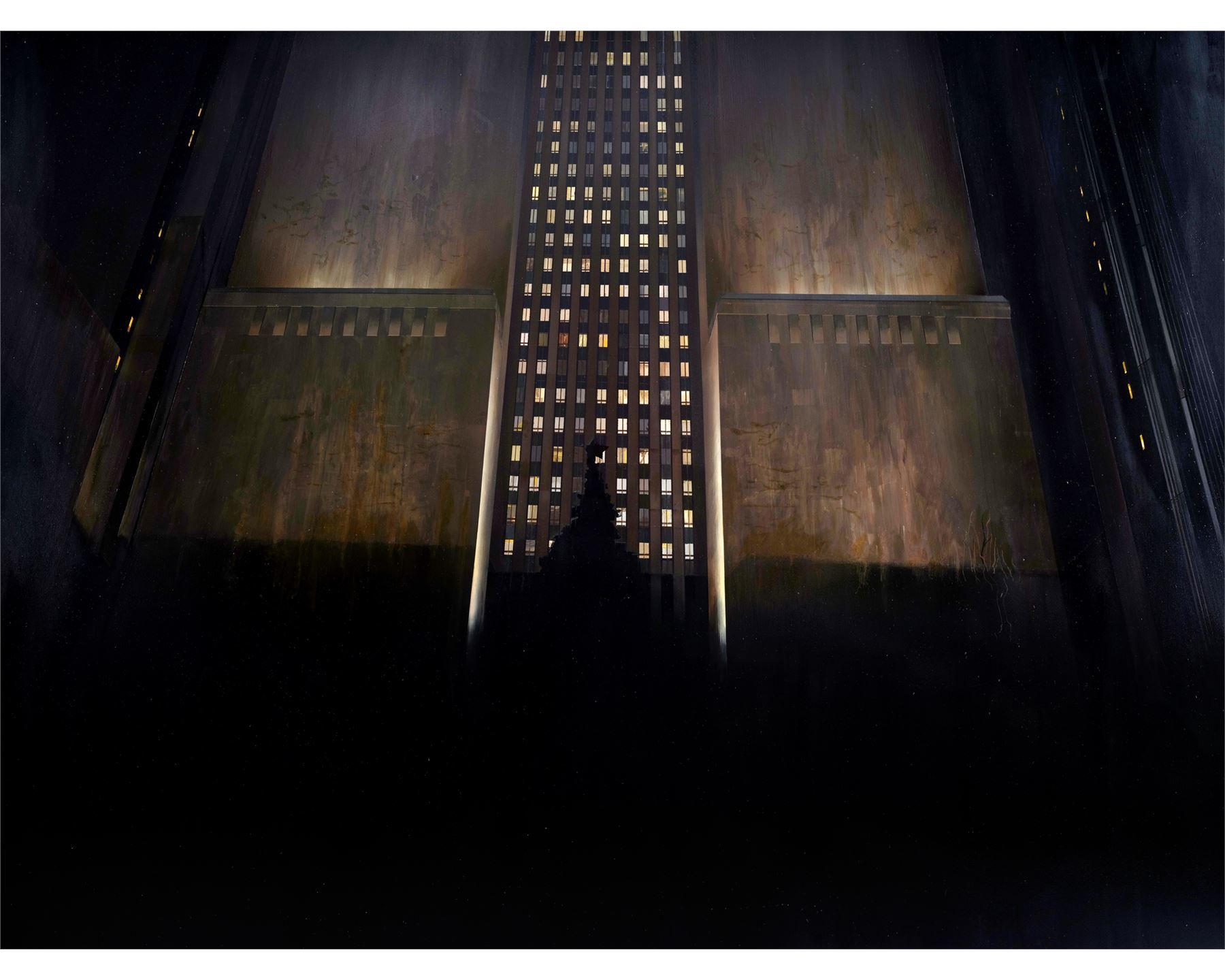 BATMAN RETURNS (1992) - Hand-Painted Brian Flora Gotham City Building Matte Painting - A Gotham City building matte painting hand-painted by Brian Flora for Tim Burton's superhero sequel Batman Returns. Buildings loomed over Gotham Plaza during the tree lighting ceremony while the Penguin (Danny DeVito) watched from the sewers.