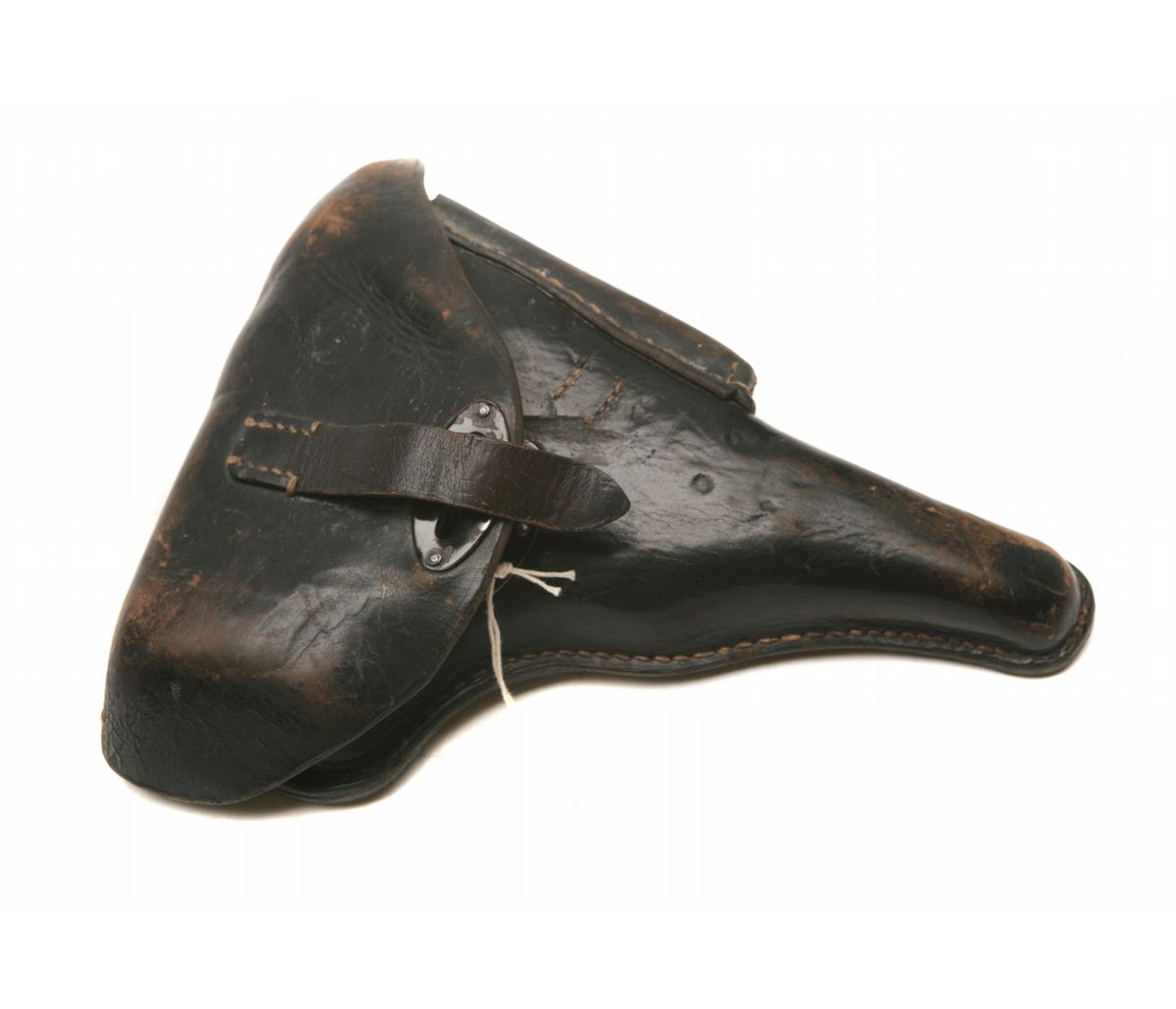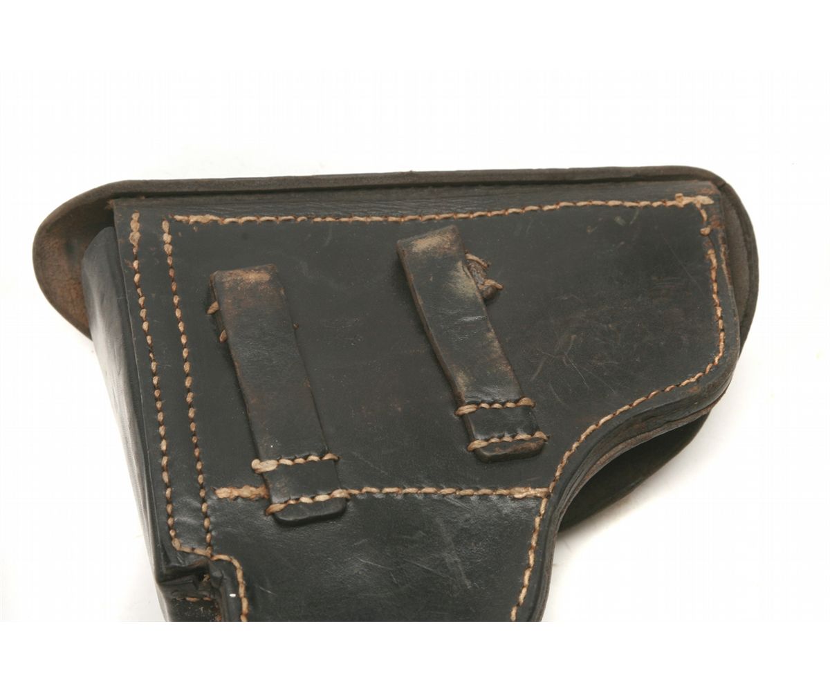 Black leather flap holster with mag pocket - inner lift strap detached from front - rear marked with 9 on leaf on bear skin 1943 (Christof Neuner in Austria - logo not often found on P38 holsters) and WaA938 - moderate wear - missing one rivet from closure hook - non-ffl - 25CRRMA054