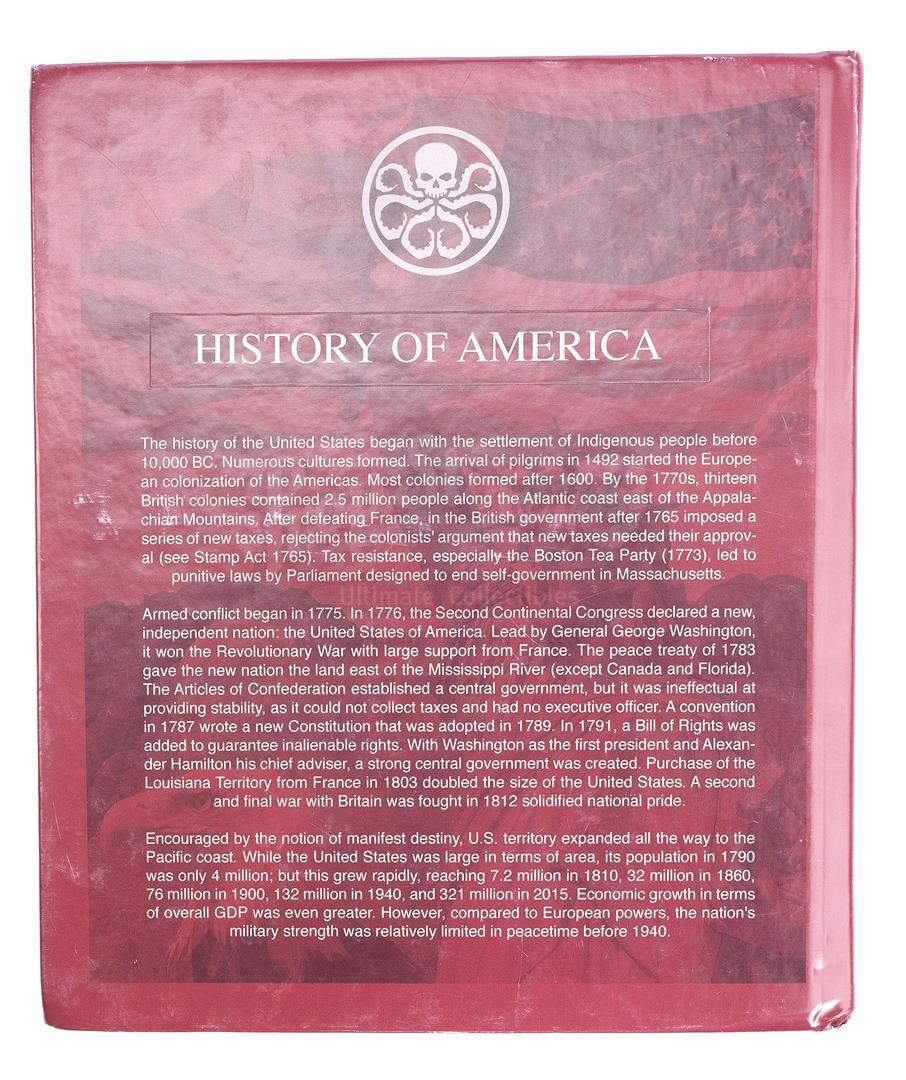 Ruby Hale's Hydra Preparatory Academy uniform components with backpack and schoolbooks from the episode 'Rise and Shine' (515) of Marvel's Agents of S.H.I.E.L.D. In the episode, Hale attends a school for students who will become future members of Hydra. This lot consists of a black polyester and wool blend uniform blazer emblazoned with a black, red, and white Hydra patch, a white cotton button-up dress shirt, a black and burgundy silk blend tie, a pair of white cotton socks, a black cotton and nylon backpack, a black urethane and metal binder featuring lined paper, a black and white notebook marked 'RUBY HALE' on the front, and a paper and cardboard history textbook with a customized cover featuring several Hydra symbols. It is in excellent overall condition with minor wear from production.