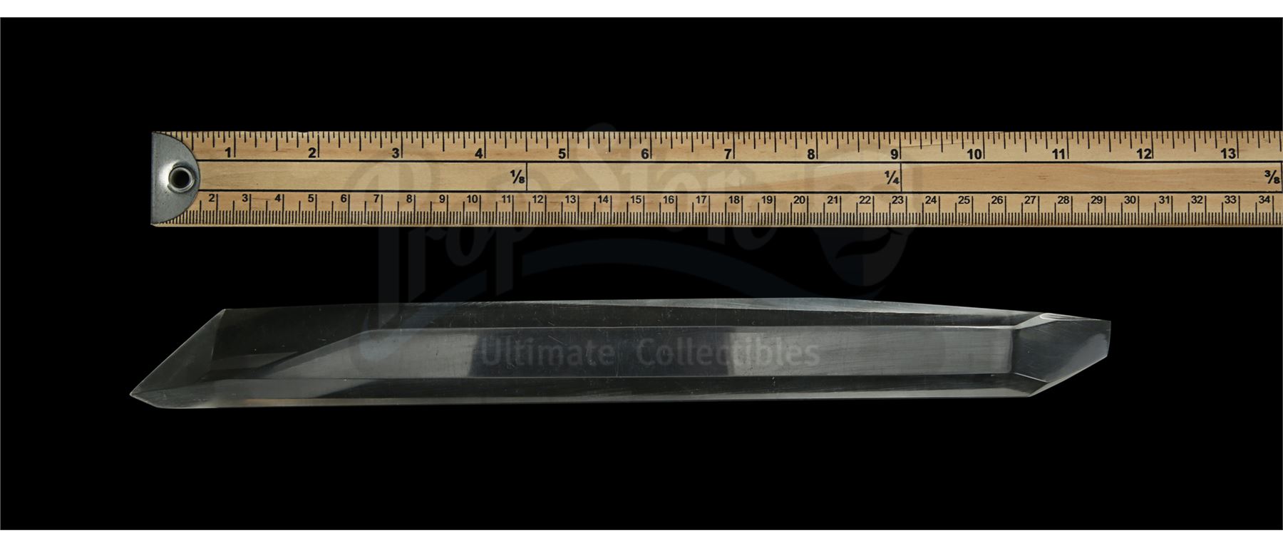 This lot will be auctioned on Tuesday, June 29th. The auction will begin at 9:00am PDT and lots are sold sequentially via live auctioneer; tune in to the live streaming broadcast on auction day to follow the pace. Note other lots in the auction may close on June 30th or July 1st. A Fortress of Solitude crystal from Richard Donner's superhero film Superman. Crystals were seen in Superman's (Christopher Reeve) otherworldly Arctic retreat when he summoned the consciousness of his father Jor-El (Marlon Brando). The crystal shard is made of clear resin and features uneven pointed ends. There are minor signs of wear from production use, including light surface scratches and scuff marks. Dimensions: 11.5" x 1.25" x .75" (29 cm x 3 cm x 2 cm) Estimate: $2,000 - 3,000