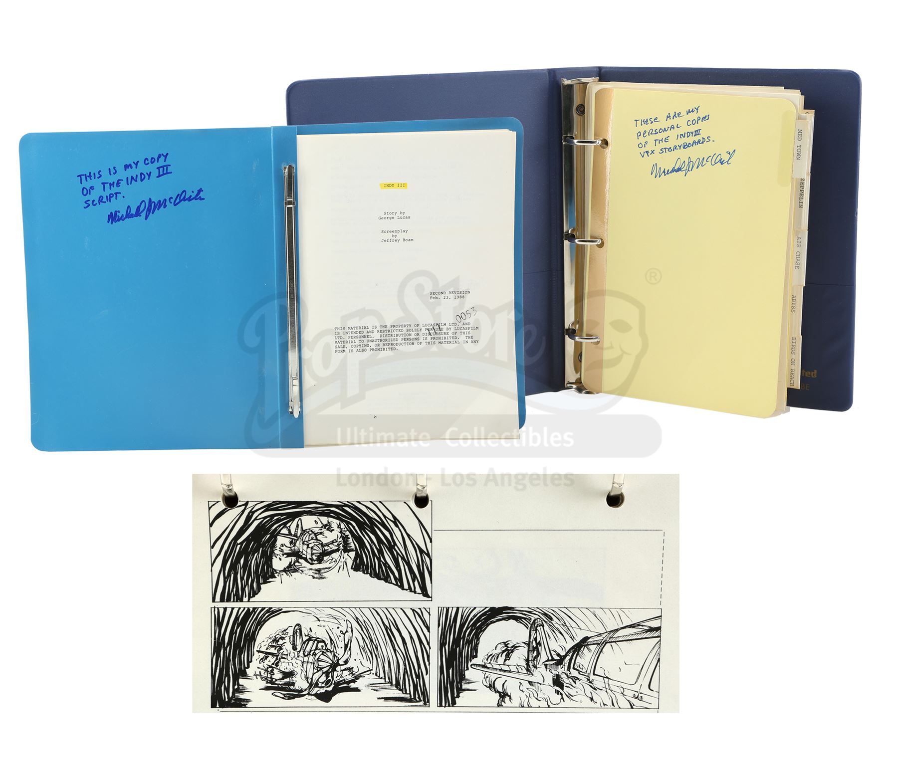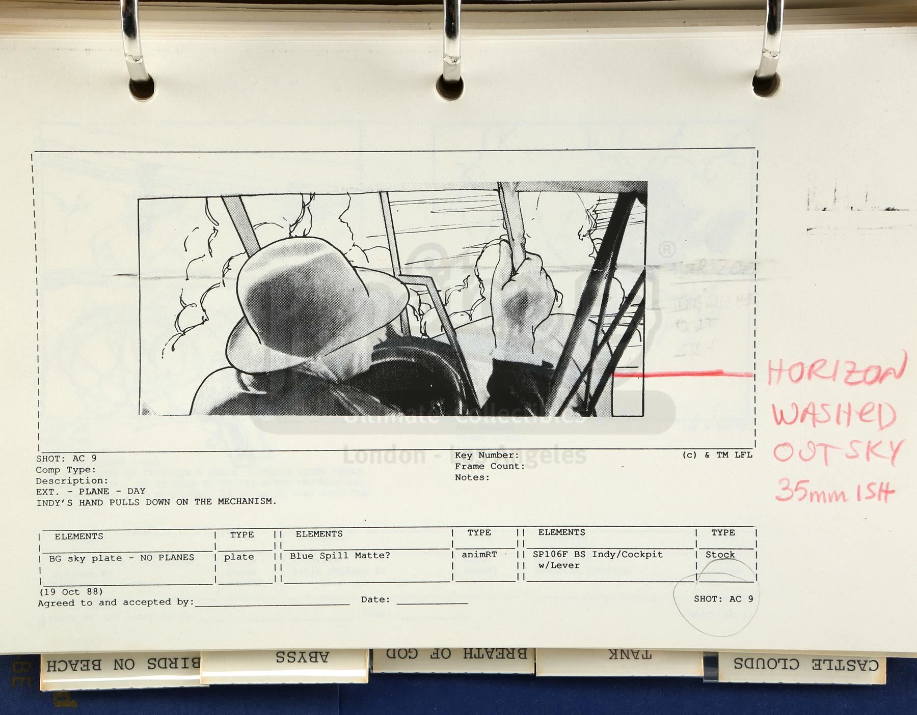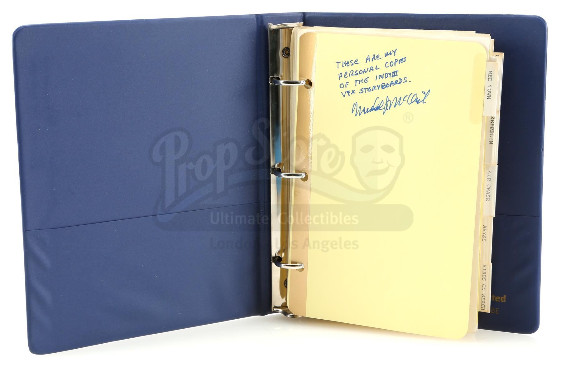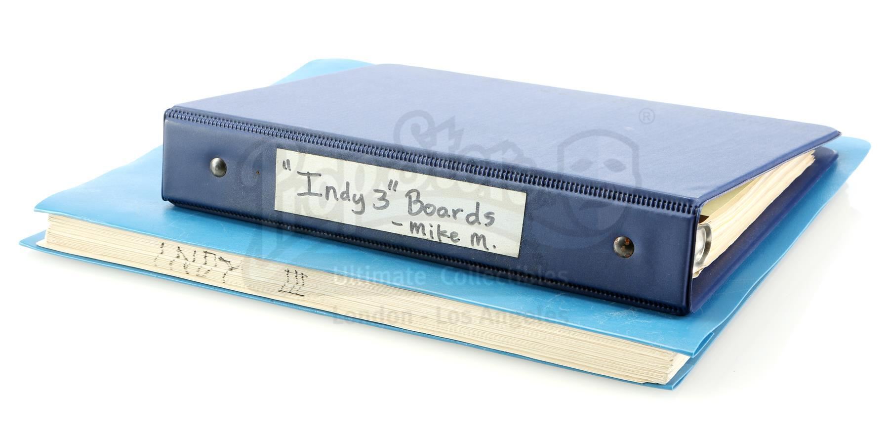 The small binder consists of 74 mini storyboard copies divided by multiple VFX sequences. The binder also features a handwritten note from the film's VFX supervisor reading "These are my personal copies of the INDY III VFX storyboards" concluded with his signature.