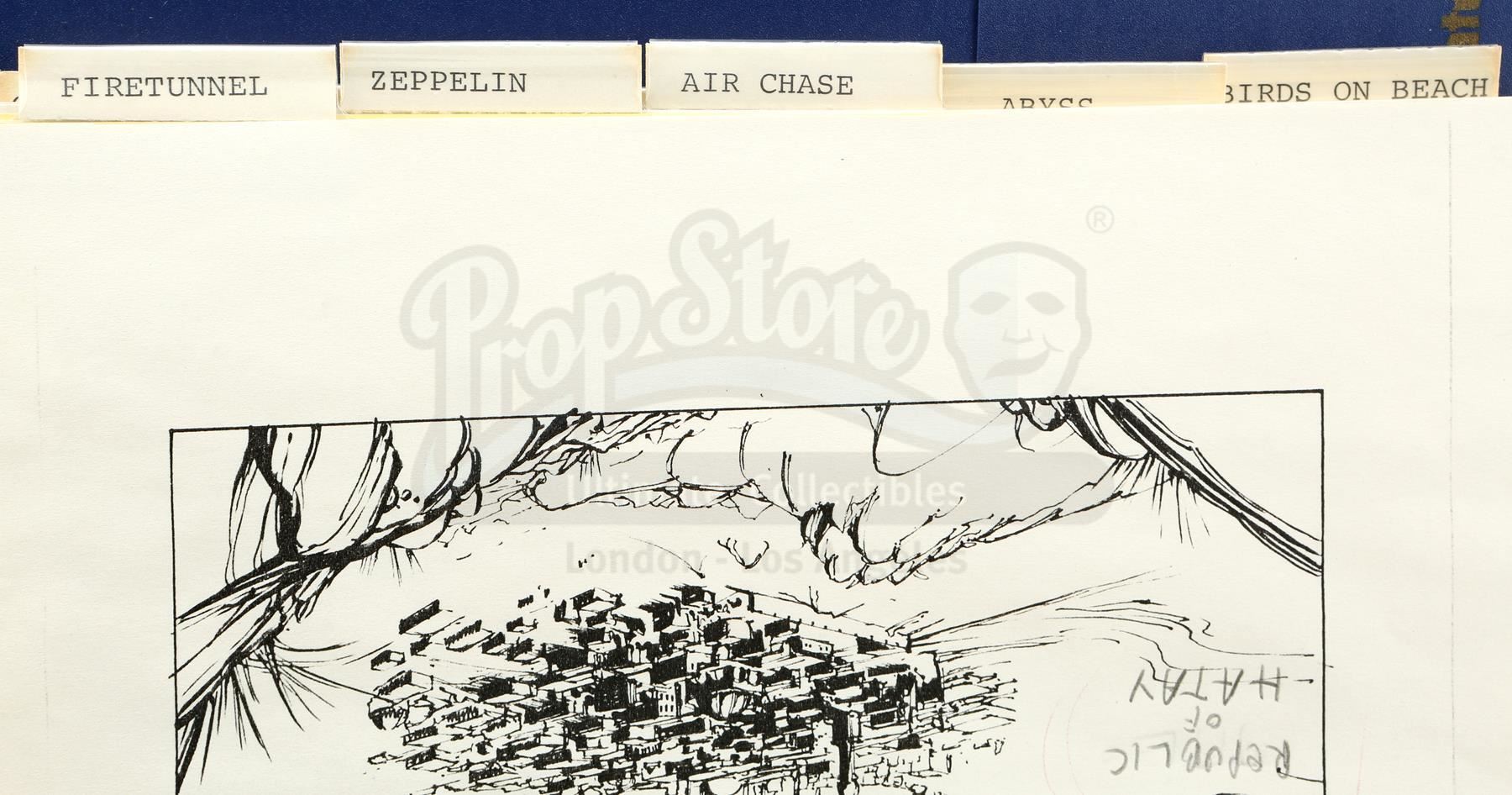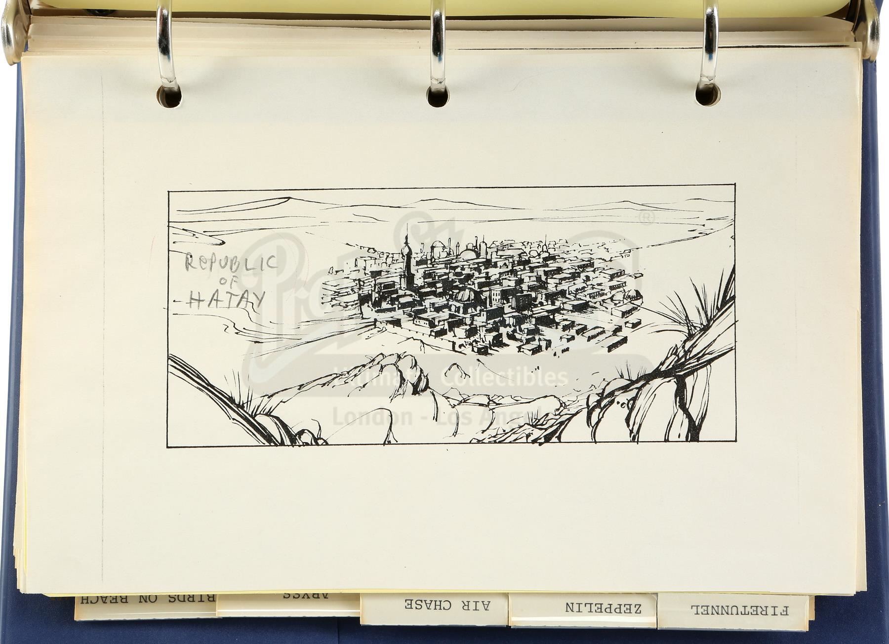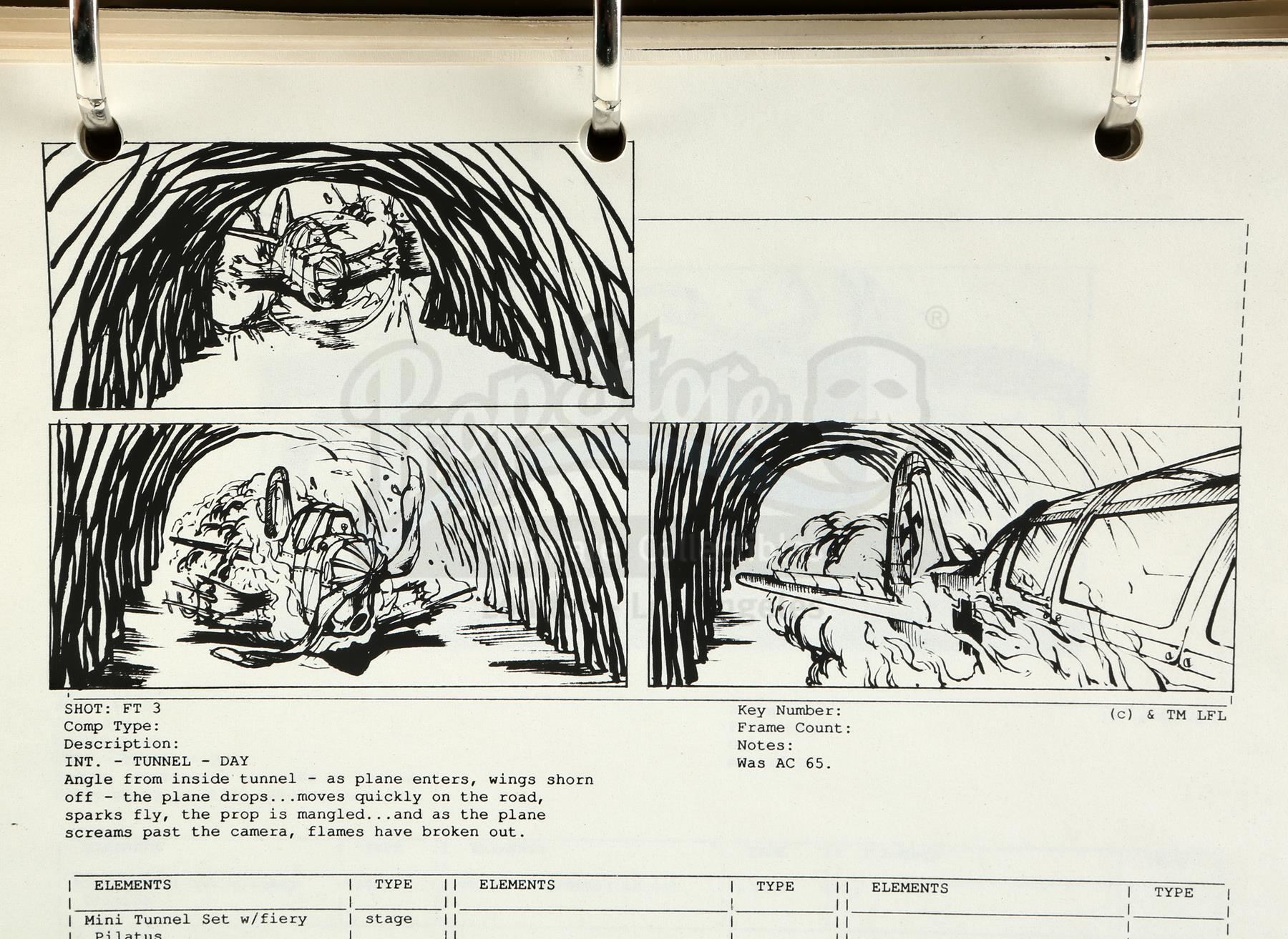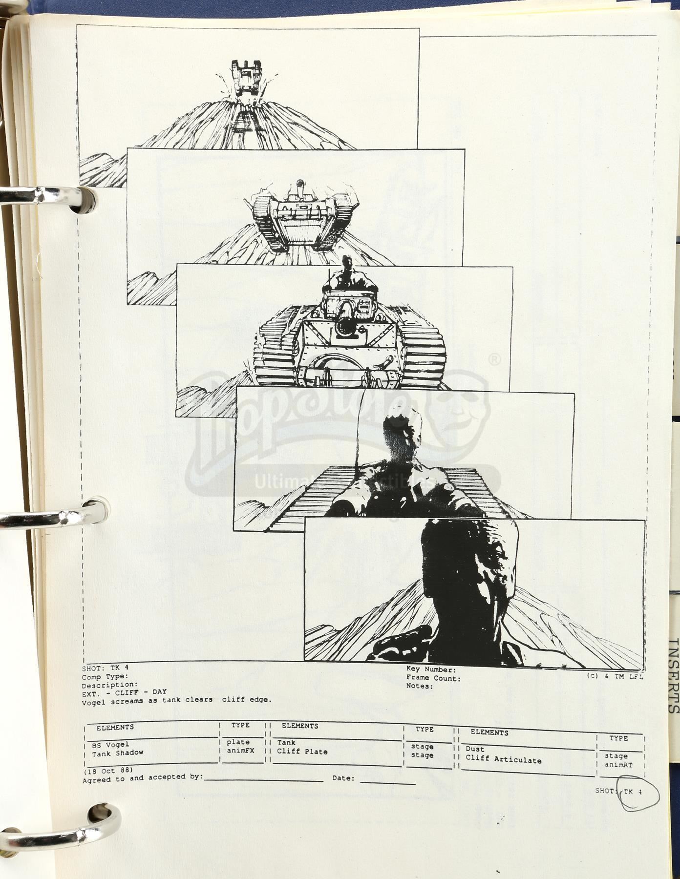 The small binder consists of 74 mini storyboard copies divided by multiple VFX sequences. The binder also features a handwritten note from the film's VFX supervisor reading "These are my personal copies of the INDY III VFX storyboards" concluded with his signature.