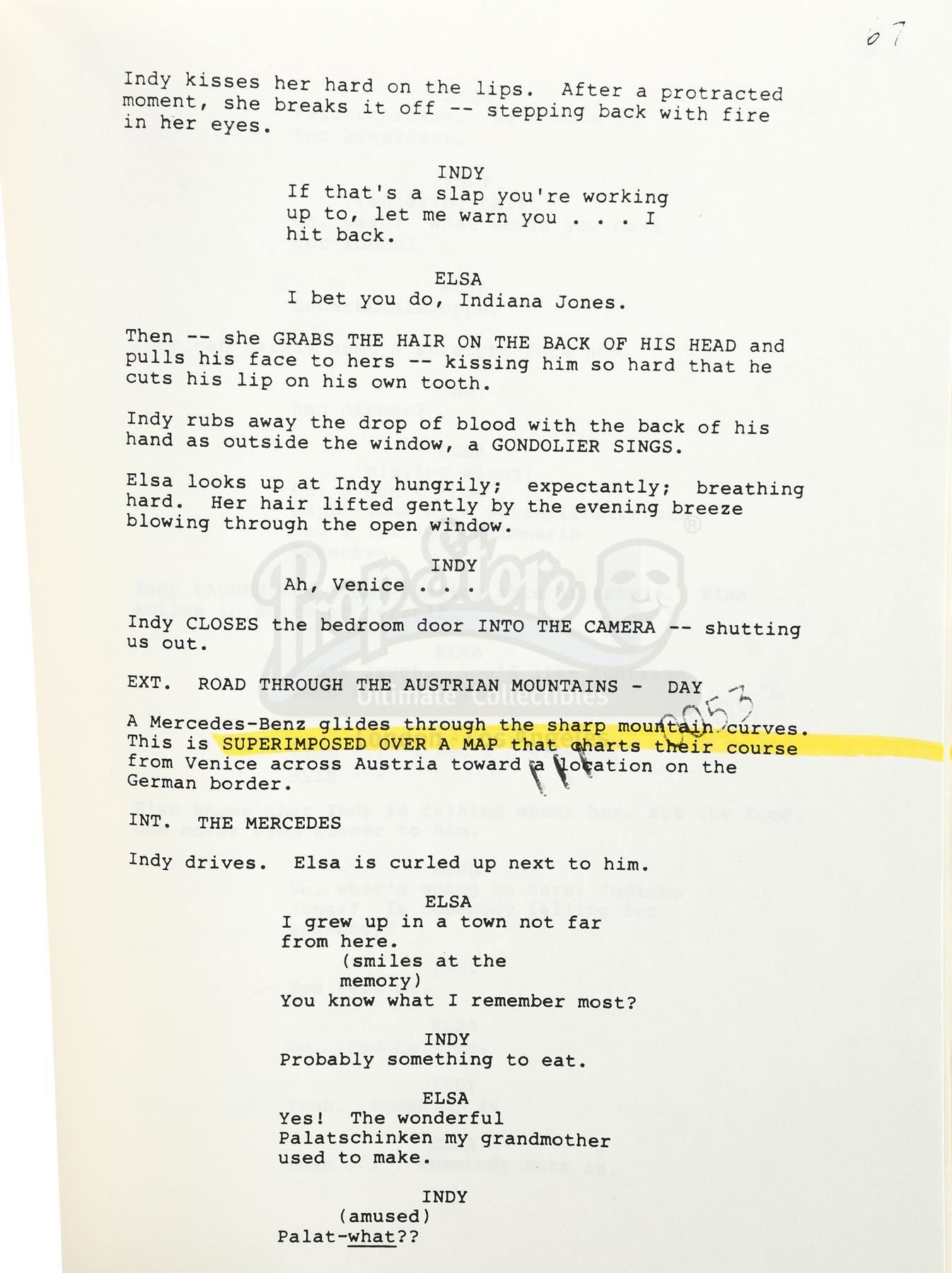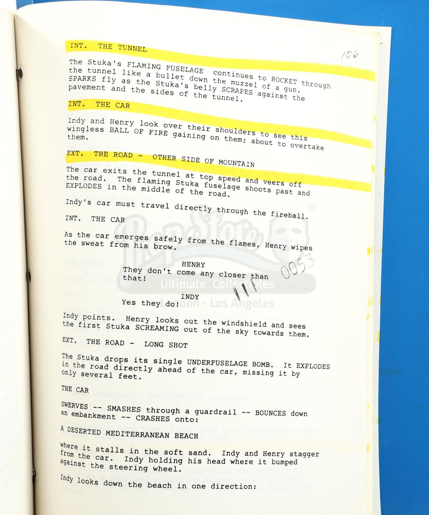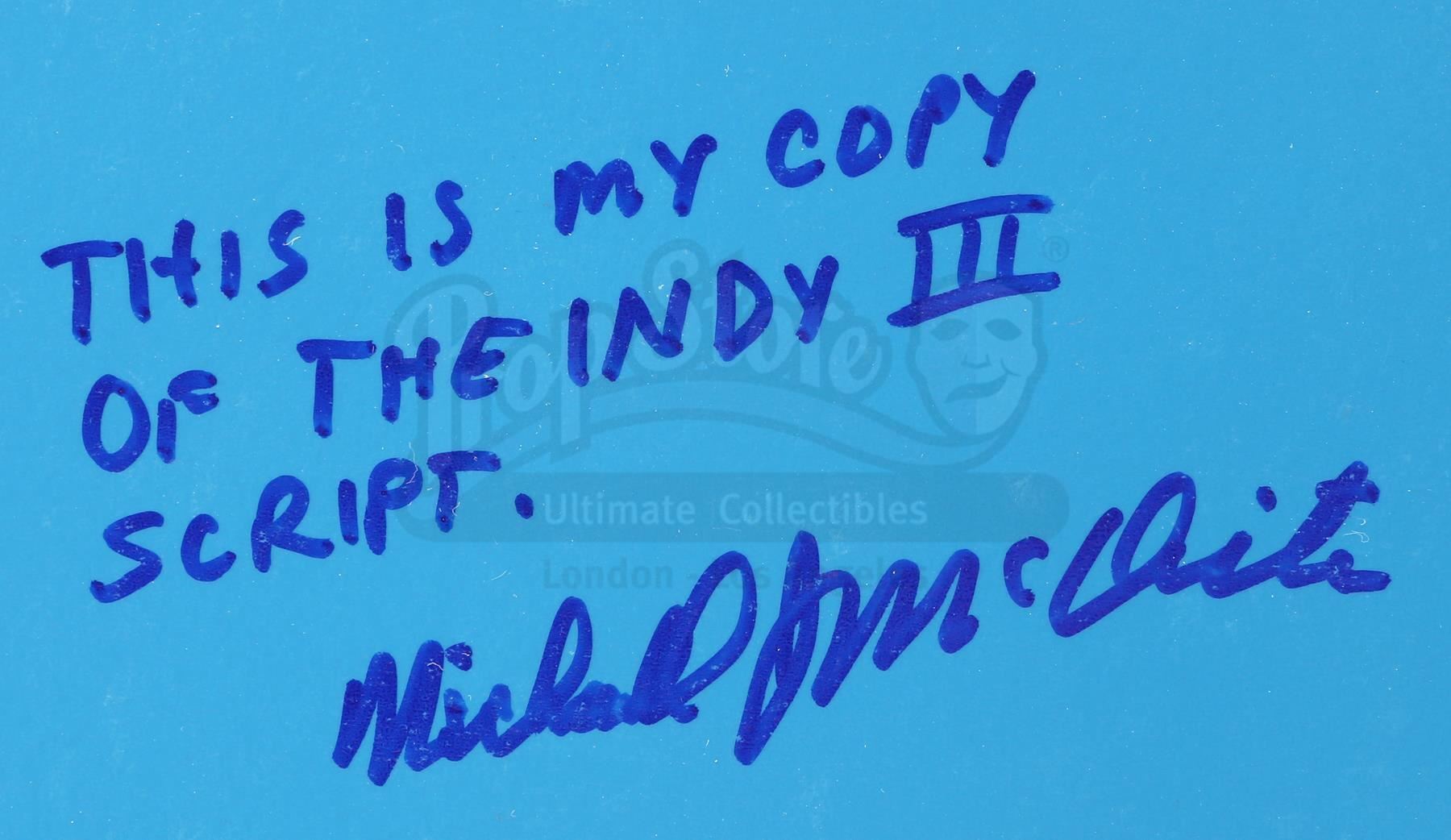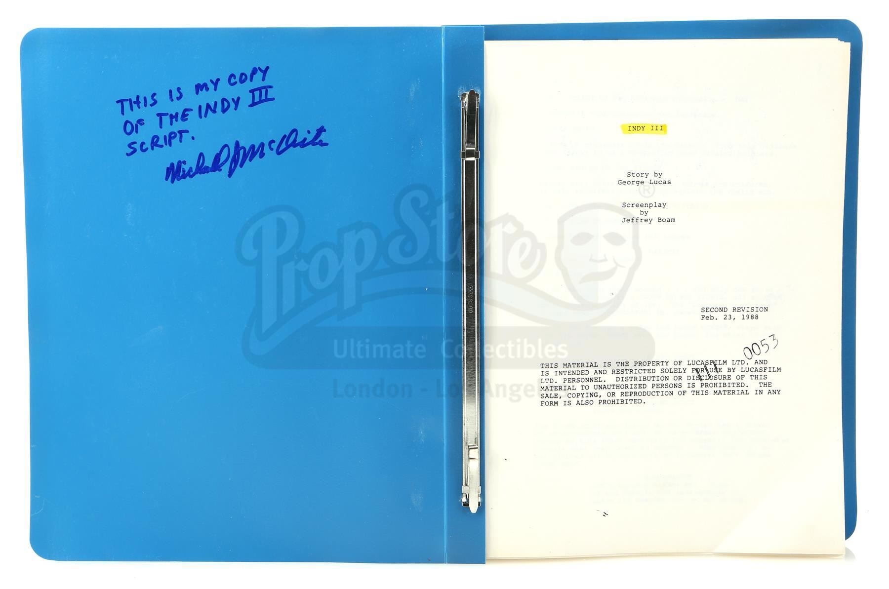 Visual effects supervisor Michael McAlister's production script and storyboards from Steven Spielberg's action-adventure sequel Indiana Jones and the Last Crusade. The script, written by Jefferey Boam, consists of 135 pages and is dated February 23, 1988. The script is titled "Indy III" and is signed by the film's VFX supervisor Michael McAlister, with a handwritten inscription that reads "This is my copy of the Indy III script." The second draft script is bound within a blue folder and features highlighted portions of scene description throughout.