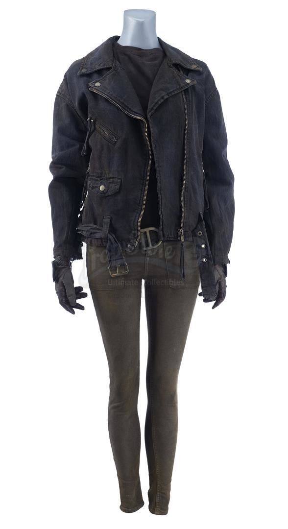 Elena 'Yo-Yo' Rodriguez's destruction of Earth flashback costume from the episode 'The Last Day' (508) of Marvel's Agents of S.H.I.E.L.D. In a flashback within the episode, Rodriguez wears her costume while mounting a final attack on the invading Kree against the advice of Melinda May and a young version of Robin. This lot consists of black denim jacket with metal zippers and studs, a black blended-fabric long sleeve shirt, black and gray leatherette gloves, a pair of black cotton blend jeans, and a black nylon blend belt marked 'Yo-Yo'. The costume has been intentionally weathered by production with some scuffing and light staining throughout. The lot is in excellent overall condition with minimal wear from production.