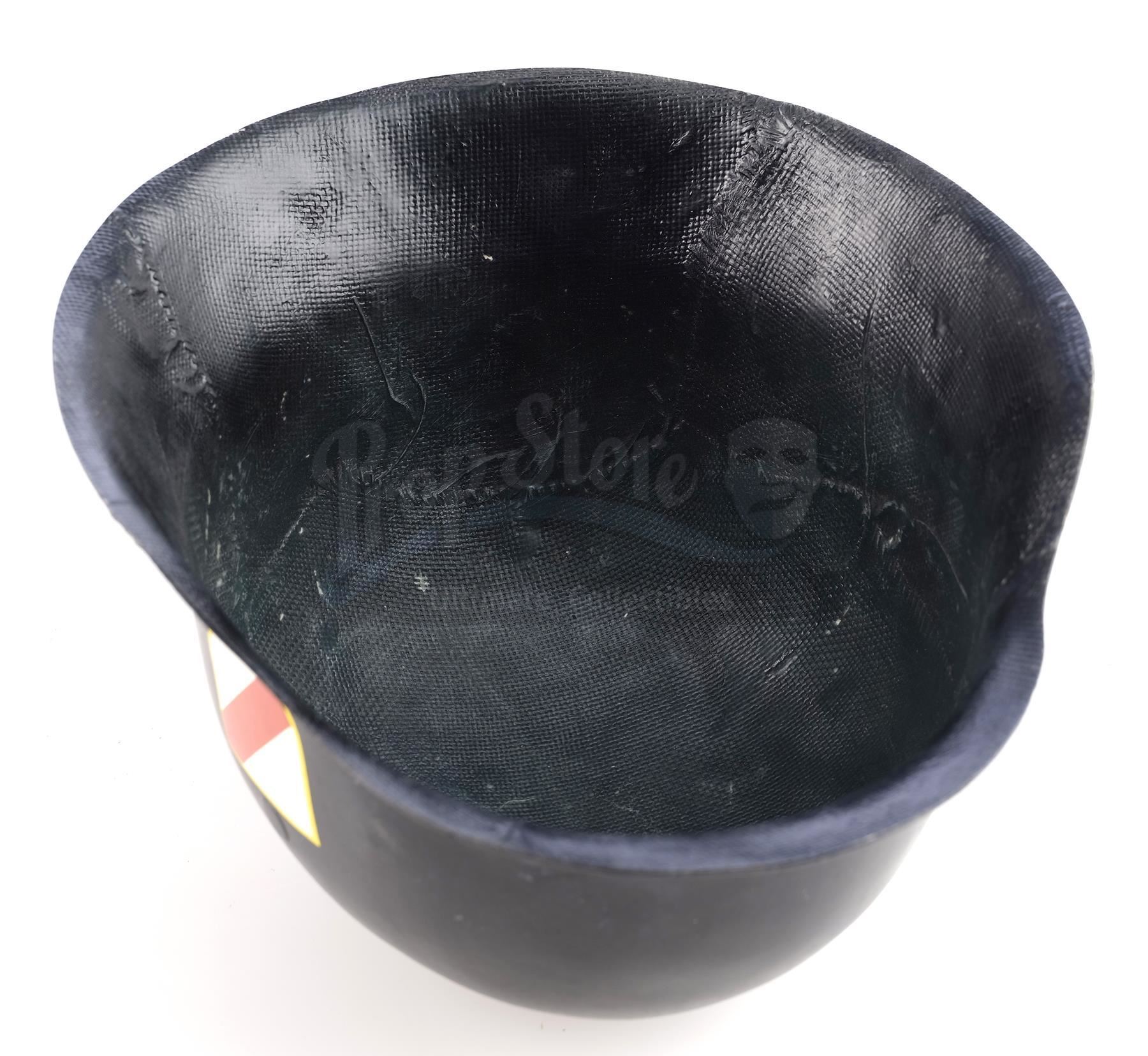 This jet-black helmet is constructed from fiberglass, rather than the usual vacuformed plastic, suggesting it may have been created for a stunt performer or dummy. It features two red and white striped shield Nazi emblem stickers on the sides and "FH" carved into the interior. The helmet exhibits some fractures to the interior and wear along its edges, but it remains in good overall condition.