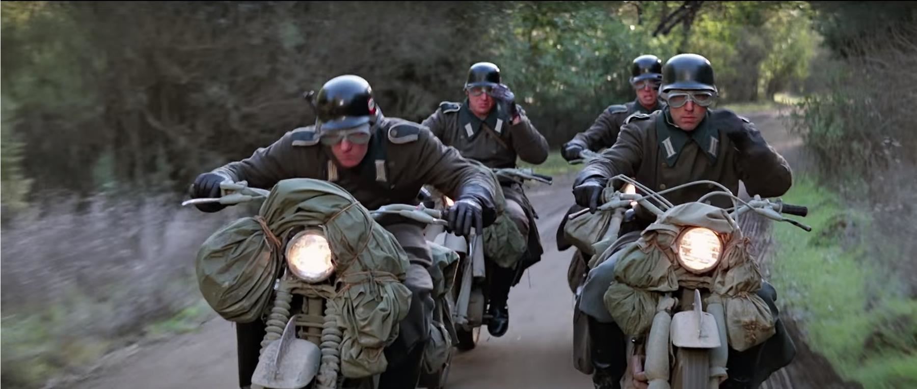 A Nazi helmet from Steven Spielberg's action-adventure sequel Indiana Jones and the Last Crusade. Nazis chased Indiana Jones (Harrison Ford) and his father Henry by motorcycle when they escaped from Castle Brunwald.