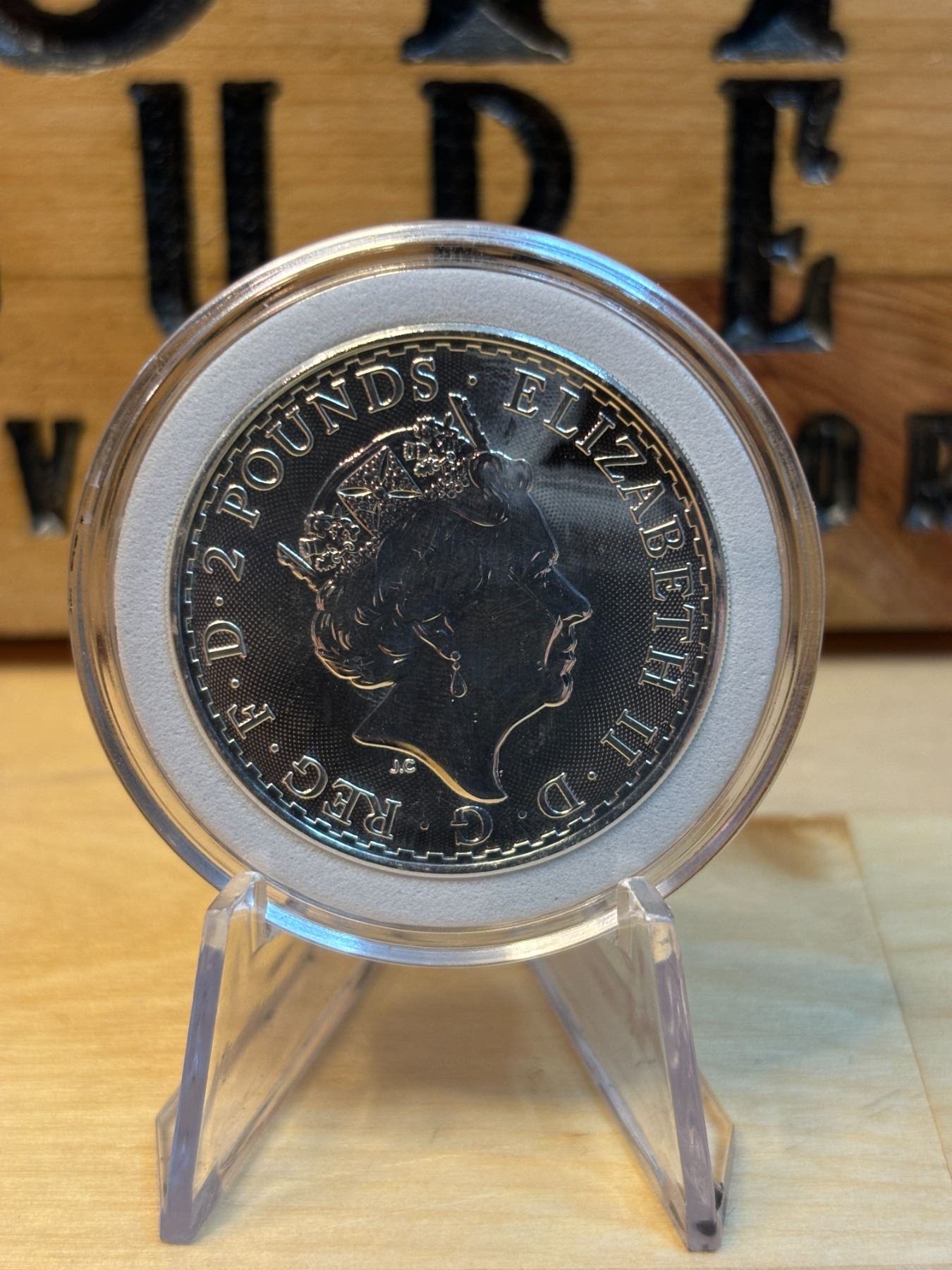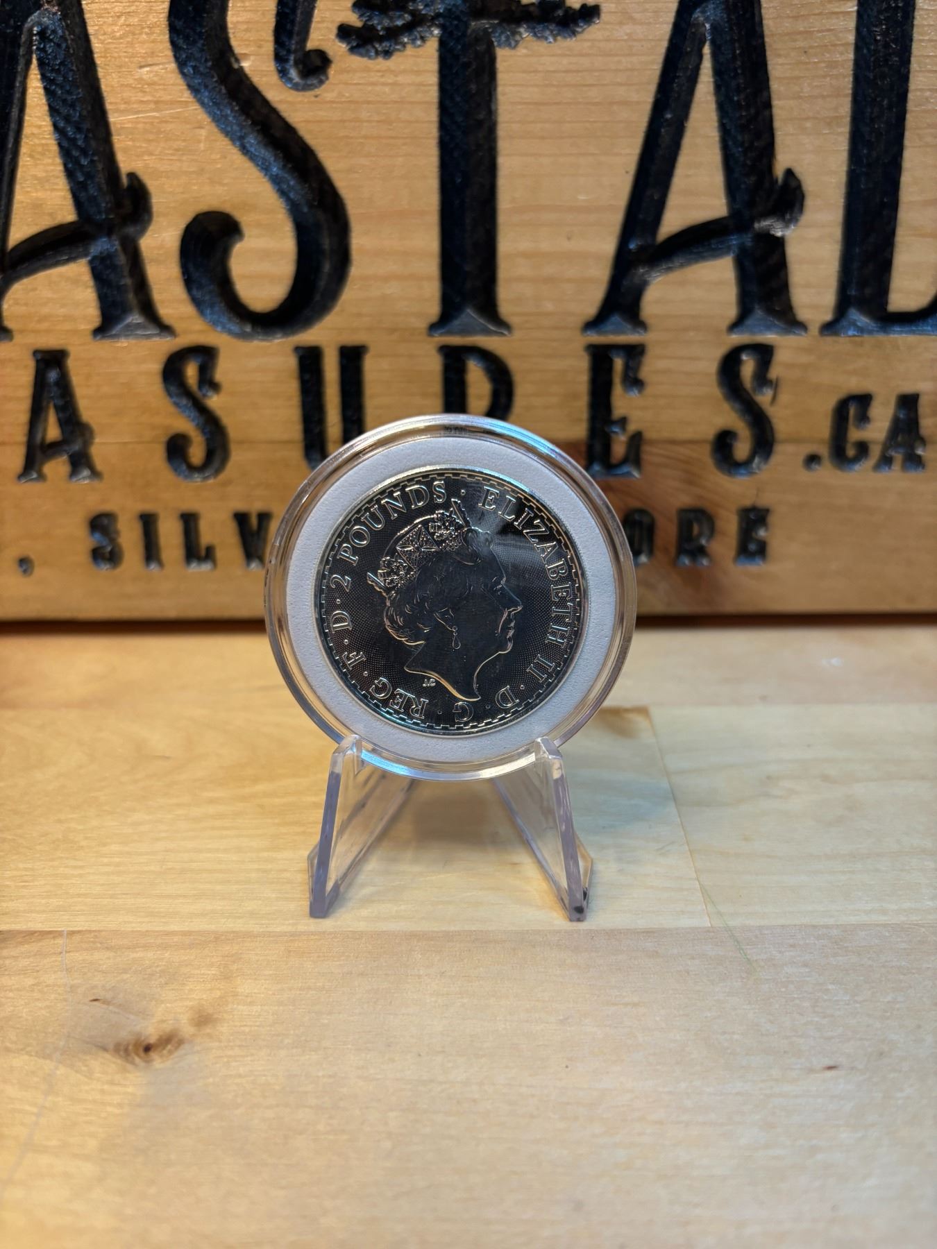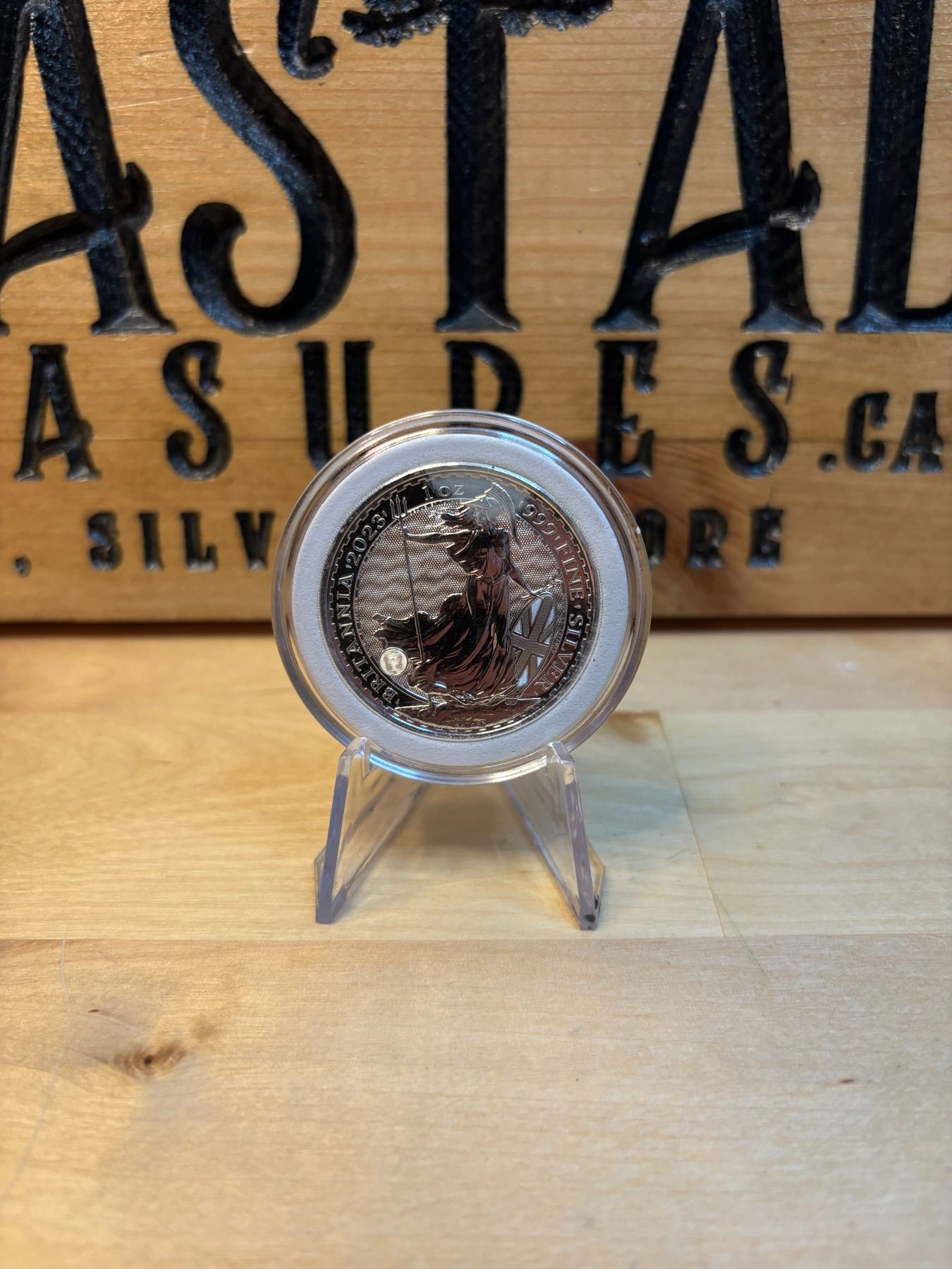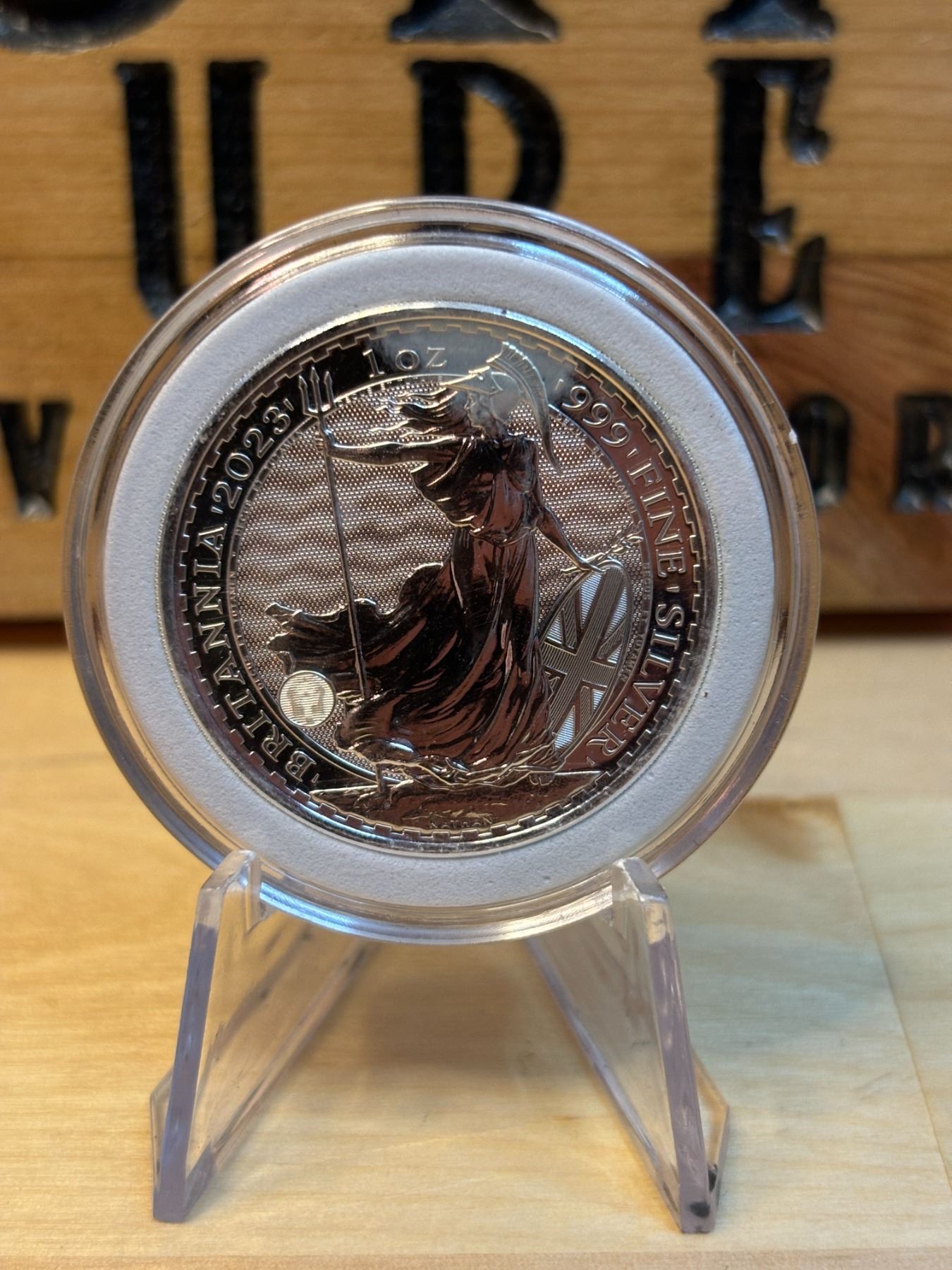 The 1 oz Britannia 2023 Silver Coin is part of the popular Britannia series, produced by the Royal Mint. It contains 1 ounce of .999 fine silver and features the iconic image of Britannia, symbolizing strength and resilience. The 2023 edition features an updated design with enhanced security features, such as a new background wave pattern and a holographic foil that changes in the light, making it more difficult to counterfeit. The coin is widely sought after by collectors and investors alike.