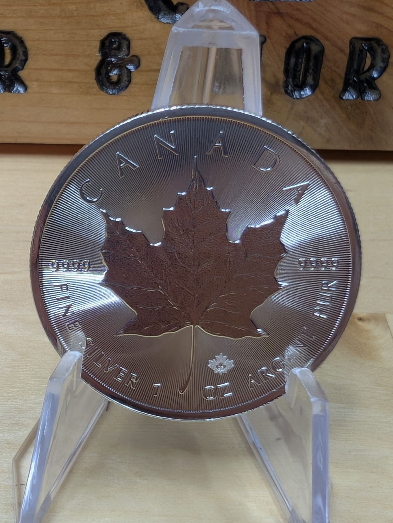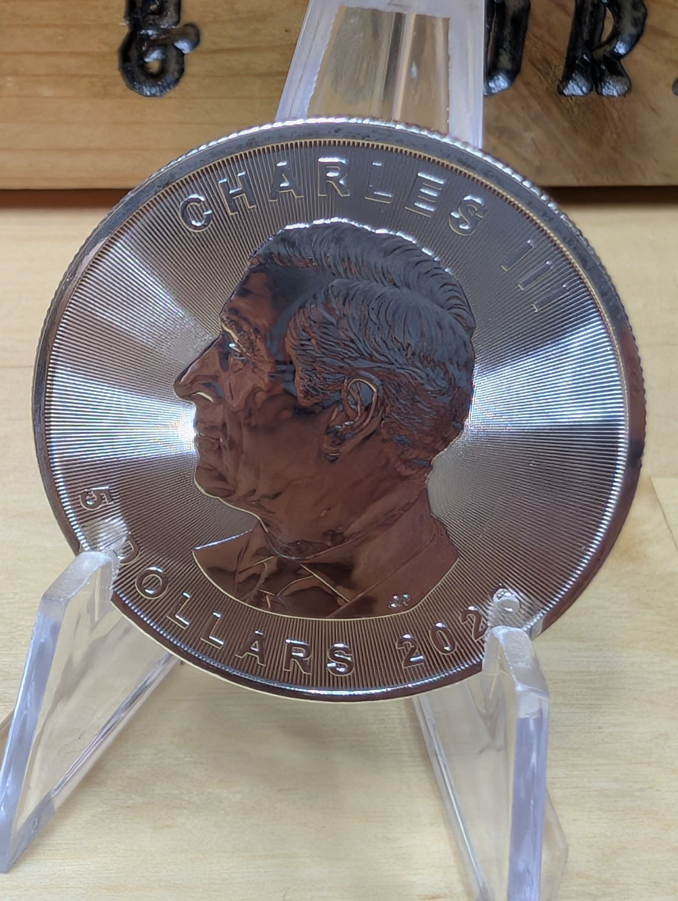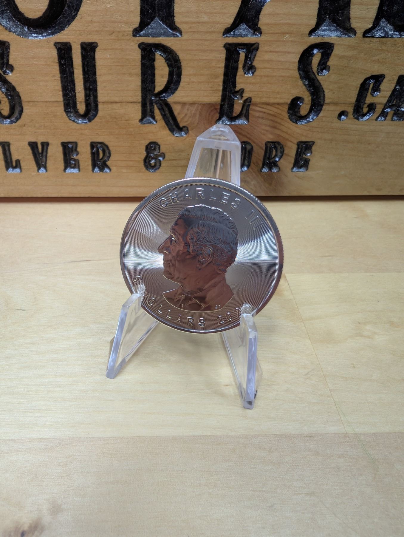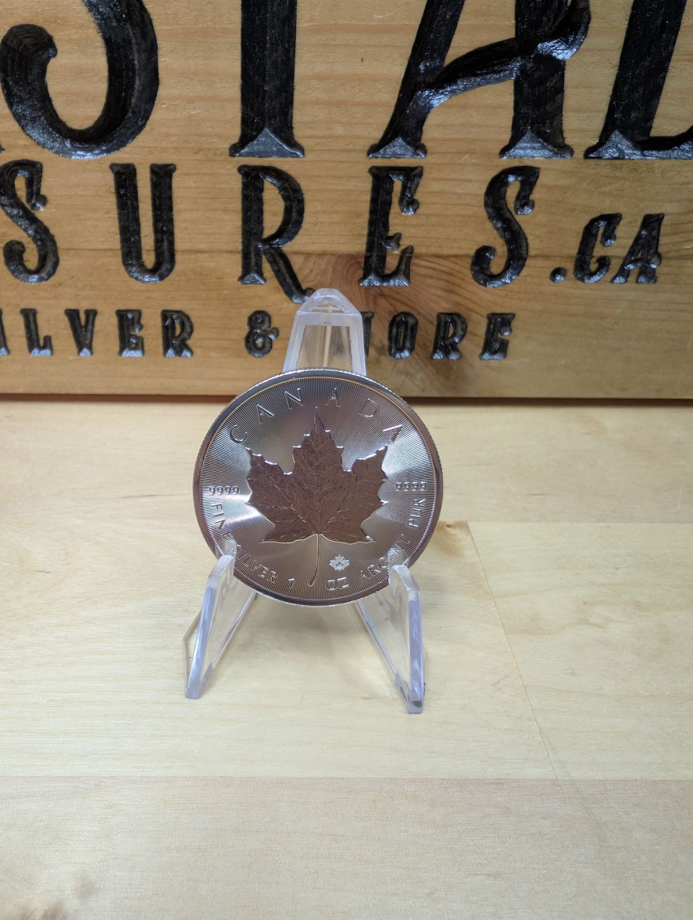 The 2025 1 oz Canadian Silver Maple Leaf is a .9999 fine silver coin minted by the Royal Canadian Mint. It features the iconic maple leaf on the reverse, with enhanced security features such as micro-engraved radial lines. The obverse showcases the new effigy of King Charles III, following the passing of Queen Elizabeth II, along with a face value of 5 Canadian dollars. Known for its high purity and craftsmanship, this coin is a favorite among collectors and investors.