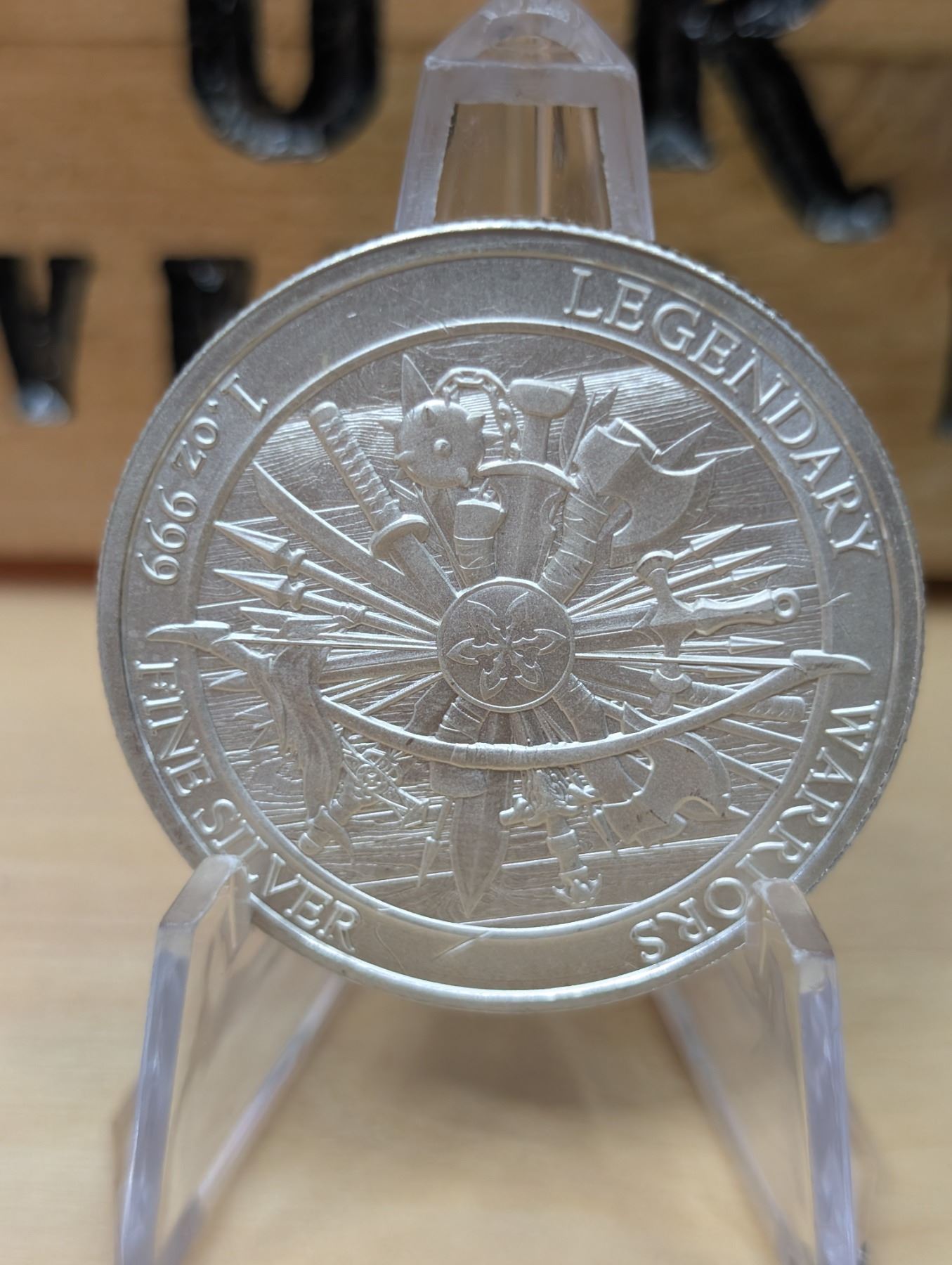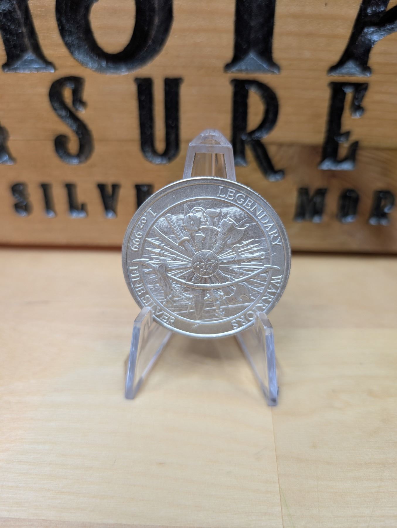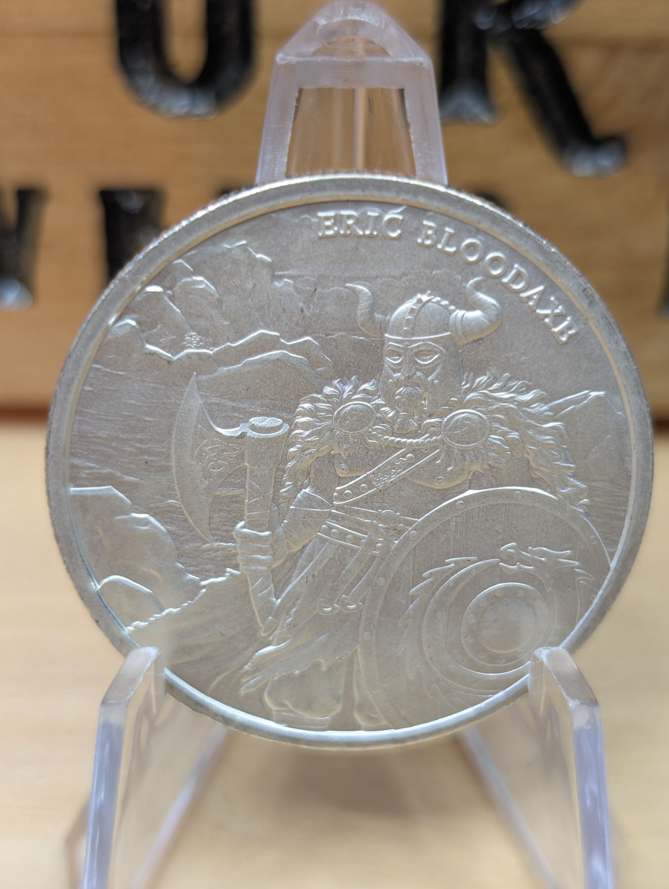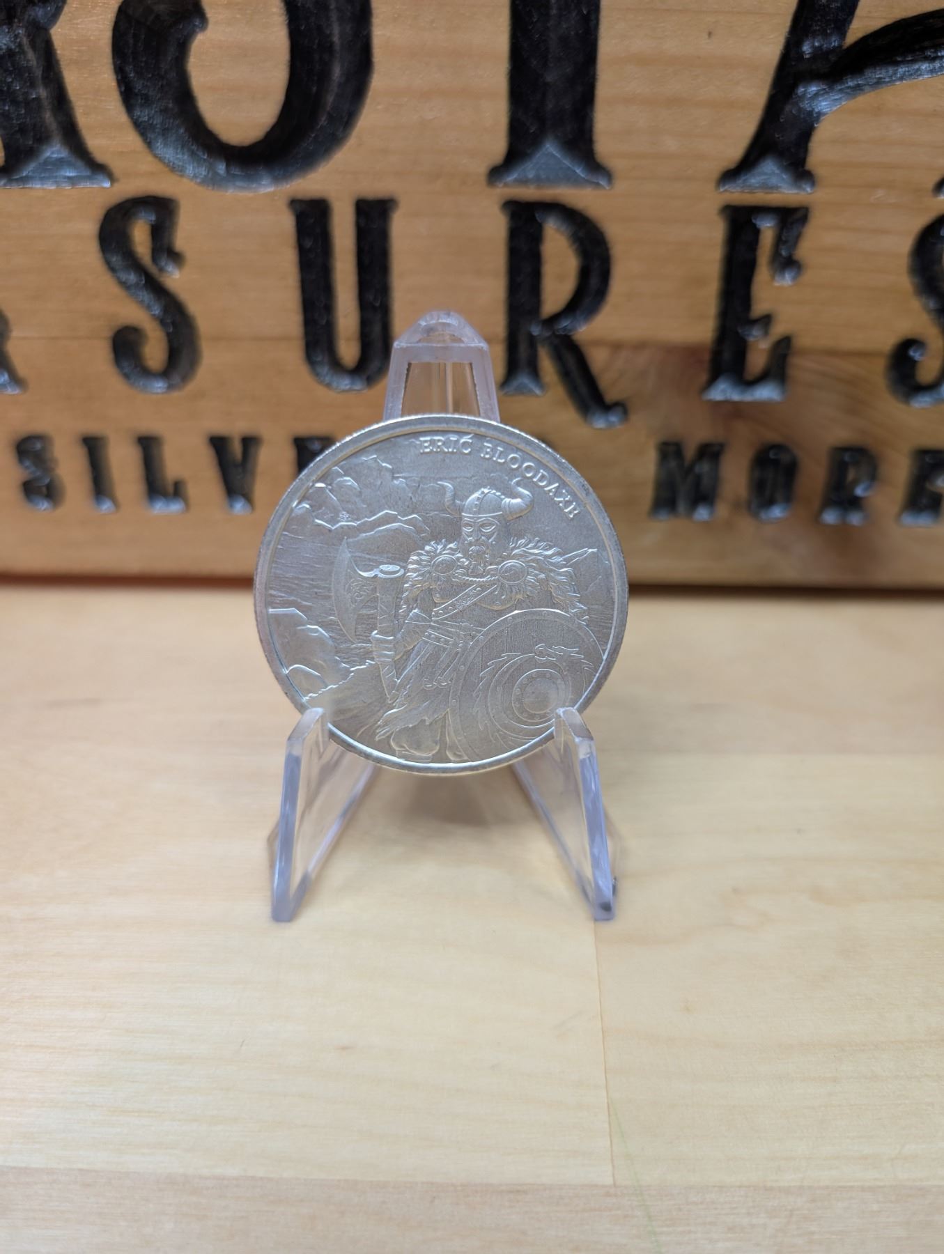 The 1 oz Eric Bloodaxe Legendary Warriors silver round is made from .999 fine silver and features a design of Eric Bloodaxe, a Viking king known for his warrior legacy. Part of the Legendary Warriors series, this round is popular with collectors due to its historical theme and detailed design. Its value is based on the current silver price and collector demand.