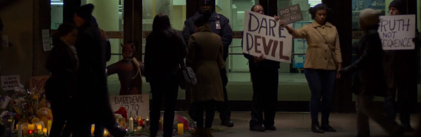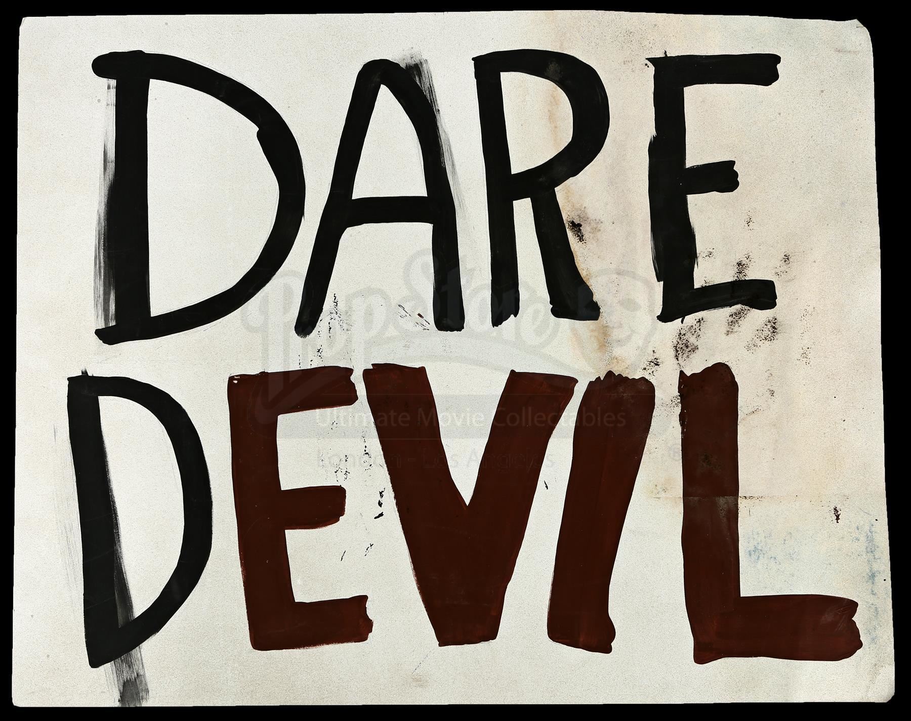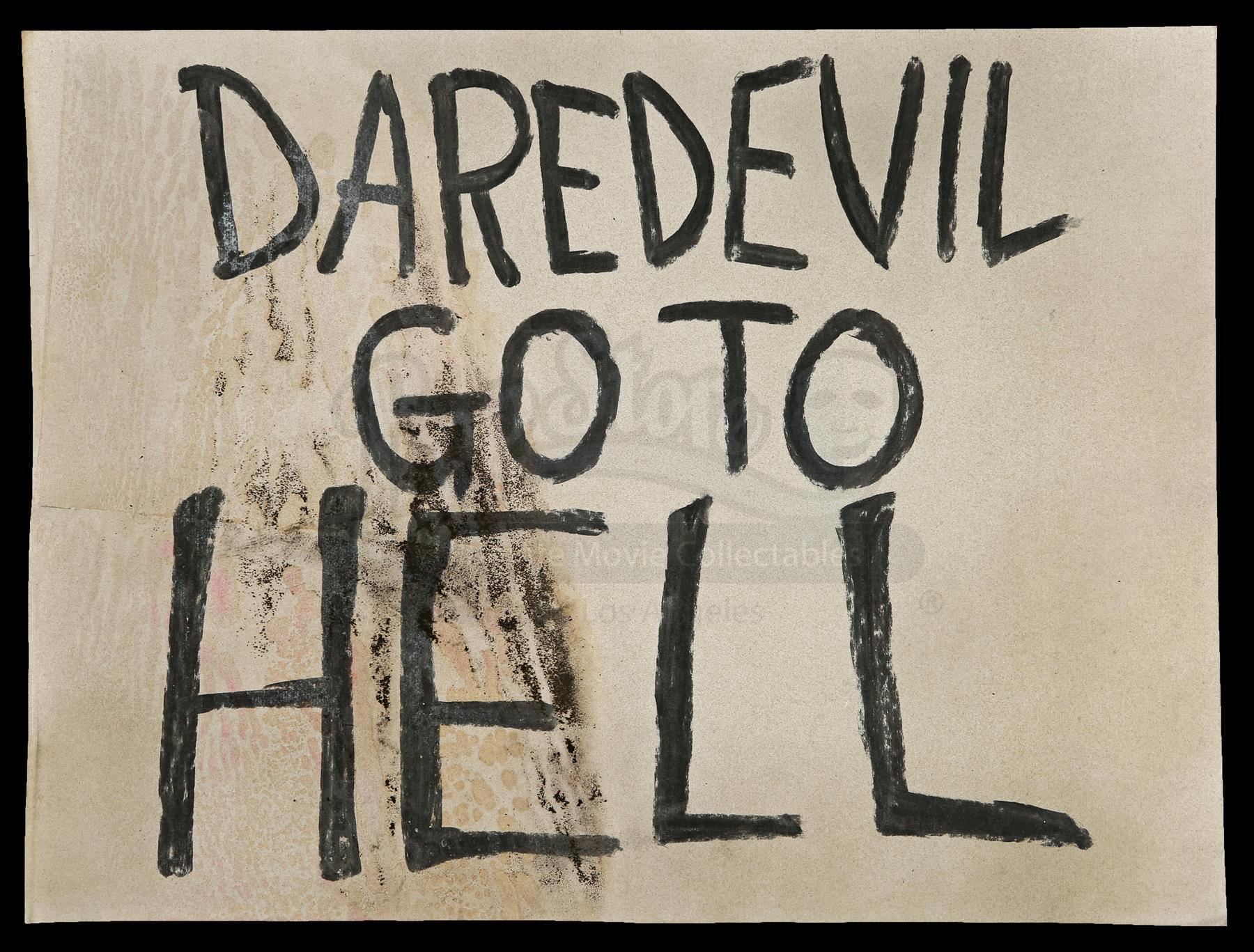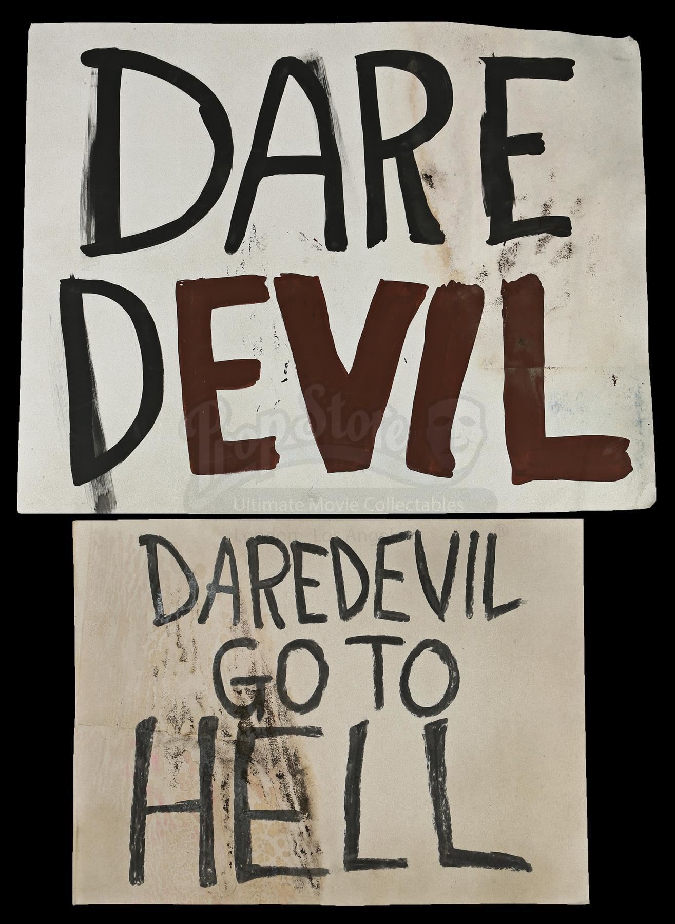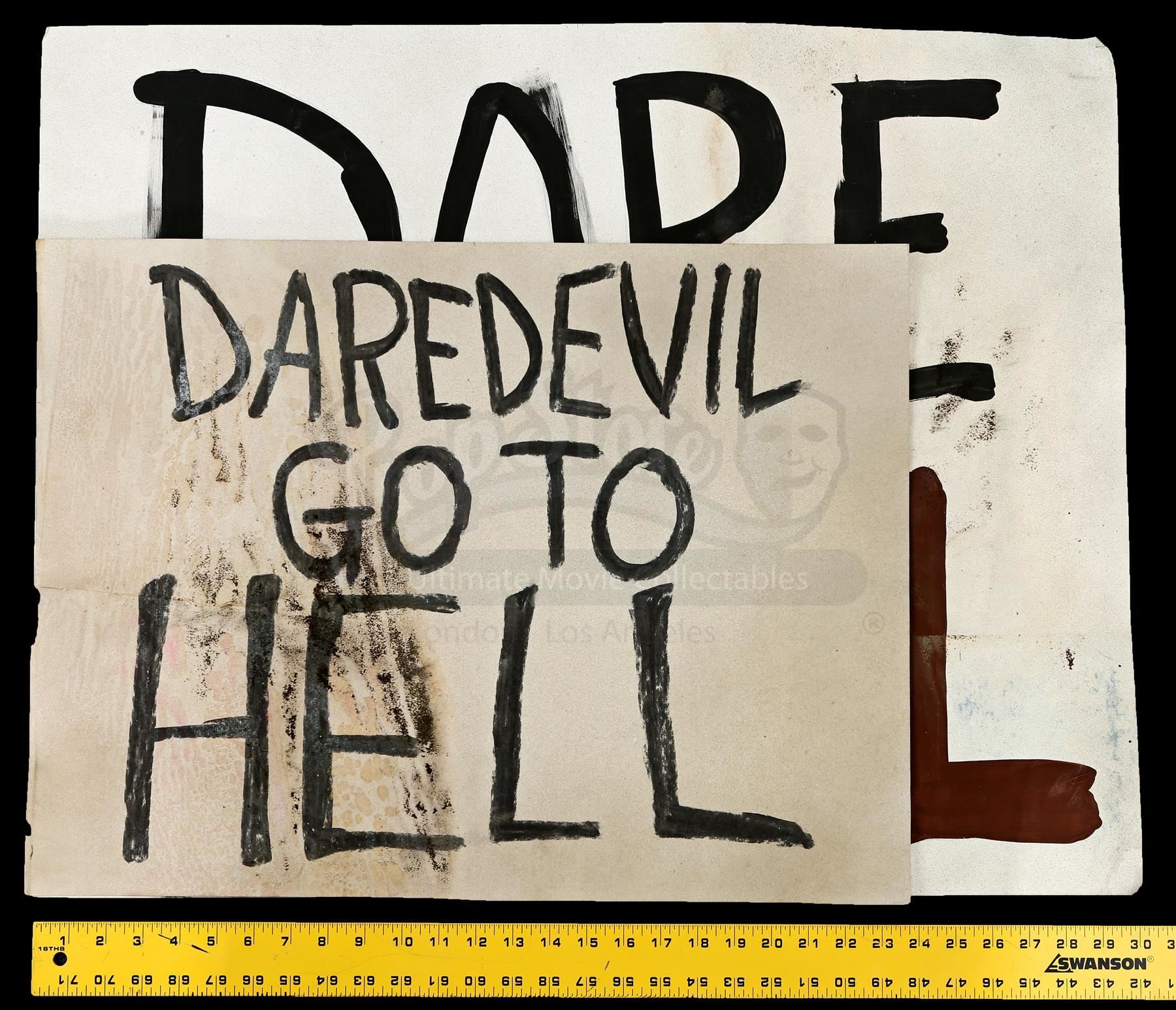 ‘Daredevil Go to Hell’ protest signs from the episode ‘Upstairs/Downstairs’ (308) of Marvel's Daredevil. In the episode, citizens bring signs to protest Daredevil, who was framed for an attack on the New York Bulletin office. This lot consists of two paper protest signs mounted on poster board. They are in fair overall condition with extensive signs of dirt and wear from production on both and detaching from the poster board on one.