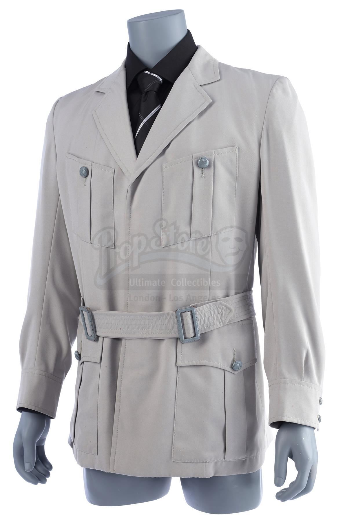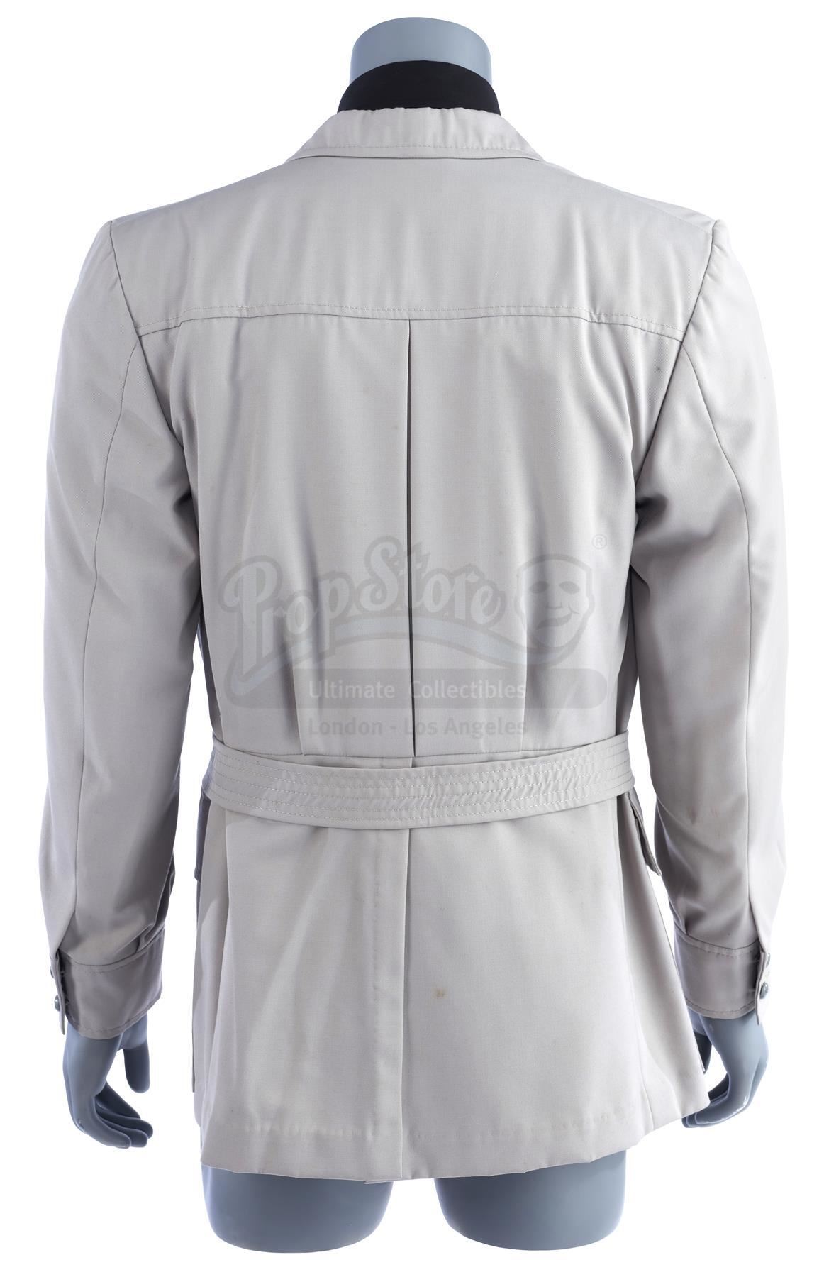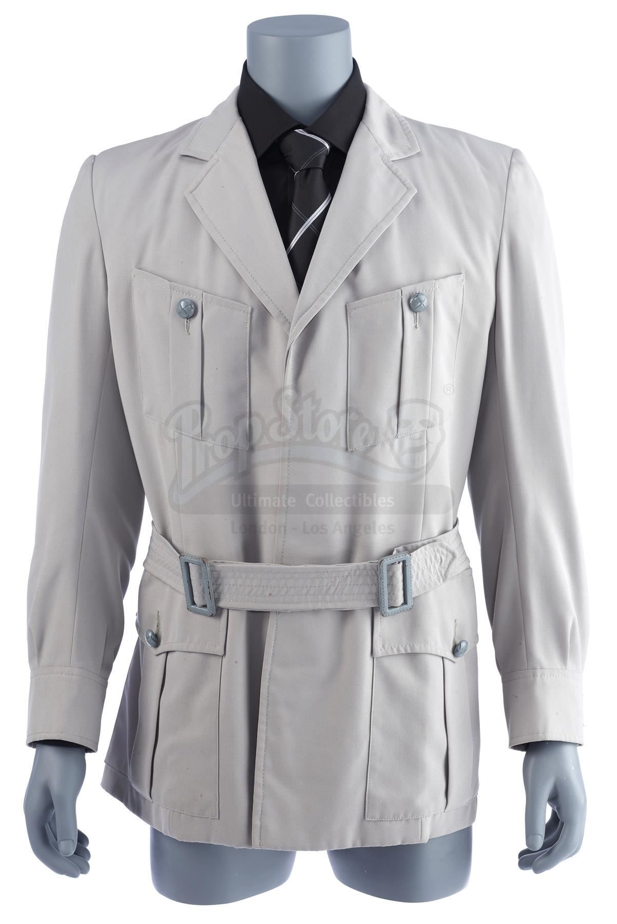 The bespoke gray button-up jacket is made of cotton, features four patch pockets at the front, and includes a belt. Inside the jacket is a hand-stitched production label from Bermans and Nathans that reads "Indiana Jones Julian Glover". Also included for display purposes are a black dress shirt and a silk tie which features gray diagonal stripes. The lot is in good overall condition with minor wear from production and age, including small spot stains to the jacket and wrinkles to the tie where it was previously tied.