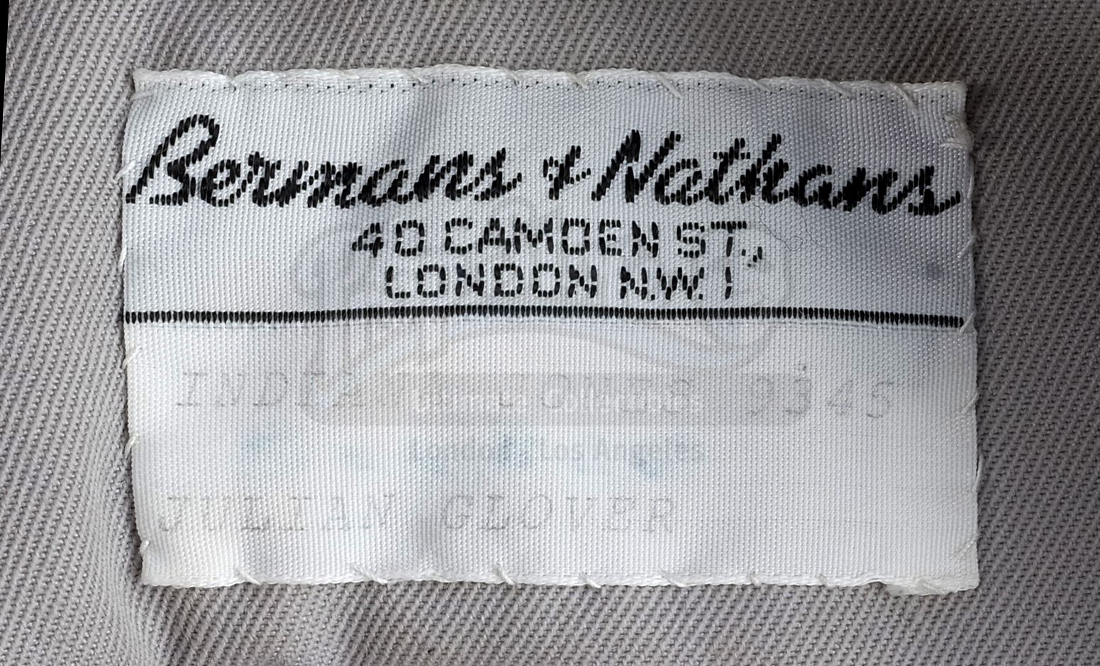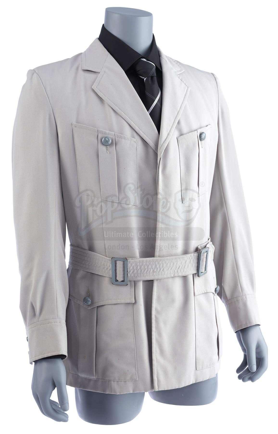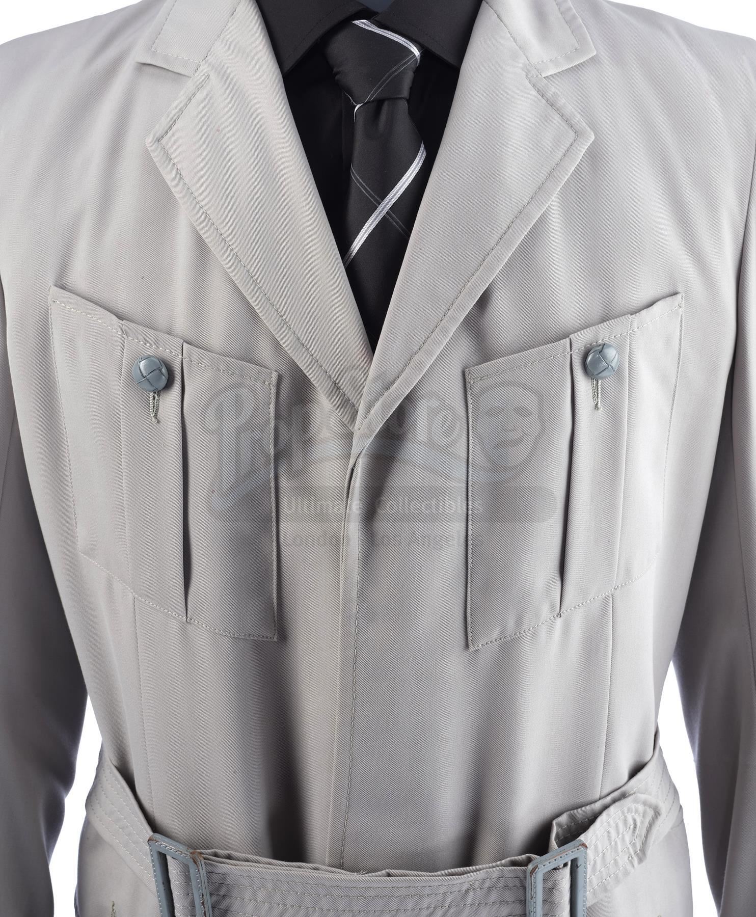 The bespoke gray button-up jacket is made of cotton, features four patch pockets at the front, and includes a belt. Inside the jacket is a hand-stitched production label from Bermans and Nathans that reads "Indiana Jones Julian Glover". Also included for display purposes are a black dress shirt and a silk tie which features gray diagonal stripes. The lot is in good overall condition with minor wear from production and age, including small spot stains to the jacket and wrinkles to the tie where it was previously tied.