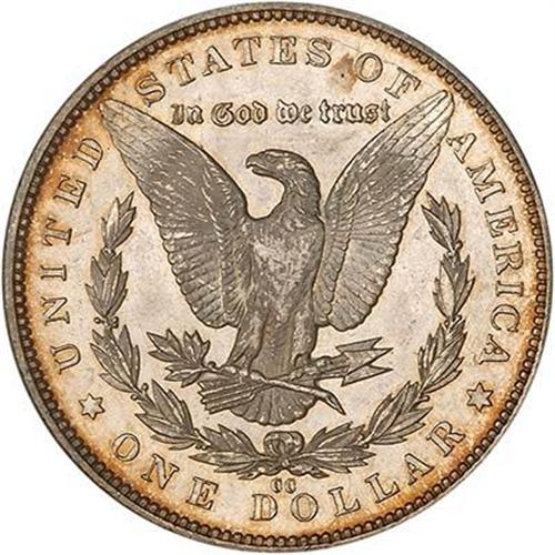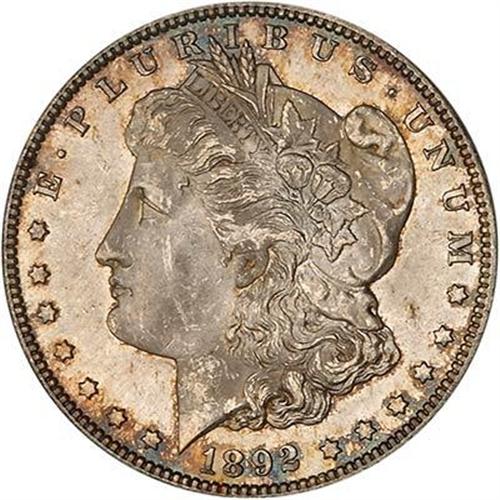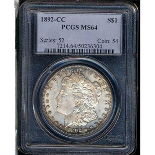 1892-CC Morgan Dollar. While some CC-mint Morgan Dollars (such as the 1882-1884 issues) are readily obtainable at the MS64 grade level, the 1892-CC is not. This is not to say that Mint State examples are unduly rare, but, rather, that most are noticeably bagmarked, some might say downright ugly. With smooth surfaces that are free of singularly distracting blemishes, the present example is among the finest '92-CC Dollars of its grade that we have offered this year. The eye appeal of the beautifully toned surfaces is further enhanced by splashes of reddish amber and blue around the devices at the rims. The sharp strike is also worthy of praise; only the central regions show any softness in the design. (#7214)